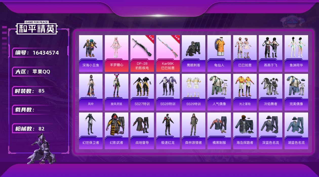 [16434574]【店主推荐捡漏号!可直接换绑】苹果 手Q-1粉装-2特效枪-0载具-1粉色飞行器-24125热力值-8王牌印记-85套装-82枪皮【热门品类】:套装-深海小丑鱼,套装-龟仙人【粉色套装】:角色-羊梦糖心【粉色枪皮等级】:Kar98K-巳巳如意(五级),DP-28-豹影疾电(五级)【粉色枪皮】:Kar98K-巳巳如意,DP-28-豹影疾电【粉色飞行器】:天之羽翼飞行器