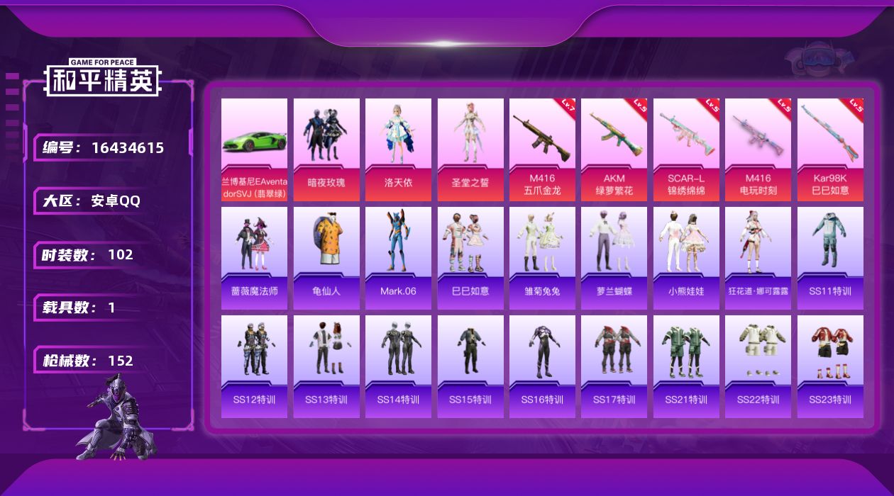 [16434615]【店主推荐捡漏号!可直接换绑】安卓 手Q-3粉装-5特效枪-1载具-0粉色飞行器-47622热力值-4王牌印记-102套装-152枪皮【热门品类】:套装-龟仙人,角色-Mark.06【粉色套装】:粉装-暗夜玫瑰,角色-洛天依,角色-圣堂之誓【粉色枪皮等级】:AKM-绿萝繁花(五级),SCAR-L-锦绣绵绵(五级),M416-五爪金龙(七级),M416-电玩时刻(五级),Kar98K-巳巳如意(五级)【粉色载具】:兰博基尼Aventador SVJ(翡翠绿)【粉色枪皮】:AKM-绿萝繁花,SCAR-L-锦绣绵绵,M416-五爪金龙,M416-电玩时刻,Kar98K-巳巳如意