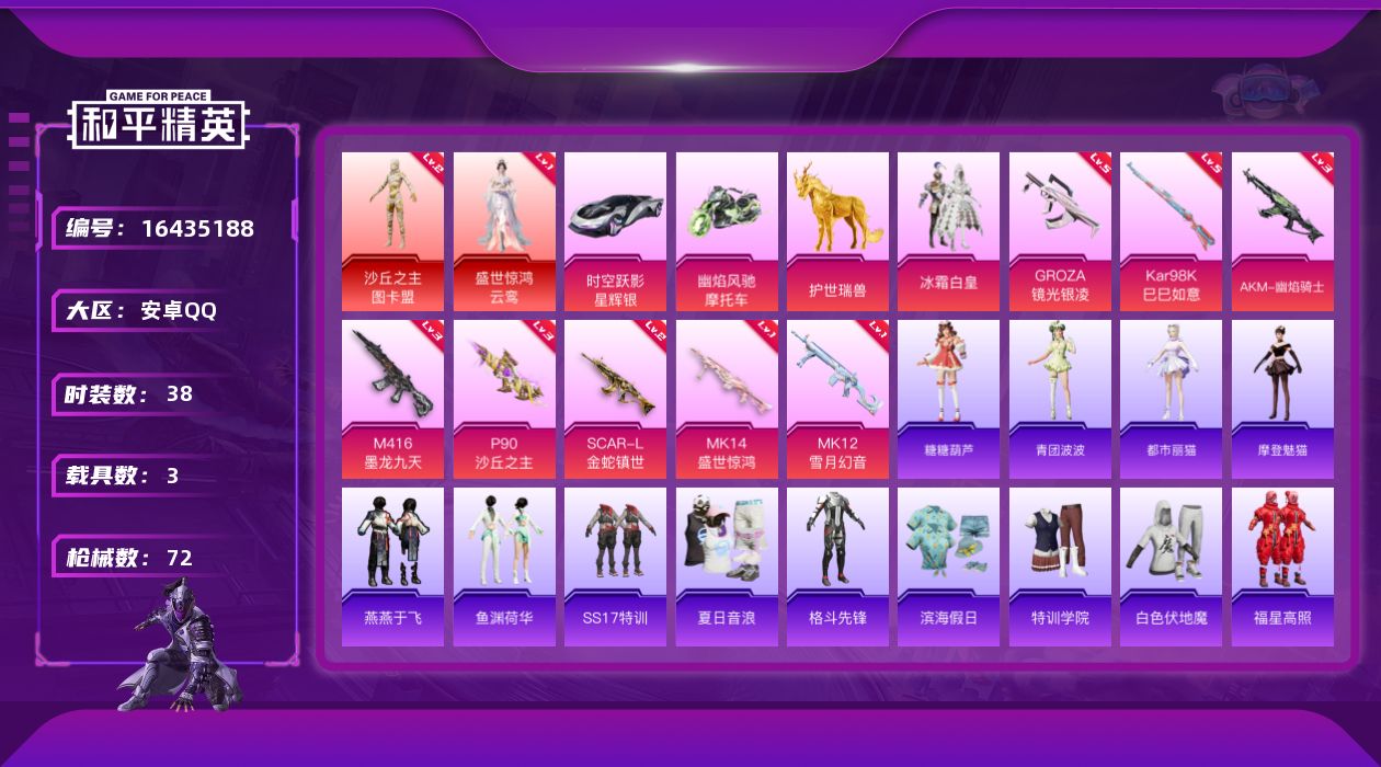[16435188]安卓 手Q-2神装-1粉装-8特效枪-3载具-9粉色飞行器-30986热力值-1王牌印记-38套装-72枪皮 【红色神装等级】:盛世惊鸿-云鸾(一级),沙丘之主-图卡盟(二级) 【红色角色神装】:盛世惊鸿-云鸾,沙丘之主-图卡盟 【粉色套装】:粉装-冰霜白皇 【粉色枪皮等级】:AKM-幽焰骑士(三级),SCAR-L-金蛇镇世(二级),M416-墨龙九天(三级),GROZA-镜光银凌(五级),P90-沙丘之主(三级),Kar98K-巳巳如意(五级),Mk14-盛世惊鸿(一级),MK12-雪月幻音(一级) 【粉色载具】:时空跃影(星辉银),幽焰风驰摩托车,护世瑞兽 【粉色枪皮】:AKM-幽焰骑士,SCAR-L-金蛇镇世,M416-墨龙九天,GROZA-镜光银凌,P90-沙丘之主,Kar98K-巳巳如意,Mk14-盛世惊鸿,MK12-雪月幻音 【粉色飞行器】:酣梦熊熊飞行器,齐天大圣飞行器,沙丘之主天马,镜域双华-灵镜之阶,龙翔九天飞行器,幽焰列车飞行器,凤舞九天飞行器,万象金身飞行器 【粉色降落伞】:暗夜玫瑰降落伞,洛神天依降落伞,百合蜜语降落伞,幽焰骑士降落伞,千金淑猫降落伞,盛世惊鸿降落伞,金蛇镇世降落伞 【稀有套装】:套装-糖糖葫芦,套装-青团波波,角色-都市丽猫,角色-摩登魅猫,套装-燕燕于飞,套装-鱼渊荷华 【稀有枪皮】:M16A4-千金淑猫,SCAR-L-碧影闪光,M416-蓝色火焰,AUG-耀粉歌者,AUG-金蛇镇世,QBZ-彩虹符号,QBZ-飞驰魅影,M762-瑞龙福将,AC-VAL-天降萌叽,Famas-墨龙九天,UZI-炫彩节奏,UZI-盛世惊鸿,UMP45-蓝色火焰,Vector-百合蜜语,汤姆逊-林间仙鹿,汤姆逊-耀粉歌者,野牛-沙丘之主,P90-飞驰魅影,P90-金蛇镇世,Kar98K-飞驰魅影,M24-樱桃泡泡,AWM-盛世惊鸿,Mini14-耀粉歌者,Win94-瑞龙福将,SLR-墨龙九天,MK20-H-樱桃泡泡,MK12-金蛇镇世,S686-红色方程式,S686-千金淑猫,S1897-飞驰魅影,S12K-瑞龙福将,M249-沙丘之主,DP-28-彩虹符号,MG3-镜域双华,MG3-瑞龙福将,蝎式手枪-千金淑猫,大砍刀-盛世惊鸿,破片手榴弹-巳巳如意 【其他套装】:套装-SS17特训,套装-夏日音浪,套装-格斗先锋,套装-滨海假日,套装-