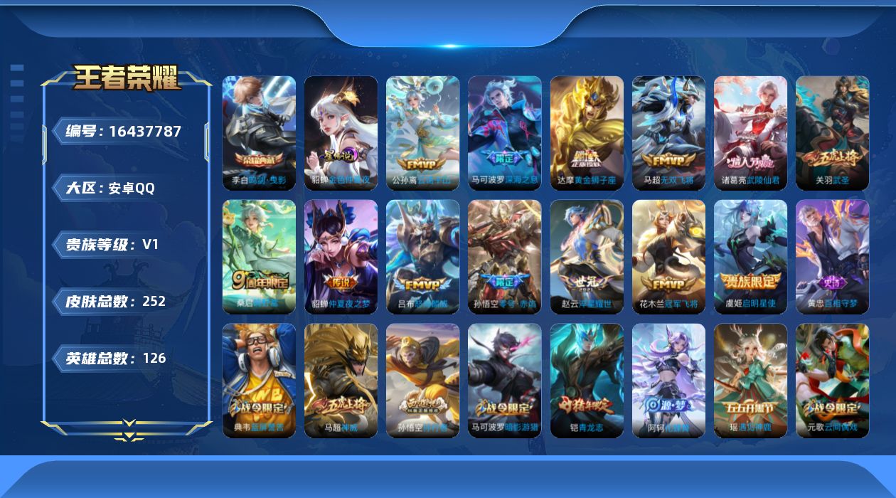 - [14514885]【店主推荐捡漏号!可直接换绑】,安卓Q-V9-最强王者段位-127英雄-428皮肤-4典藏皮肤-1珍品传说-33传说-118史诗 【英雄全皮】:高渐离全皮,阿轲全皮,扁鹊全皮,宫本武藏全皮,达摩全皮,刘邦全皮,孙权全皮,橘右京全皮,刘备全皮,苍全皮,鬼谷子全皮,百里守约全皮,狂铁全皮,蒙恬全皮,司空震全皮,戈娅全皮,空空儿全皮,影全皮 【荣耀典藏】:夏侯惇无限飓风号,诸葛亮星域神启,铠银白咏叹调,韩信弑枪猎影 【珍品传说】:宫本武藏黑崎一护 【传说皮肤】:后羿神树通天,司空震愿照山河定,澜愿照九州拓,云缨幻光神枪,裴擒虎祥瑞亨通,桑启鸣野蒿,铠冥王哈迪斯,孙策乘龙淬吴钩,澜逐花归海,宫本武藏惊梅引,张飞百相守梦,曜山海苍雷引,李信山海炽霜斩,李白诗剑行,百里守约碎云,橘右京枫霜尽,马可波罗深海之息,马超无双飞将,孙策挚爱之约,镜炽阳神光,虞姬启明星使,曜云鹰飞将,刘备时之恋人,貂蝉猫影幻舞,虞姬云霓雀翎,达摩黄金狮子座,花木兰冠军飞将,后羿黄金射手座,孙尚香末日机甲,宫本武藏地狱之眼,孙悟空地狱火,吕布天魔缭乱,狄仁杰超时空战士 【限定皮肤】:白起狰,铠冥王哈迪斯,暃埋骨钱,大乔绒语心约,姜子牙天穹之誓,杨戬破阵退雄兵,狄仁杰阴阳师,虞姬凯尔特女王,赵云皇家上将,赵云引擎之心,墨子神迹守卫,嬴政白昼王子,庄周高山流水,高渐离死亡摇滚,高渐离玩趣恶龙,阿轲迷踪丽影,钟无艳超时空战士,孙膑妖精王,扁鹊炼金王,扁鹊奇幻香踪,白起夜都怪侠,芈月幻夜卜梦,吕布天魔缭乱,吕布猎兽之王,吕布御风骁将,周瑜赤莲之焰,元歌无心,夏侯惇朔风刀,甄姬落雪兰心,曹操烛龙,典韦穷奇,典韦蓝屏警告,马可波罗暗影游猎,马可波罗深海之息,狄仁杰魔术师,狄仁杰万华元夜,达摩星际陆战队,达摩沙漠行僧,项羽海滩派对,老夫子醍醐杖,老夫子航海奇遇记,程咬金演武夺筹,刘邦夺宝奇兵,王昭君午后时光,兰陵王驯魔猎人,兰陵王金庭之子,橘右京枫霜尽,孙悟空至尊宝,牛魔御旌,刘备百相守梦,张飞百相守梦,李元芳银河之约,李元芳云中旅人,虞姬启明星使,钟馗驱傩正仪,杨玉环遇见飞天,女娲朔望之晖,干将莫邪真爱魔法,雅典娜黎明之约,太乙真人饕餮,鬼谷子原初探秘者,鬼谷子五谷丰年,黄忠火炮绅士,铠青龙志,苏烈千军破阵,百里玄策原初追逐者,百里守约朱雀志,弈星混沌棋,梦奇顽趣,沈梦溪星空之诺,沈梦溪大漠名商,明世隐疑决卦,明世