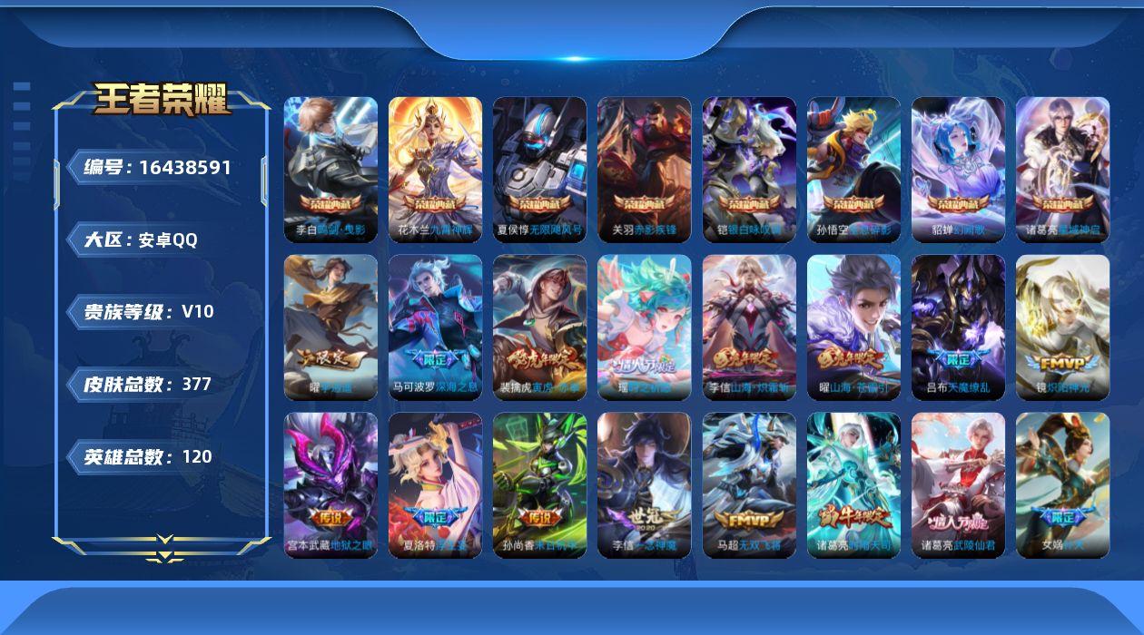 - [10836254]V10 6典藏 3无双 2珍品传说 54传说 126英雄 463皮肤 典藏英雄武则天 可修改实名 荣耀水晶:神鉴启示录,弑枪猎影(韩信典藏),银白咏叹调(倪克斯侍卫),幻阙歌(貂蝉典藏),无限飓风号(高达),倪克斯神谕(宇宙婆娘) 无双皮:小乔时之魔女(小乔无双),真我赫兹(瑶)(瑶无双),青丘·九尾(妲己无双) 珍品传说:酷洛米之心,大耳狗之梦 传说皮:李逍遥,游龙清影(小青龙),永恒水手月亮,大乔-时之奇旅,黄金射手座,黄金白羊座,零号·赤焰,地狱火,仲夏夜之梦(大飞蛾),地狱之眼,末日机甲-孙尚香(绿蚂蚱),云霓雀翎,一念神魔,冠军飞将,久胜战神,猫影幻舞,云鹰飞将(小将军),炽阳神光,音你心动-小乔,音你心动-周瑜,胖达荣荣,时之恋人-刘备(电焊工),绛天战甲(鸡嘴战神),花朝如约(花篮子),燃星之曲,浮生妄,青丘·九尾,百相守梦(张飞),追逃游戏(安琪拉),追逃游戏(亚瑟),电玩·雷克斯,鹤羽星尊,灼幽烈阳,妄想实况,妄想奇谈,鹤归松栖(云缨),遇见神鼓,鲁班七号-时之奇旅,夜礼服假面,艾琳觅芳踪 珍宝阁皮:胡桃夹子,蔷薇恋人 限定皮:愿照·福禄聚(蔡文姬年限),鸣野蒿,至尊宝,白虎志(电光耗子),凤求凰(白切鸡),凤凰于飞,太华(伽罗年限),武陵仙君(小桃花),时之彼端,魔法小厨娘,白晶晶,时雨天司(水龙头),神威(电光马子),飞衡(韩信年限),玄嵩(庄周年限),瑞麟志(木兰年限),至美·乘鲤谣,至美·化雀舞,影龙天霄,遇见飞天,五谷丰年,青龙志(铠年限),冰锋战神,幽恒(沐浴露),武圣,天狼运算者,游园惊梦,梁祝,御风骁将(吕布年限),天狼狩猎者,龙胆,逐梦之星,烈魂,岱宗(典韦年限),天狼溯光者,虎魄,逐梦之音,奔雷神使(牛魔年限),祈雪灵祝(雪兔子),天狼绘梦者,李小龙,逐梦之光,玄武志(苏烈年限),朱雀志(守约年限),如梦令-嫦娥,如梦令-后羿,奇迹圣诞,大圣娶亲,天魔缭乱,冰霜恋舞曲,云端筑梦师,乒乒小将,蜜橘之夏,神奇女侠,时之祈愿-瑶(瑶传限),深海之息(深海大菠萝),神器·万象笔 史诗皮:星界战将,化蝶舞,鸭鸭历险记-刘禅,灵蛊蚀心,龙之律动,藏狐·褐绒,石田雨龙,蔬乡物语(鲁班七号),遇见神鹿,紫霞仙子,苍穹之光,电玩小子(小书包),白龙吟,黄金分割率,特工魅影,千年之狐,电玩·爆裂旋风,百相守梦(关羽),百相守梦(刘备),匿光破解者,