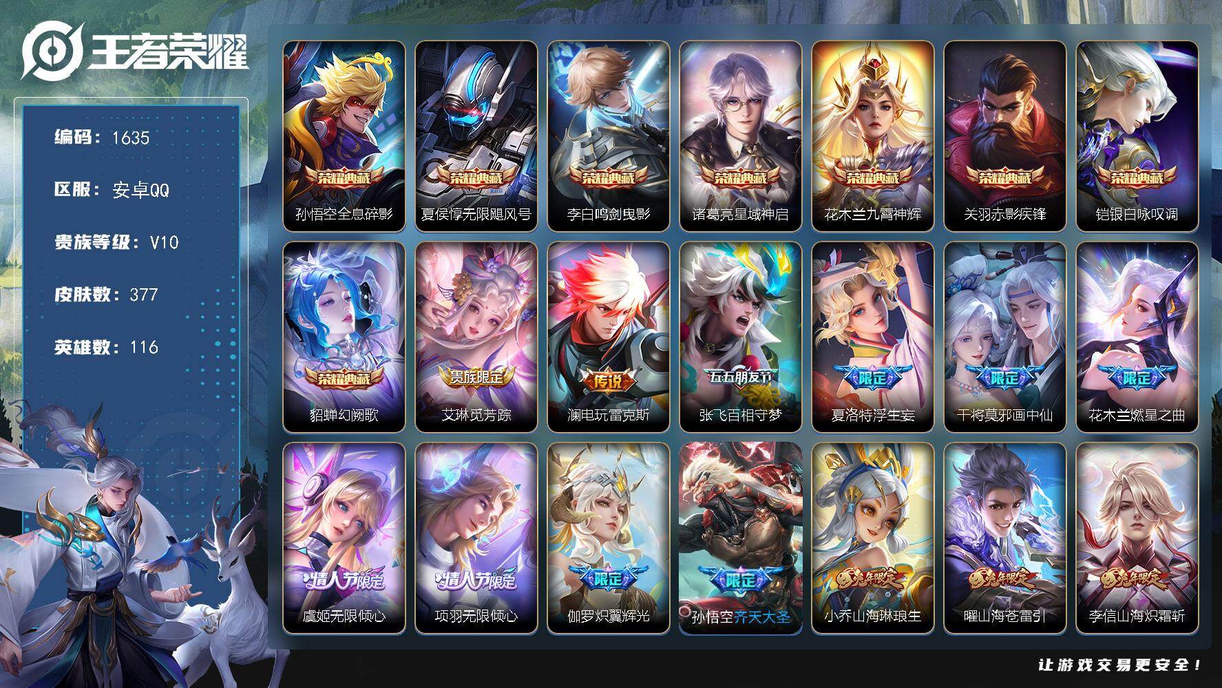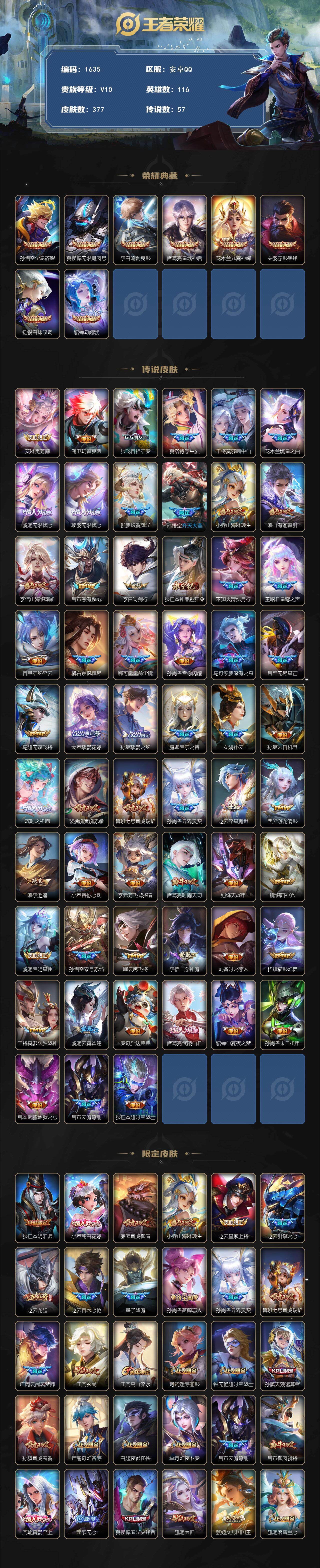 [16438591]【1635】安卓Q-V10-至尊星耀IV段位-116英雄-377皮肤-8典藏皮肤-57传说-136史诗