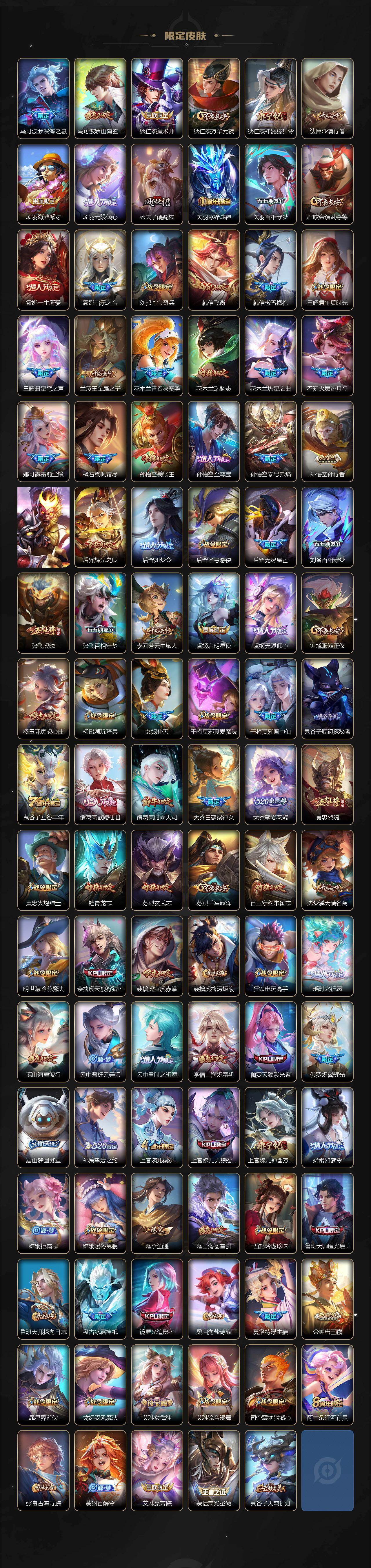 【限定皮肤】:狄仁杰阴阳师,小乔纯白花嫁,廉颇寅虎御盾,小乔山海琳琅生,赵云皇家上将,赵云引擎之心,赵云龙胆,赵云百木心枪,墨子降魔,孙尚香蔷薇恋人,孙尚香异界灵契,鲁班七号寅虎瑞焰,庄周云端筑梦师,庄周玄嵩,庄周高山流水,阿轲迷踪丽影,钟无艳超时空战士,孙膑天狼运算者,孙膑寅虎展翼,扁鹊奇幻香踪,白起夜都怪侠,芈月幻夜卜梦,吕布天魔缭乱,吕布御风骁将,周瑜真爱至上,元歌无心,夏侯惇匿光决锋者,甄姬幽恒,甄姬女儿国国王,甄姬落雪兰心,马可波罗深海之息,马可波罗山海玄木吟,狄仁杰魔术师,狄仁杰万华元夜,狄仁杰神器狴犴令,达摩沙漠行僧,项羽海滩派对,项羽无限倾心,老夫子醍醐杖,关羽冰锋战神,关羽百相守梦,程咬金演武夺筹,露娜一生所爱,露娜启示之音,刘邦夺宝奇兵,韩信飞衡,韩信傲雪梅枪,王昭君午后时光,王昭君星穹之声,兰陵王金庭之子,花木兰青春决赛季,花木兰瑞麟志,花木兰燃星之曲,不知火舞绯月行,娜可露露前尘镜,橘右