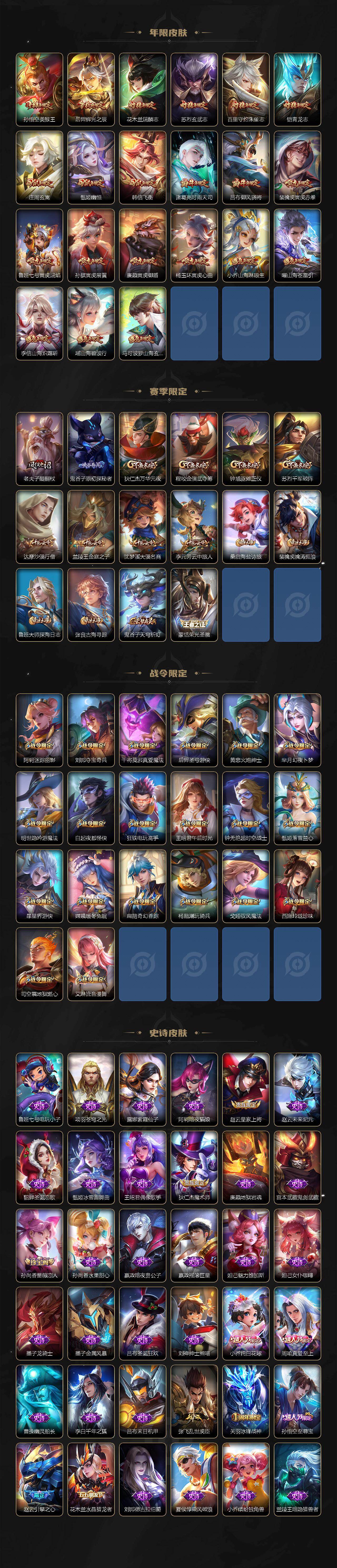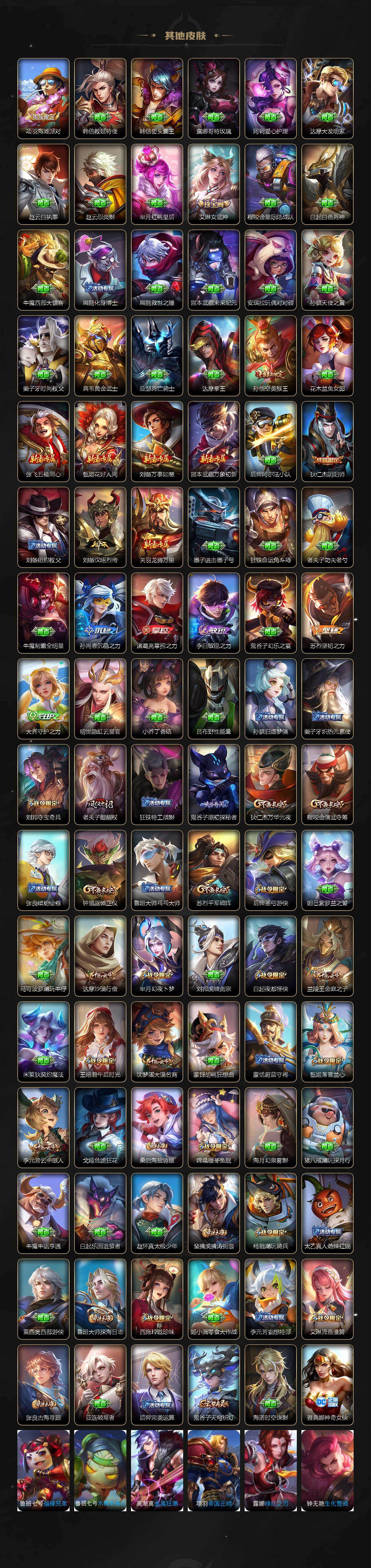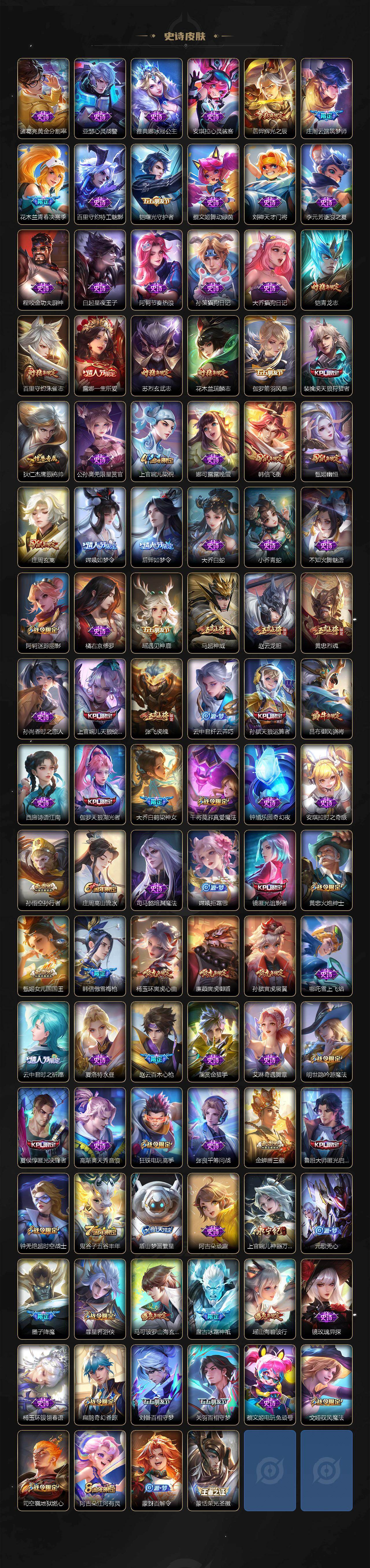 关羽冰锋战神,上官婉儿梁祝,吕布御风骁将,诸葛亮时雨天司,赵云龙胆,黄忠烈魂,张飞虎魄,马超神威,后羿辉光之辰,庄周玄嵩,甄姬幽恒,韩信飞衡,裴擒虎天狼狩猎者,孙膑天狼运算者,上官婉儿天狼绘梦者,伽罗天狼溯光者,铠青龙志,花木兰瑞麟志,苏烈玄武志,百里守约朱雀志,小乔纯白花嫁,周瑜真爱至上,露娜一生所爱,后羿如梦令,嫦娥如梦令,孙悟空至尊宝,雅典娜神奇女侠,花木兰青春决赛季,赵云引擎之心,孙悟空美猴王,庄周云端筑梦师,大乔白鹤梁神女,廉颇寅虎·御盾,孙尚香异界灵契,孙悟空孙行者,甄姬女儿国国王,镜匿光追影者,韩信傲雪梅枪,鲁班七号寅虎·瑞焰,孙膑寅虎·展翼,杨玉环寅虎·心曲,裴擒虎寅虎·赤拳,云中君时之祈愿,瑶时之祈愿,女娲补天,赵云百木心枪,露娜启示之音,夏侯惇匿光决锋者,后羿无尽星芒,马可波罗深海之息,金蝉唐三藏,娜可露露前尘镜,橘右京枫霜尽,鲁班大师匿光启智者,王昭君星穹之声,不知火舞绯月行,上官婉儿神器·万象笔,盾山梦圆繁星,墨子降魔,李白诗剑行,马可波罗山海·玄木吟,盘古冰霜神祇,瑶山海·碧波行