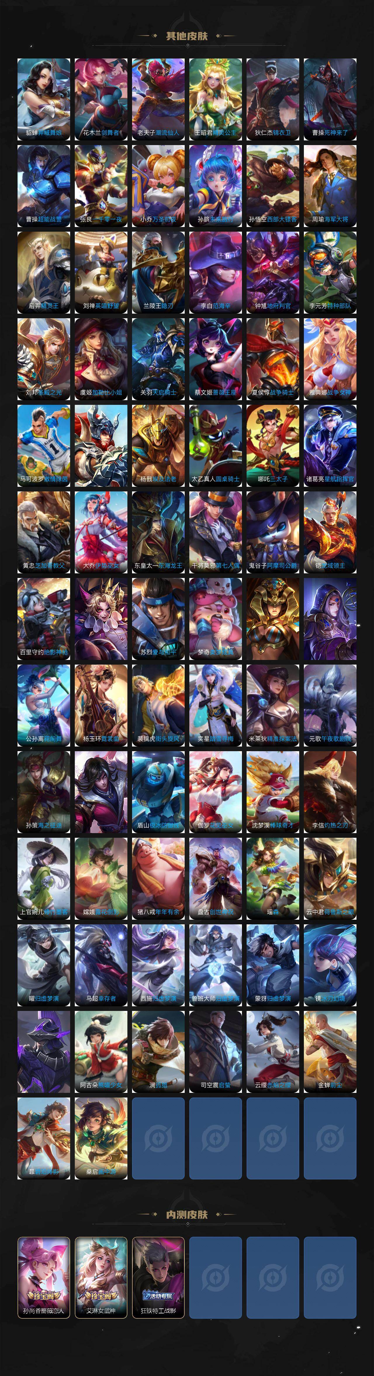 小乔青蛇,大乔白蛇,瑶遇见神鹿,娜可露露晚萤,伽罗箭羽风息,李元芳逐浪之夏,不知火舞魅语,公孙离无限星赏官,大乔猫狗日记,孙策猫狗日记,阿轲节奏热浪,露娜紫霞仙子,诸葛亮黄金分割率,王昭君偶像歌手,项羽苍穹之光,孙尚香时之恋人,阿轲暗夜猫娘,雅典娜冰冠公主,吕布末日机甲,鲁班七号电玩小子,橘右京修罗,墨子龙骑士,嬴政摇滚巨星,刘禅绅士熊喵,刘禅天才门将,白起星夜王子,安琪拉心灵骇客,安琪拉时之奇旅,程咬金功夫厨神,刘邦德古拉伯爵,兰陵王暗隐猎兽者,曹操幽灵船长,宫本武藏鬼剑武藏,司马懿暗渊魔法,亚瑟心灵战警,钟馗乐园奇幻夜,蔡文姬舞动绿茵,廉颇地狱岩魂,西施诗语江南,小乔缤纷独角兽,夏侯惇乘风破浪,花木兰水晶猎龙者,铠曙光守护者,墨子金属风暴,吕布圣诞狂欢,貂蝉圣诞恋歌,百里守约特工魅影,嬴政暗夜贵公子,嫦娥拒霜思,李白千年之狐,哪吒雪上飞焰,夏洛特永昼,澜赏金猎手,艾琳奇遇舞章,高渐离天秀·音浪,张良千筹问战,阿古朵顽趣,镜玫瑰异探,杨玉环银翎春语,刘备百相守梦,关羽百相守梦,蔡文姬电玩·兔顽号,蒙犽百解令