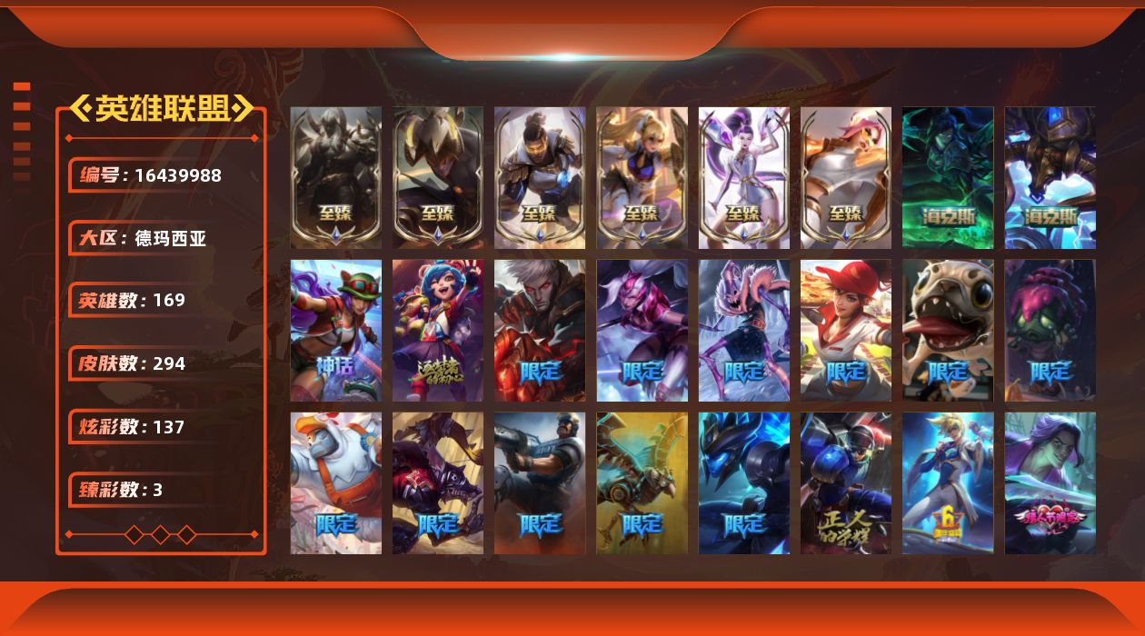 [16439988]未定级段位-169英雄-294皮肤-137炫彩-0终极-10神话-47限定-31传说-77史诗