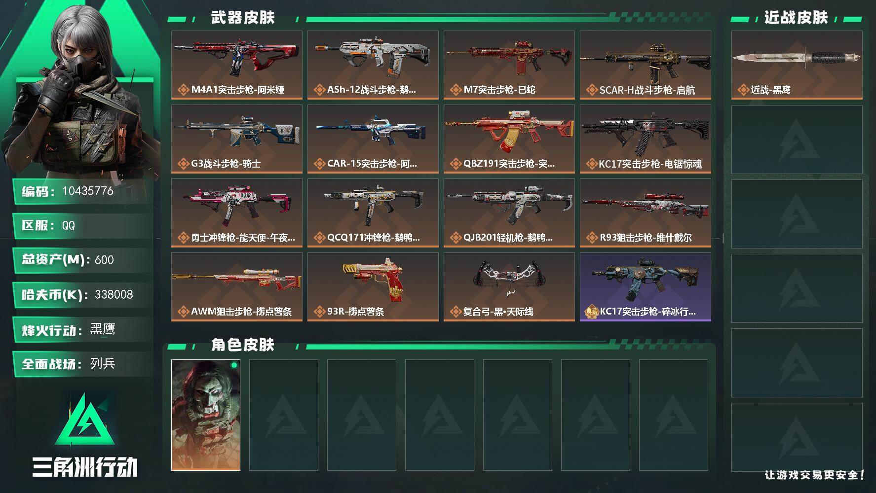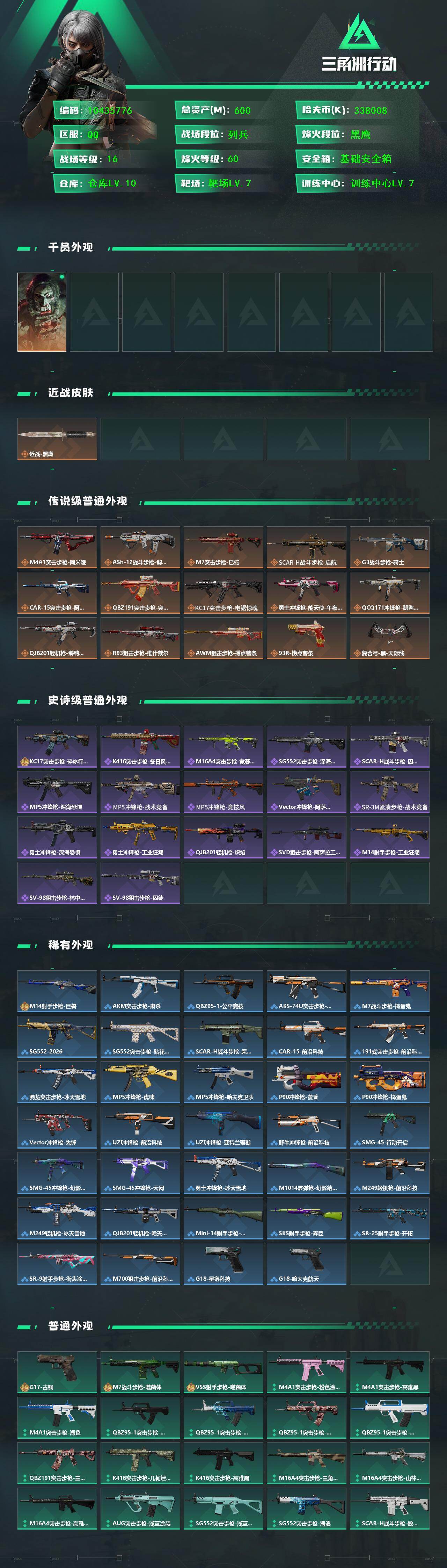 [16440213]【10435776】600m总资产-338008k哈伏币-60烽火等级-黑鹰-16战场等级-列兵 【干员外观】:红狼-电锯惊魂 【近战皮肤】:近战-黑鹰 【传说外观】:M4A1突击步枪-阿米娅,ASh-12战斗步枪-鹅鸭杀,M7战斗步枪-巳蛇,SCAR-H战斗步枪-启航,G3战斗步枪-骑士,CAR-15突击步枪-阿米娅,腾龙突击步枪-捞点薯条,KC17突击步枪-电锯惊魂,勇士冲锋枪-能天使-午夜邮差,QCQ171冲锋枪-鹅鸭杀,QJB201轻机枪-鹅鸭杀,R93狙击步枪-维什戴尔,AWM狙击步枪-捞点薯条,93R-捞点薯条,复合弓-黑·天际线 【史诗外观】:KC17突击步枪-碎冰行动,K416突击步枪-冬日风情,M16A4突击步枪-竞赛选手,SG552突击步枪-深海恐惧,SCAR-H战斗步枪-囚徒,MP5冲锋枪-深海恐惧,MP5冲锋枪-战术竞备,MP5冲锋枪-竞技风,Vector冲锋枪-阿萨拉文明,SR-3M紧凑突击步枪-战术竞备,勇士冲锋枪-深海恐惧,勇士冲锋枪-工业狂潮,QJB201轻机枪-炽焰,SVD狙击步枪-阿萨拉工艺,M14射手步枪-工业狂潮,SV-98狙击步枪-林中猎手,SV-98狙击步枪-囚徒 【稀有外观】:M14射手步枪-巨兽,AKM突击步枪-肃杀,QBZ95-1突击步枪-公平竞技,AKS-74U突击步枪-前沿科技,M7战斗步枪-捣蛋鬼,SG552突击步枪-2026,SG552突击步枪-贴花艺术,SCAR-H战斗步枪-荣耀列队,CAR-15突击步枪-前沿科技,腾龙突击步枪-前沿科技,腾龙突击步枪-冰天雪地,MP5冲锋枪-虎啸,MP5冲锋枪-哈夫克卫队,P90冲锋枪-黄昏,P90冲锋枪-捣蛋鬼,Vector冲锋枪-先锋,UZI冲锋枪-前沿科技,UZI冲锋枪-亚特兰蒂斯,野牛冲锋枪-前沿科技,SMG-45-行动开启,SMG-45冲锋枪-幻影结构,SMG-45冲锋枪-天网,勇士冲锋枪-冰天雪地,M1014霰弹枪-幻影结构,M249轻机枪-前沿科技,M249轻机枪-冰天雪地,QJB201轻机枪-哈夫克卫队,Mini-14射手步枪-荣耀列队,SKS射手步枪-弄臣,SR-25射手步枪-开拓,SR-9射手步枪-街头涂鸦,M700狙击步枪-前沿科技,G18-星链科技,G18-哈夫克航天 【普通外观】:G17-古铜*2,M7战斗步枪-噬菌体,VSS射手步枪-噬菌体,