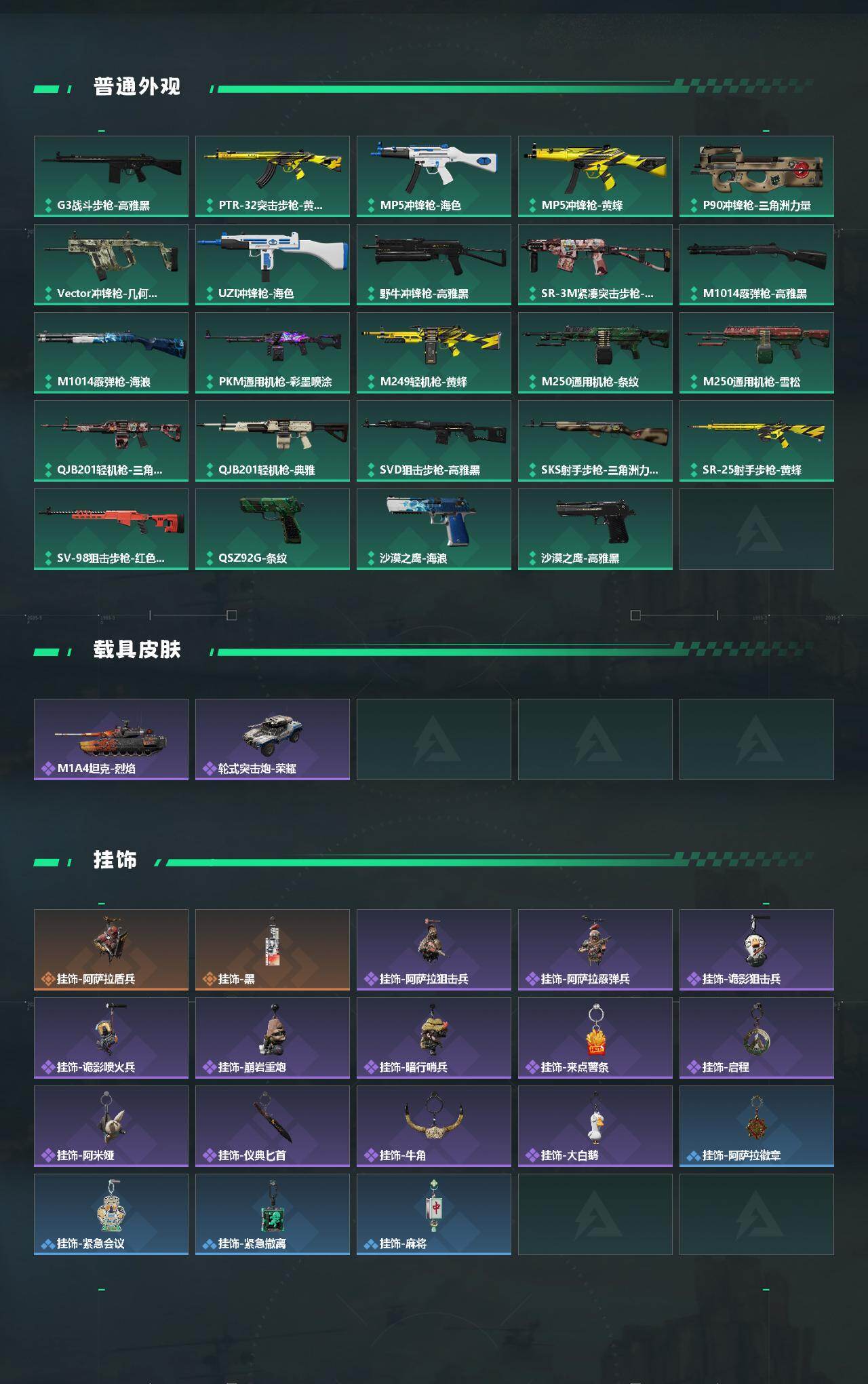 【稀有外观】:M14射手步枪-巨兽,AKM突击步枪-肃杀,QBZ95-1突击步枪-公平竞技,AKS-74U突击步枪-前沿科技,M7战斗步枪-捣蛋鬼,SG552突击步枪-2026,SG552突击步枪-贴花艺术,SCAR-H战斗步枪-荣耀列队,CAR-15突击步枪-前沿科技,腾龙突击步枪-前沿科技,腾龙突击步枪-冰天雪地,MP5冲锋枪-虎啸,MP5冲锋枪-哈夫克卫队,P90冲锋枪-黄昏,P90冲锋枪-捣蛋鬼,Vector冲锋枪-先锋,UZI冲锋枪-前沿科技,UZI冲锋枪-亚特兰蒂斯,野牛冲锋枪-前沿科技,SMG-45-行动开启,SMG-45冲锋枪-幻影结构,SMG-45冲锋枪-天网,勇士冲锋枪-冰天雪地,M1014霰弹枪-幻影结构,M249轻机枪-前沿科技,M249轻机枪-冰天雪地,QJB201轻机枪-哈夫克卫队,Mini-14射手步枪-荣耀列队,SKS射手步枪-弄臣,SR-25射手步枪-开拓,SR-9射手步枪-街头涂鸦,M700狙击步枪-前沿科技,G18-星链科技,G18-哈夫克航天
