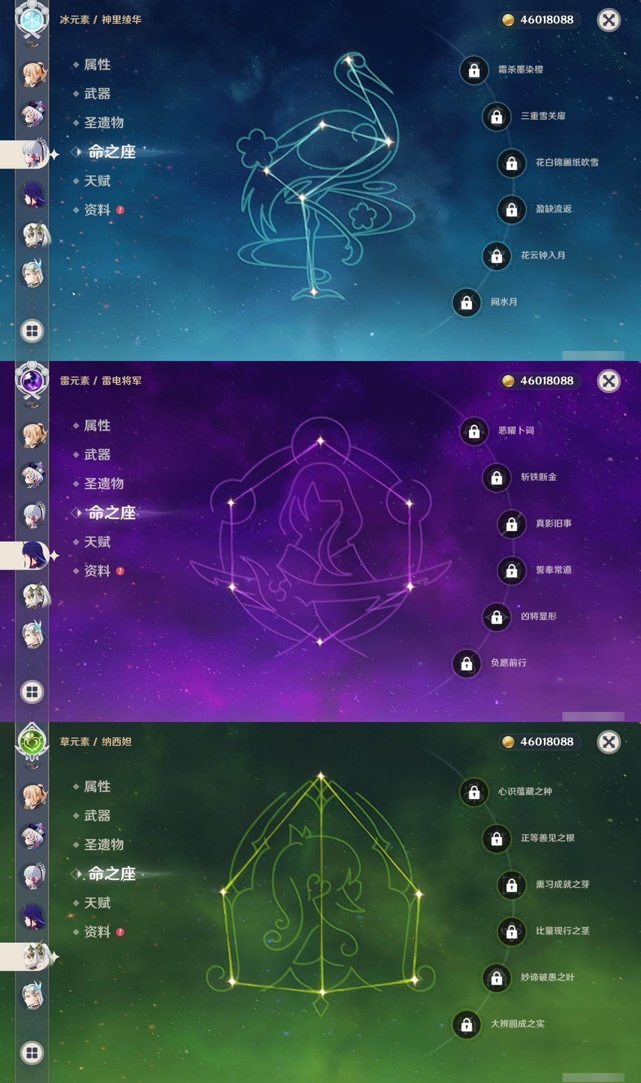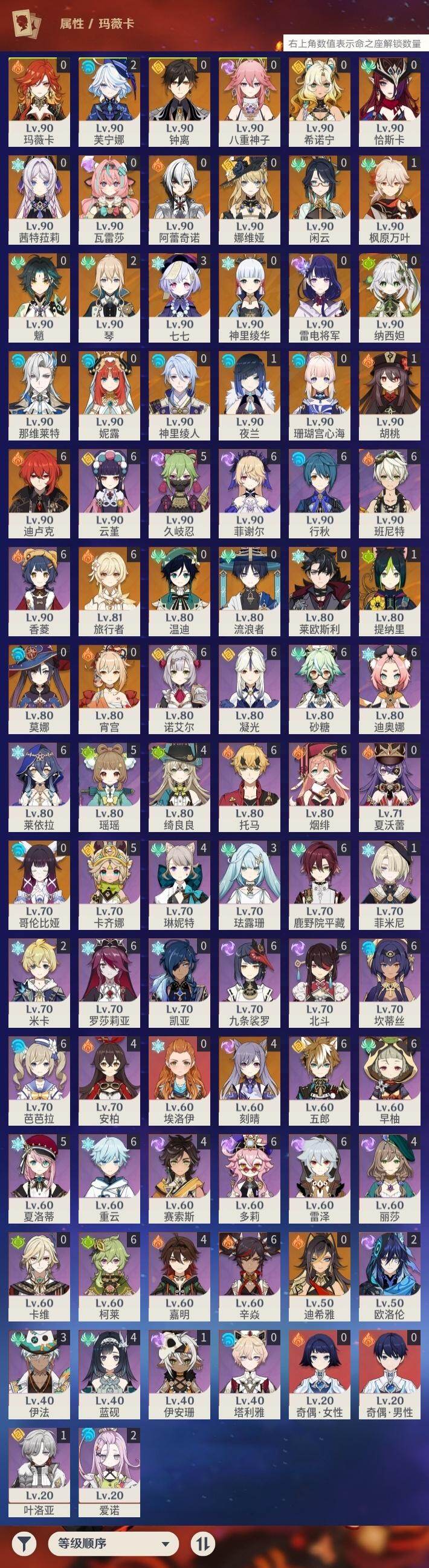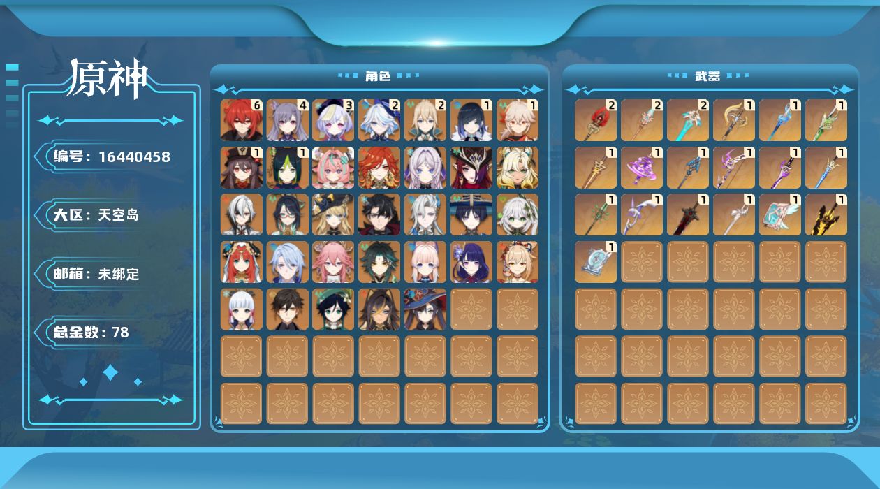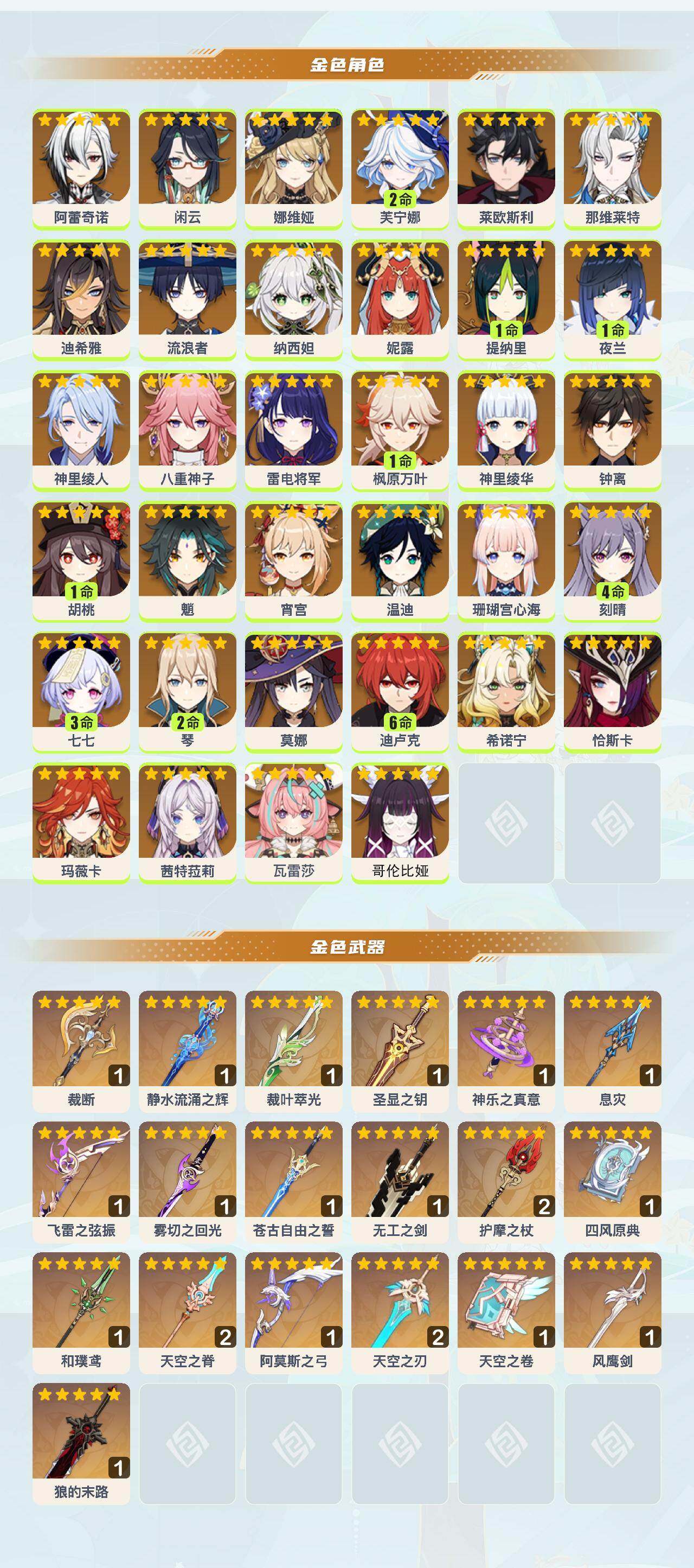 0命阿蕾奇诺,0命闲云,0命娜维娅,2命芙宁娜,0命莱欧斯利,0命那维莱特,0命迪希雅,0命流浪者,0命纳西妲,0命妮露,1命提纳里,1命夜兰,0命神里绫人,0命八重神子,0命雷电将军,1命枫原万叶,0命神里绫华,0命钟离,1命胡桃,0命魈,0命宵宫,0命温迪,0命珊瑚宫心海,4命刻晴,3命七七,2命琴,0命莫娜,满命迪卢克,0命希诺宁,0命恰斯卡,0命玛薇卡,0命茜特菈莉,0命瓦雷莎,0命哥伦比娅,精1裁断,精1静水流涌之辉,精1裁叶萃光,精1圣显之钥,精1神乐之真意,精1息灾,精1飞雷之弦振,精1雾切之回光,精1苍古自由之誓,精1无工之剑,精2护摩之杖,精1四风原典,精1和璞鸢,精2天空之脊,精1阿莫斯之弓,精2天空之刃,精1天空之卷,精1风鹰剑,精1狼的末路