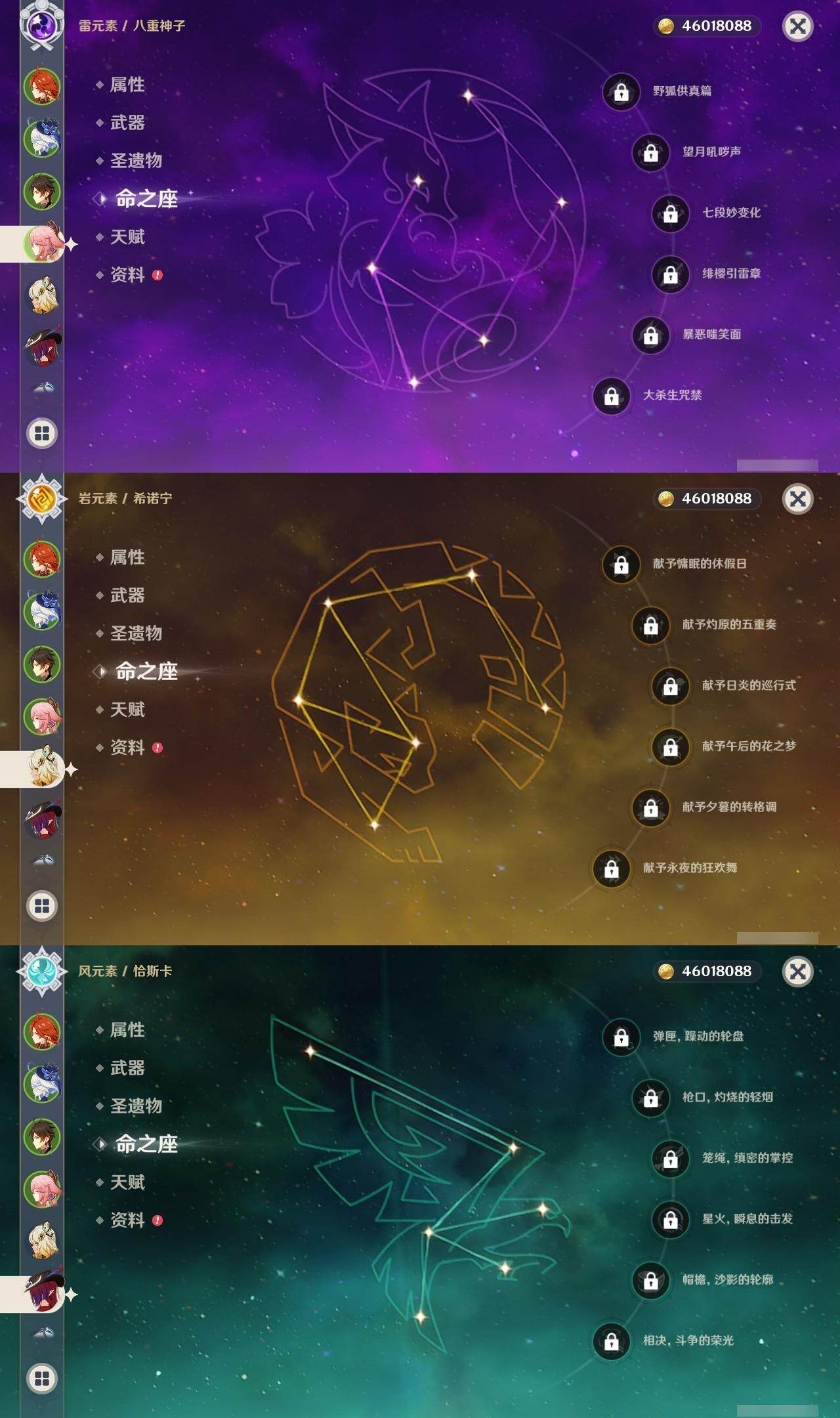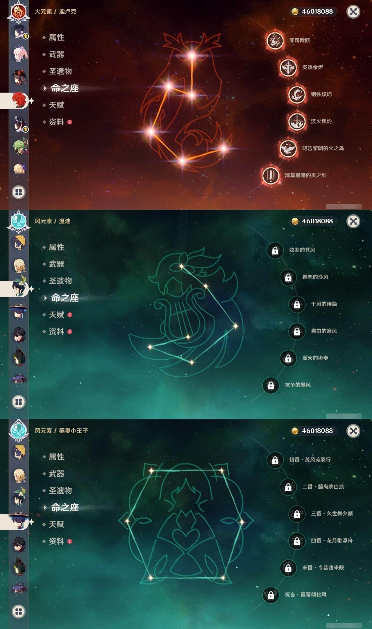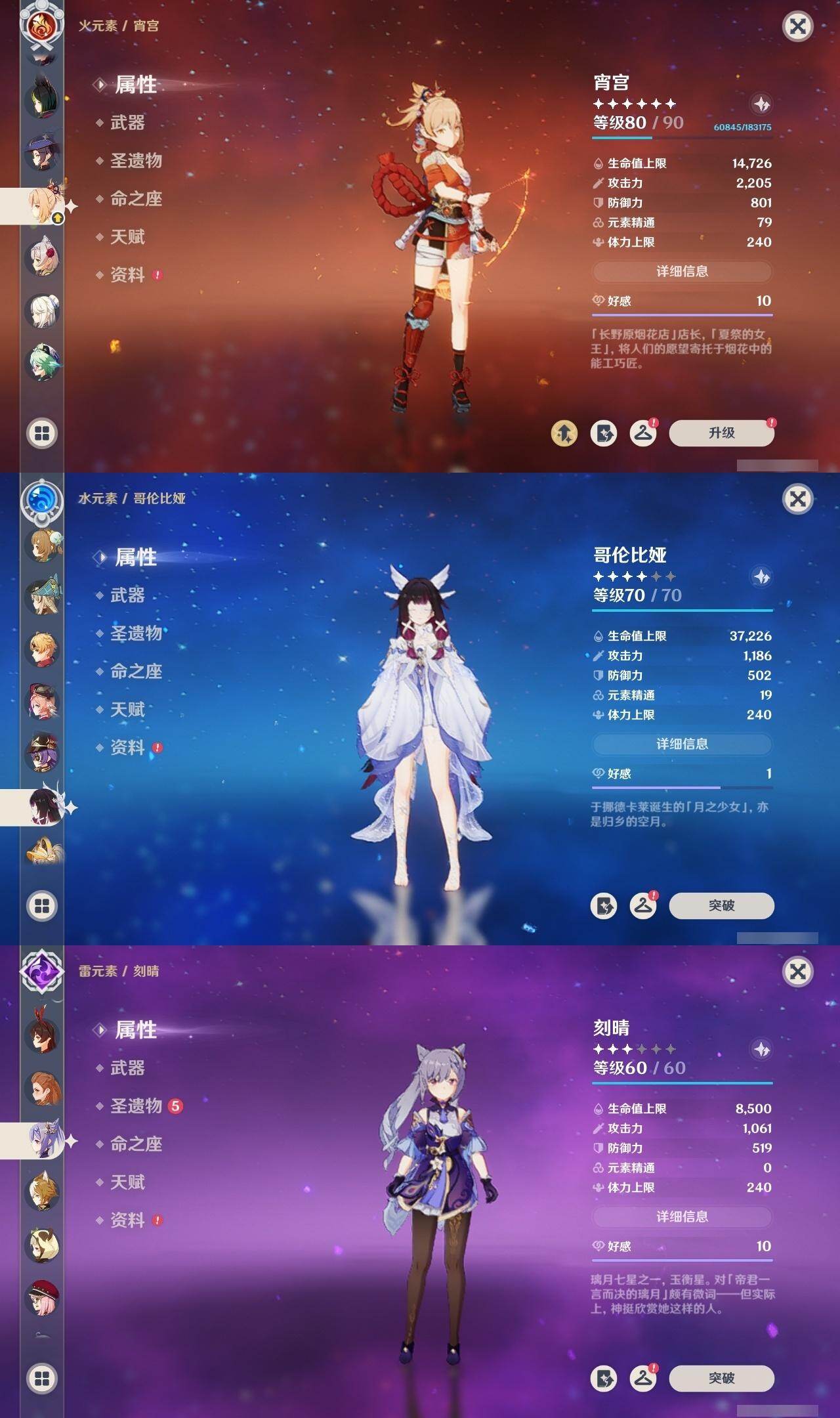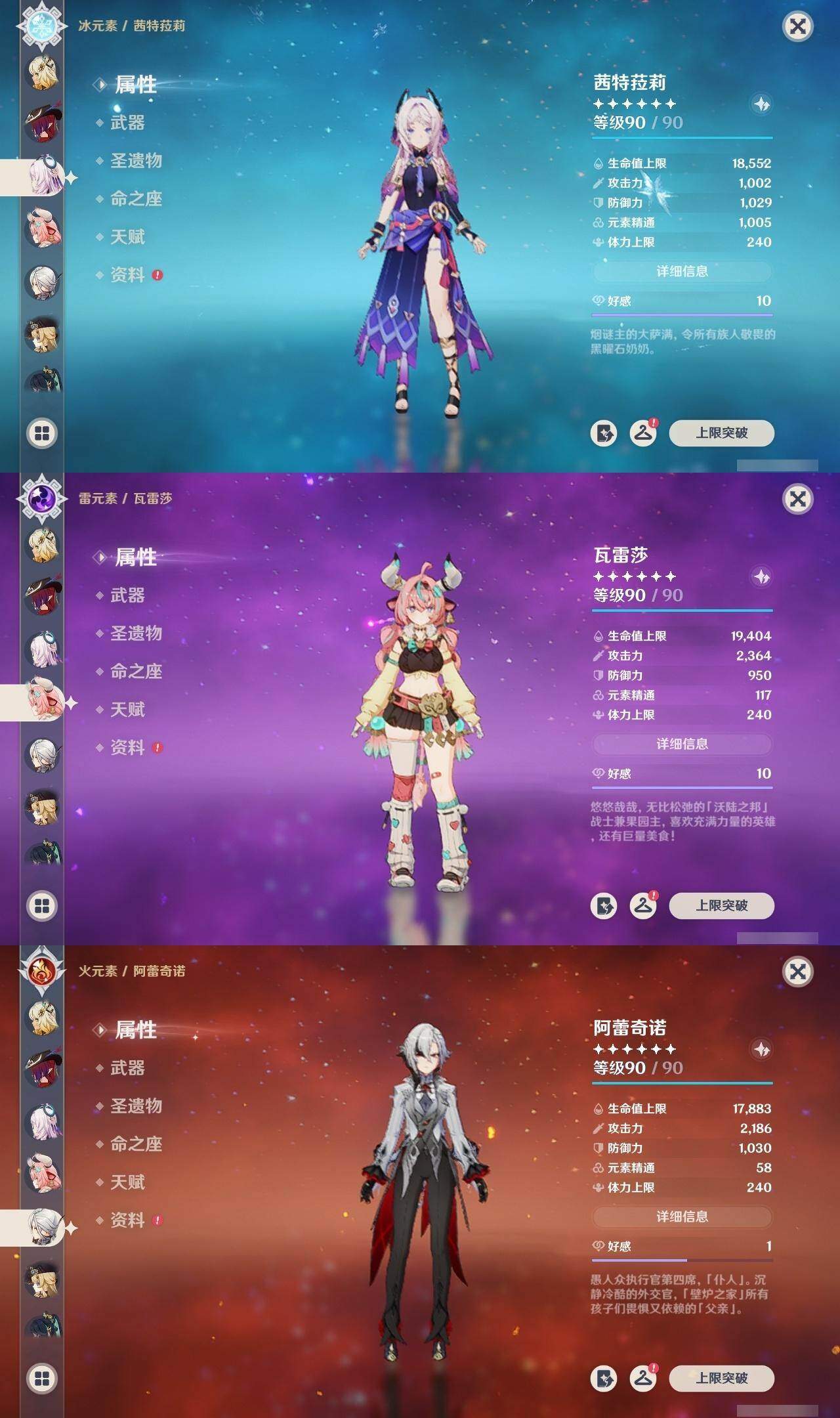 0命阿蕾奇诺,0命闲云,0命娜维娅,2命芙宁娜,0命莱欧斯利,0命那维莱特,0命迪希雅,0命流浪者,0命纳西妲,0命妮露,1命提纳里,1命夜兰,0命神里绫人,0命八重神子,0命雷电将军,1命枫原万叶,0命神里绫华,0命钟离,1命胡桃,0命魈,0命宵宫,0命温迪,0命珊瑚宫心海,4命刻晴,3命七七,2命琴,0命莫娜,满命迪卢克,0命希诺宁,0命恰斯卡,0命玛薇卡,0命茜特菈莉,0命瓦雷莎,0命哥伦比娅,精1裁断,精1静水流涌之辉,精1裁叶萃光,精1圣显之钥,精1神乐之真意,精1息灾,精1飞雷之弦振,精1雾切之回光,精1苍古自由之誓,精1无工之剑,精2护摩之杖,精1四风原典,精1和璞鸢,精2天空之脊,精1阿莫斯之弓,精2天空之刃,精1天空之卷,精1风鹰剑,精1狼的末路