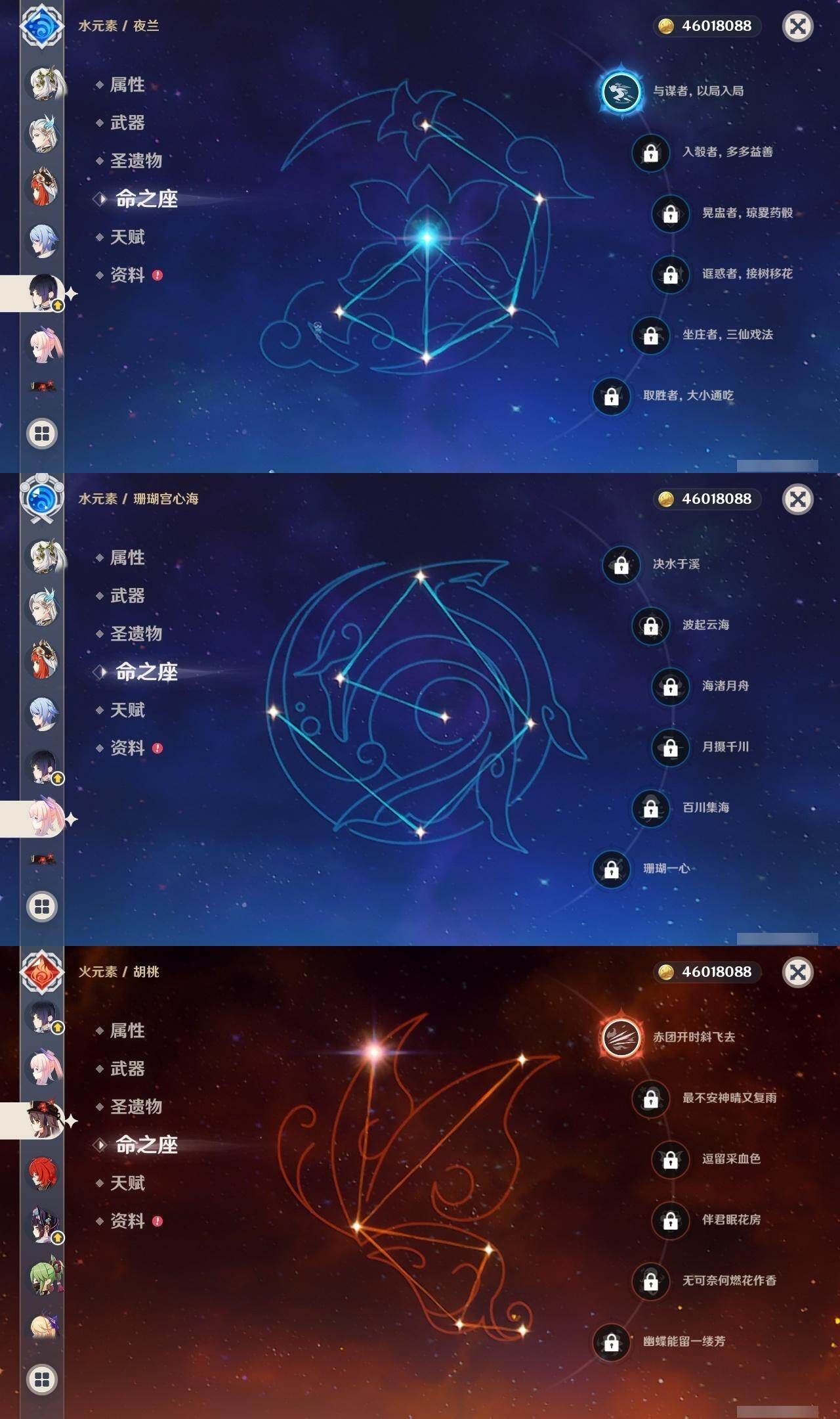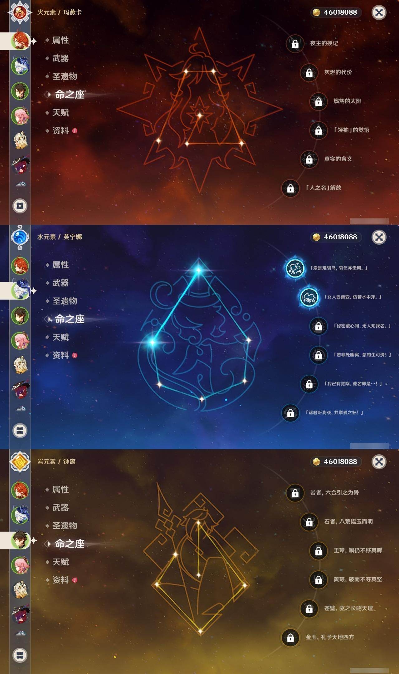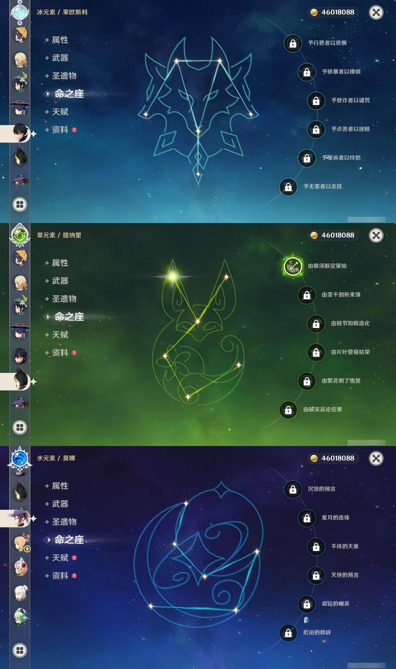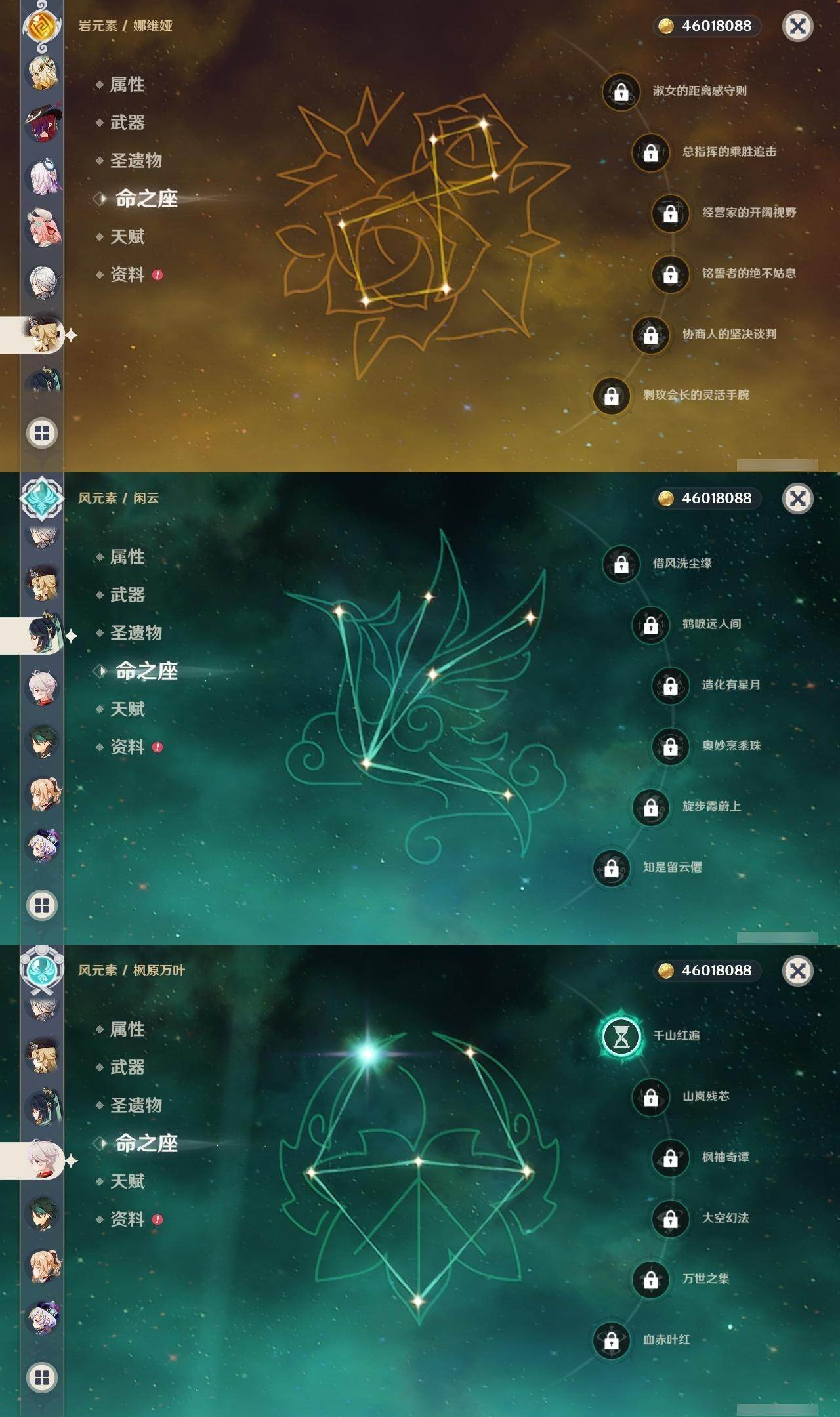 0命阿蕾奇诺,0命闲云,0命娜维娅,2命芙宁娜,0命莱欧斯利,0命那维莱特,0命迪希雅,0命流浪者,0命纳西妲,0命妮露,1命提纳里,1命夜兰,0命神里绫人,0命八重神子,0命雷电将军,1命枫原万叶,0命神里绫华,0命钟离,1命胡桃,0命魈,0命宵宫,0命温迪,0命珊瑚宫心海,4命刻晴,3命七七,2命琴,0命莫娜,满命迪卢克,0命希诺宁,0命恰斯卡,0命玛薇卡,0命茜特菈莉,0命瓦雷莎,0命哥伦比娅,精1裁断,精1静水流涌之辉,精1裁叶萃光,精1圣显之钥,精1神乐之真意,精1息灾,精1飞雷之弦振,精1雾切之回光,精1苍古自由之誓,精1无工之剑,精2护摩之杖,精1四风原典,精1和璞鸢,精2天空之脊,精1阿莫斯之弓,精2天空之刃,精1天空之卷,精1风鹰剑,精1狼的末路