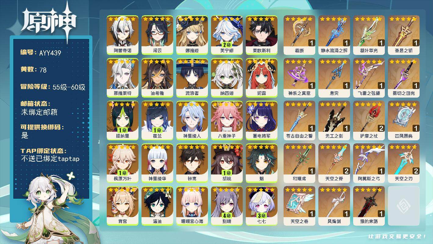 [16440458]【店主推荐捡漏号】60级/78黄/女主/34个五星角色/20个五星武器 0命阿蕾奇诺,0命闲云,0命娜维娅,2命芙宁娜,0命莱欧斯利,0命那维莱特,0命迪希雅,0命流浪者,0命纳西妲,0命妮露,1命提纳里,1命夜兰,0命神里绫人,0命八重神子,0命雷电将军,1命枫原万叶,0命神里绫华,0命钟离,1命胡桃,0命魈,0命宵宫,0命温迪,0命珊瑚宫心海,4命刻晴,3命七七,2命琴,0命莫娜,满命迪卢克,0命希诺宁,0命恰斯卡,0命玛薇卡,0命茜特菈莉,0命瓦雷莎,0命哥伦比娅,精1裁断,精1静水流涌之辉,精1裁叶萃光,精1圣显之钥,精1神乐之真意,精1息灾,精1飞雷之弦振,精1雾切之回光,精1苍古自由之誓,精1无工之剑,精2护摩之杖,精1四风原典,精1和璞鸢,精2天空之脊,精1阿莫斯之弓,精2天空之刃,精1天空之卷,精1风鹰剑,精1狼的末路