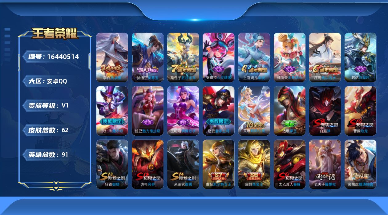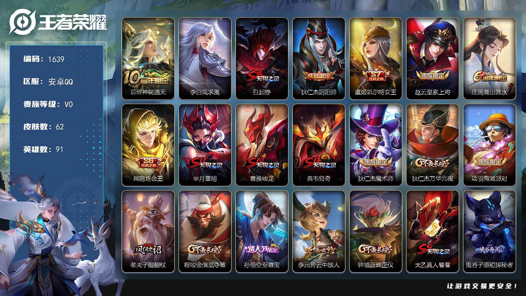 [16440514]【1639】安卓Q-V0-秩序白银I段位-91英雄-62皮肤-2传说-11史诗 【传说皮肤】:后羿神树通天,李白凤求凰 【限定皮肤】:白起狰,狄仁杰阴阳师,虞姬凯尔特女王,赵云皇家上将,庄周高山流水,扁鹊炼金王,芈月重明,曹操烛龙,典韦穷奇,狄仁杰魔术师,狄仁杰万华元夜,项羽海滩派对,老夫子醍醐杖,程咬金演武夺筹,孙悟空至尊宝,李元芳云中旅人,钟馗驱傩正仪,太乙真人饕餮,鬼谷子原初探秘者,鬼谷子五谷丰年,弈星混沌棋,沈梦溪大漠名商,明世隐疑决卦,裴擒虎擒涛扼浪,狂铁御狮,米莱狄御霄,上官婉儿梁祝,张良古海寻踪 【年限皮肤】:李白凤求凰 【赛季限定】:扁鹊炼金王,虞姬凯尔特女王,白起狰,太乙真人饕餮,曹操烛龙,芈月重明,典韦穷奇,狂铁御狮,米莱狄御霄,弈星混沌棋,明世隐疑决卦,老夫子醍醐杖,鬼谷子原初探秘者,狄仁杰万华元夜,程咬金演武夺筹,钟馗驱傩正仪,沈梦溪大漠名商,李元芳云中旅人,裴擒虎擒涛扼浪,张良古海寻踪 【史诗皮肤】:赵云皇家上将,王昭君偶像歌手,狄仁杰魔术师,孙尚香水果甜心,妲己魅力维加斯,韩信白龙吟,孙悟空至尊宝,安琪拉心灵骇客,上官婉儿梁祝,庄周高山流水,鬼谷子五谷丰年 【其他皮肤】:项羽海滩派对,韩信教廷特使,赵云忍炎影,扁鹊化身博士,安琪拉玩偶对对碰,妲己少女阿狸,亚瑟死亡骑士,达摩拳王,花木兰兔女郎,甄姬花好人间,宫本武藏万象初新,后羿阿尔法小队,狄仁杰阴阳师,刘备纽约教父,扁鹊炼金王,关羽龙腾万里,虞姬凯尔特女王,白起狰,钟无艳海滩丽影,太乙真人饕餮,曹操烛龙,芈月重明,典韦穷奇,诸葛亮掌控之力,狂铁御狮,米莱狄御霄,弈星混沌棋,明世隐疑决卦,老夫子醍醐杖,鬼谷子原初探秘者,狄仁杰万华元夜,程咬金演武夺筹,钟馗驱傩正仪,沈梦溪大漠名商,蒙恬蔚蓝守将,李元芳云中旅人,裴擒虎擒涛扼浪,张良古海寻踪,艾琳鹤鸣心笺,兰陵王隐刃,虞姬加勒比小姐,夏侯惇战争骑士,雅典娜战争女神,马可波罗激情绿茵,铠龙域领主,百里守约绝影神枪,李信灼热之刃,盘古创世神祝,镜冰刃幻境 【营地ID】:410822199