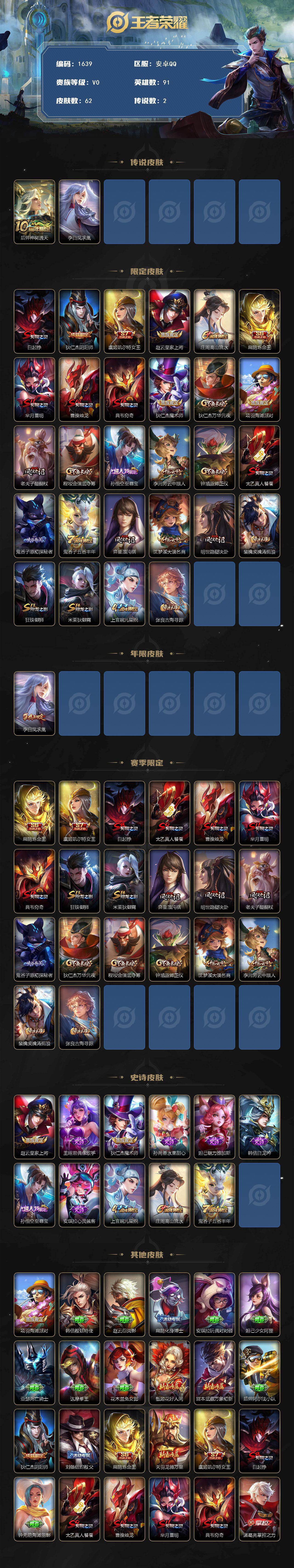 [16440514]【1639】安卓Q-V0-秩序白银I段位-91英雄-62皮肤-2传说-11史诗