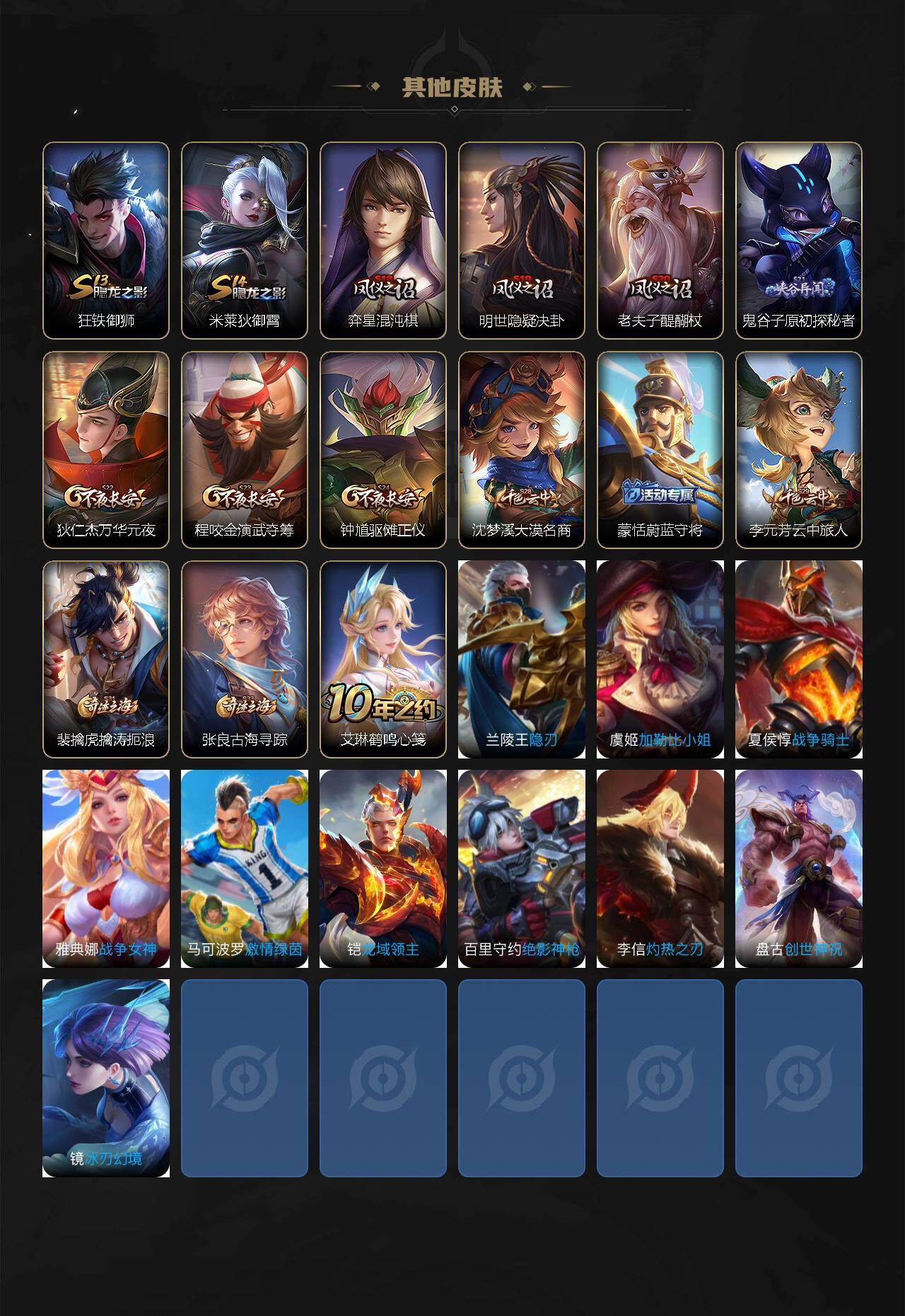 【其他皮肤】:项羽海滩派对,韩信教廷特使,赵云忍炎影,扁鹊化身博士,安琪拉玩偶对对碰,妲己少女阿狸,亚瑟死亡骑士,达摩拳王,花木兰兔女郎,甄姬花好人间,宫本武藏万象初新,后羿阿尔法小队,狄仁杰阴阳师,刘备纽约教父,扁鹊炼金王,关羽龙腾万里,虞姬凯尔特女王,白起狰,钟无艳海滩丽影,太乙真人饕餮,曹操烛龙,芈月重明,典韦穷奇,诸葛亮掌控之力,狂铁御狮,米莱狄御霄,弈星混沌棋,明世隐疑决卦,老夫子醍醐杖,鬼谷子原初探秘者,狄仁杰万华元夜,程咬金演武夺筹,钟馗驱傩正仪,沈梦溪大漠名商,蒙恬蔚蓝守将,李元芳云中旅人,裴擒虎擒涛扼浪,张良古海寻踪,艾琳鹤鸣心笺,兰陵王隐刃,虞姬加勒比小姐,夏侯惇战争骑士,雅典娜战争女神,马可波罗激情绿茵,铠龙域领主,百里守约绝影神枪,李信灼热之刃,盘古创世神祝,镜冰刃幻境