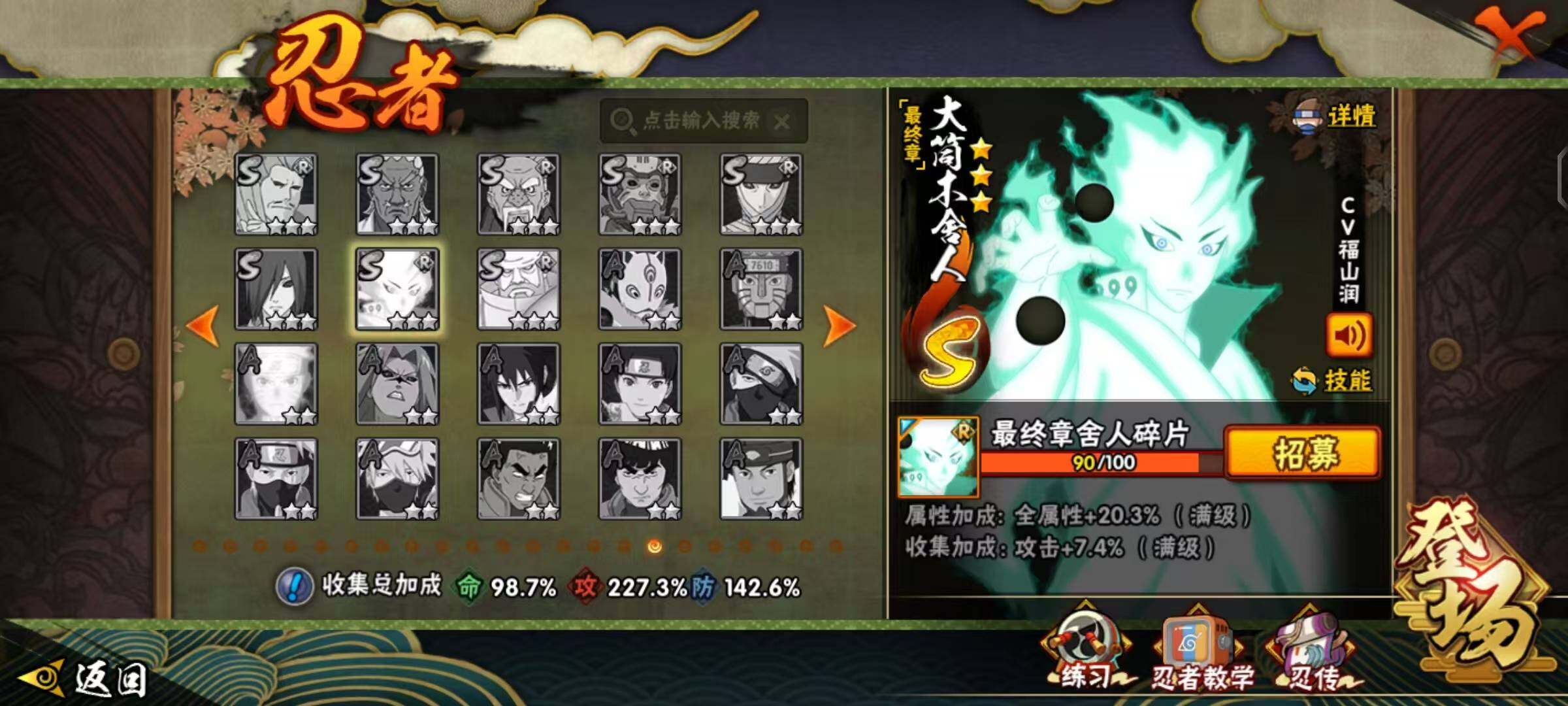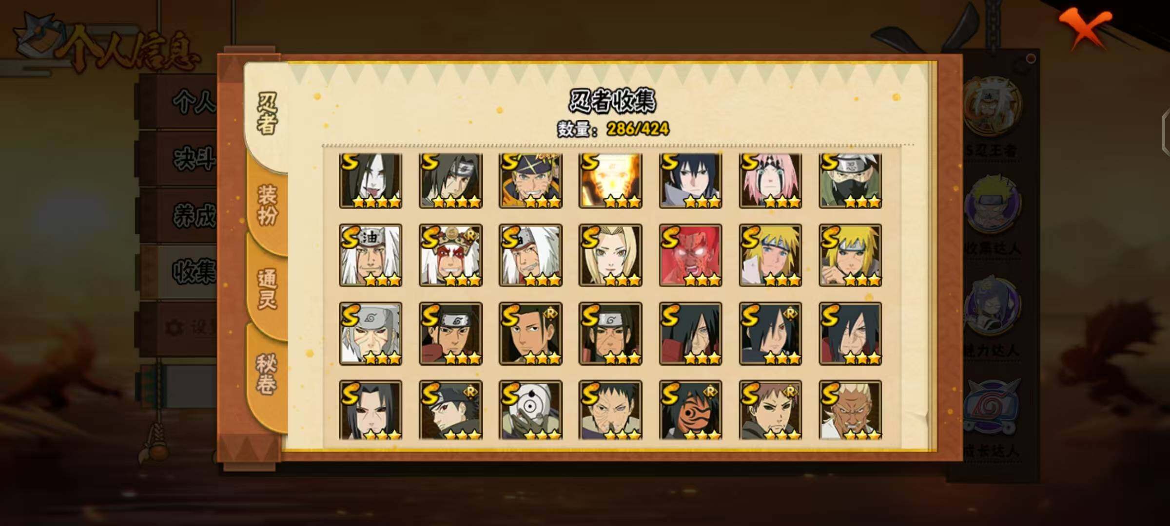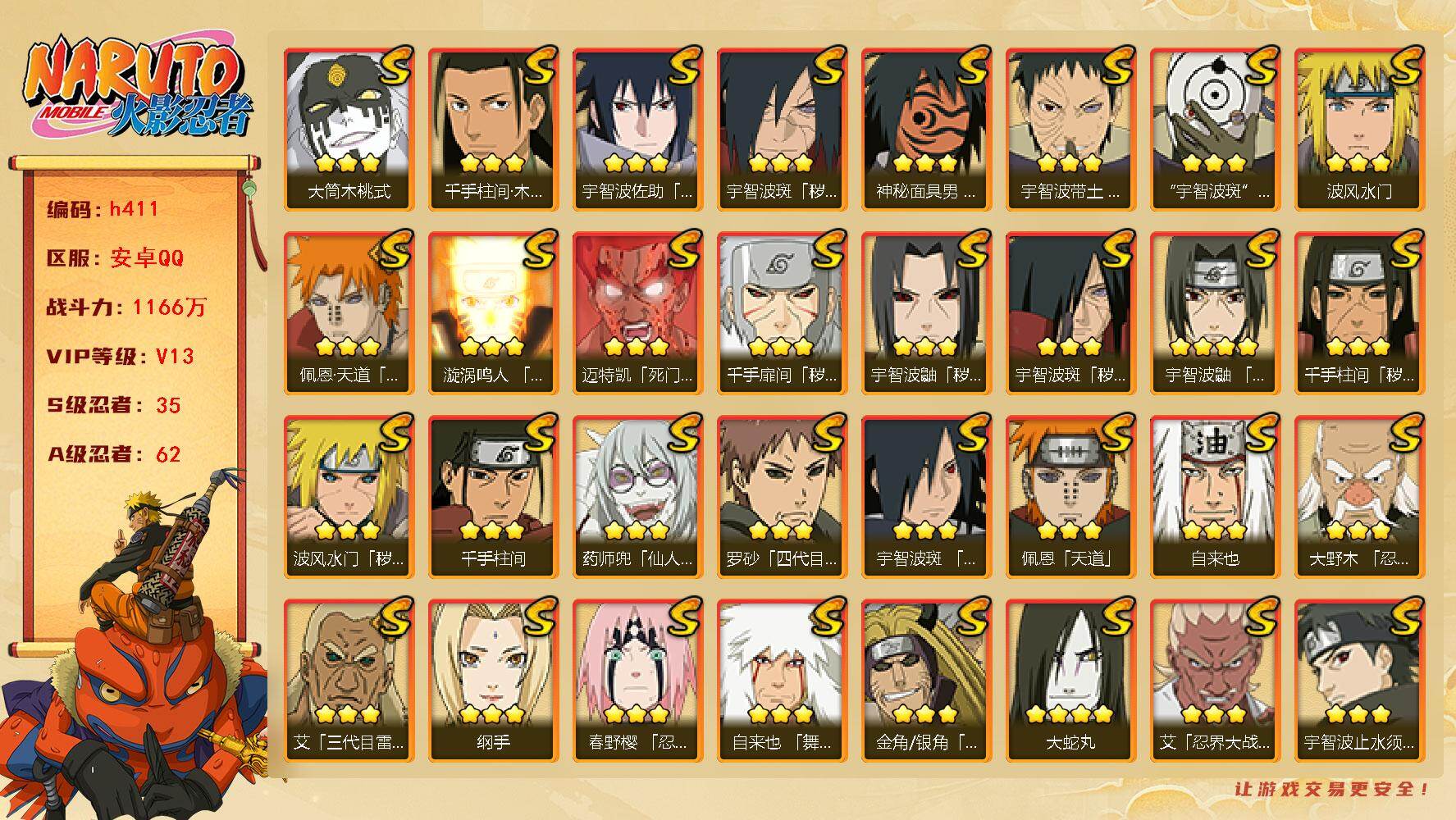 【S级忍者】:金角·银角「秽土转生」(3星),波风水门「秽土转生」(3星),千手扉间「秽土转生」(3星),千手柱间「秽土转生」(3星),宇智波鼬「秽土转生」(3星),宇智波斑「秽土转生」(3星),宇智波斑「秽土转生·解」(3星),大野木「忍界大战」(3星),春野樱「忍界大战」(3星),宇智波带土「忍界大战」(3星),艾「忍界大战」(3星),宇智波鼬「须佐能乎」(4星),宇智波止水「须佐能乎」(3星),旗木卡卡西「须佐能乎」(3星),宇智波斑「木叶创立」(3星),千手柱间「木叶创立」(3星),罗砂「四代目风影」(3星),艾「三代目雷影」(3星),自来也(3星),自来也「舞之豪杰」(3星),大蛇丸(4星),自来也「传说中的三忍」(3星),纲手(3星),千手柱间(3星),波风水门(3星),药师兜「仙人模式」(3星),神秘面具男「红夜之刃」(3星),漩涡鸣人「九喇嘛连结」(3星),迈特凯「死门」(3星),佩恩「天道」(3星),佩恩·天道「超」(3星),宇智波佐助「永恒万花筒」(3星),宇智波斑 「白面具」(3星宇智波斑「白面具」),大筒木桃式(3星),漩涡鸣人·宇智波佐助(3星)
