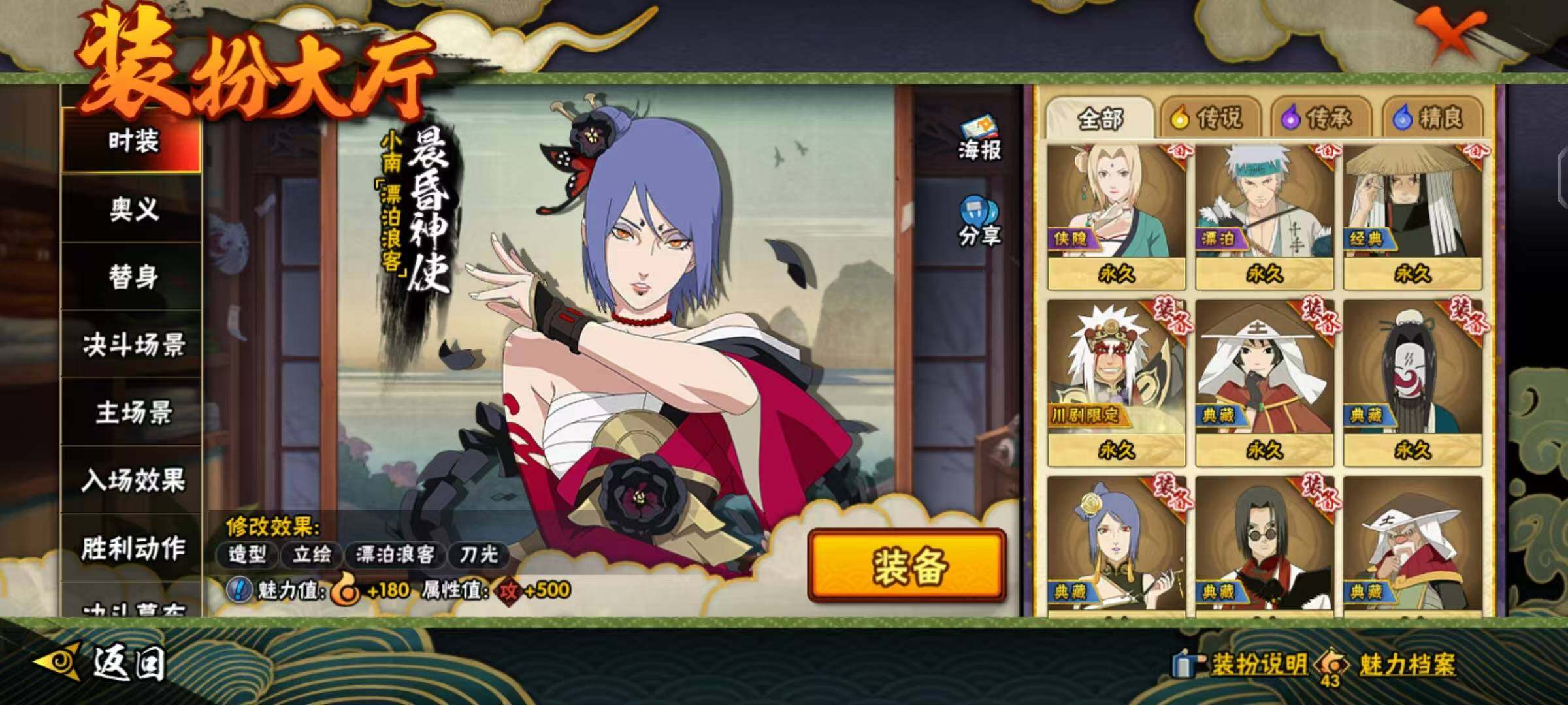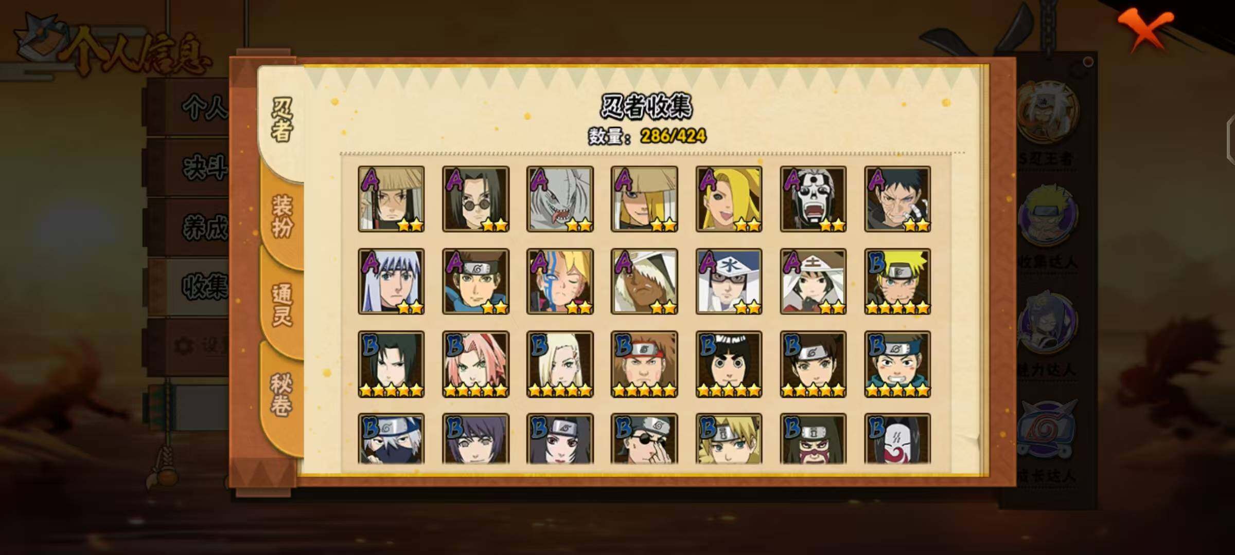 【A级忍者】:艾「青年」(2星),长门「青年」(2星),波风水门「青年」(2星),波风水门「新春限定」(2星),达鲁伊「博人传」(2星),迪达拉(2星),迪达拉「秽土转生」(2星),大蛇丸「晓」(2星),奇拉比「忍界大战」(2星),飞段(4星),飞段「死司凭血」(2星),干柿鬼鲛(5星),干柿鬼鲛「鲛肌融合」(2星),漩涡博人「桃式显现」(2星),漩涡鸣人「仙人模式」(2星),迈特凯(5星),旗木卡卡西「忍界大战」(2星),旗木卡卡西「万花筒写轮眼」(2星),旗木卡卡西「幻之真容」(2星),桃地再不斩「漂泊武士」(2星),我爱罗「疾风传」(4星),我爱罗「新春限定」(2星),我爱罗「忍界大战」(2星),蝎(2星),蝎「绯流琥」(2星),小南(2星),小南「新春限定」(2星),小南「夏日泳装」(2星),小南「漂泊浪客」(2星),角都「秽土转生」(2星),猿飞阿斯玛(5星),猿飞阿斯玛「秽土转生」(2星),宇智波止水(2星),宇智波止水「新春限定」(2星),猿飞日斩「火影继承人」(2星),宇智波鼬(2星),宇智波鼬「新春限定」(2星),宇智波佐助「须佐能乎」(2星),