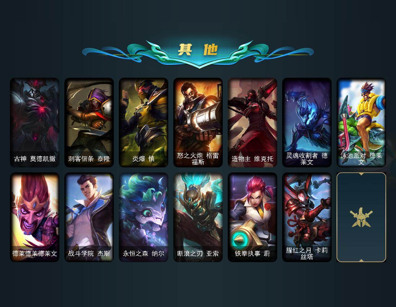 【其他皮肤1】:小红帽安妮,沙之守护瑞兹,游击队员崔丝塔娜,健美教练蒙多,昔日霸主普朗克,背叛之刃普朗克,垃圾场特朗德尔,荒野之咬雷克顿,鳄霸雷克顿,吕布奉先,传统僧侣李青,猎天使魔女薇恩,诺克萨斯波比,冒险精神伊泽瑞尔,古神莫德凯撒,刺客信条泰隆,炎爆慎,怒之火炮格雷福斯,造物主维克托,灵魂收割者德莱文,泳池派对德莱文,德莱德莱德莱文,战斗学院杰斯,永恒之森纳尔,断浪之刃亚索,铁拳执事蔚,腥红之月卡莉丝塔