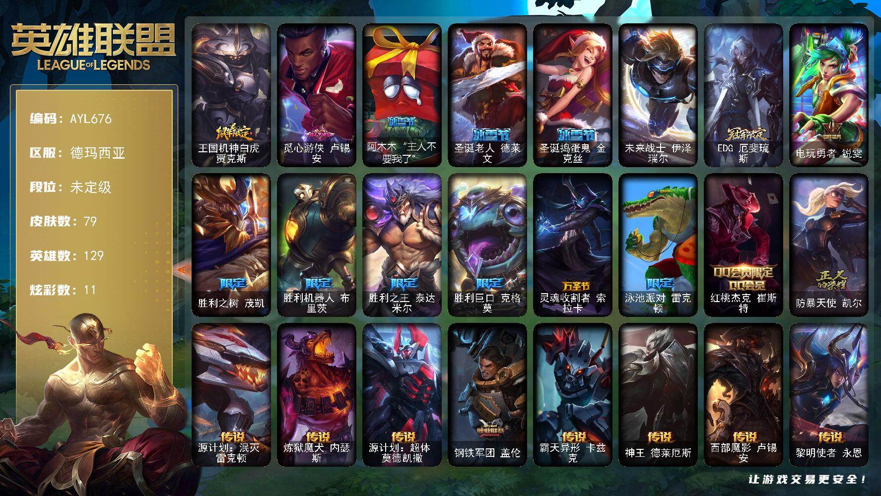 [16440602]【店主推荐捡漏号】未定级段位-129英雄-79皮肤-11炫彩-1终极-0神话-15限定-9传说-25史诗 【年限皮肤】:王国机神白虎贾克斯 【情人节限定】:觅心游侠卢锡安 【冰雪限定】:阿木木“主人不要我了”,圣诞老人德莱文,圣诞捣蛋鬼金克丝 【终极皮肤】:未来战士伊泽瑞尔 【限定皮肤】:EDG厄斐琉斯,电玩勇者锐雯,胜利之树茂凯,胜利机器人布里茨,胜利之王泰达米尔,胜利巨口克格莫,灵魂收割者索拉卡,泳池派对雷克顿,红桃杰克崔斯特,防暴天使凯尔 【传说皮肤】:源计划泯灭雷克顿,炼狱魔犬内瑟斯,源计划超体莫德凯撒,钢铁军团盖伦,霸天异形卡兹克,神王德莱厄斯,西部魔影卢锡安,黎明使者永恩,灵魂莲华瑟提 【史诗皮肤】:火箭达人崔丝塔娜,火牙狼人沃里克,掠星魔刃卡萨丁,特种部队普朗克,绝代智将斯维因,铁血狙击手凯特琳,符文战神雷克顿,凯旋英雄嘉文四世,至高之拳李青,战地机甲克格莫,黑帮教父格雷福斯,铁血猎人雷恩加尔,绞肉机刽子手德莱文,生化骑士德莱厄斯,天启骑士杰斯,西部牛仔亚索,源计划风亚索,屠龙勇士布隆,西部牛仔烬,黑帮狂花金克丝,职业杀手卢锡安,源计划阴劫,时之砂艾克,霸天剑魔亚托克斯,上古战魂雷克塞 【王者皮肤】:孤胆英豪嘉文四世 【其他皮肤1】:小红帽安妮,沙之守护瑞兹,游击队员崔丝塔娜,健美教练蒙多,昔日霸主普朗克,背叛之刃普朗克,垃圾场特朗德尔,荒野之咬雷克顿,鳄霸雷克顿,吕布奉先,传统僧侣李青,猎天使魔女薇恩,诺克萨斯波比,冒险精神伊泽瑞尔,古神莫德凯撒,刺客信条泰隆,炎爆慎,怒之火炮格雷福斯,造物主维克托,灵魂收割者德莱文,泳池派对德莱文,德莱德莱德莱文,战斗学院杰斯,永恒之森纳尔,断浪之刃亚索,铁拳执事蔚,腥红之月卡莉丝塔