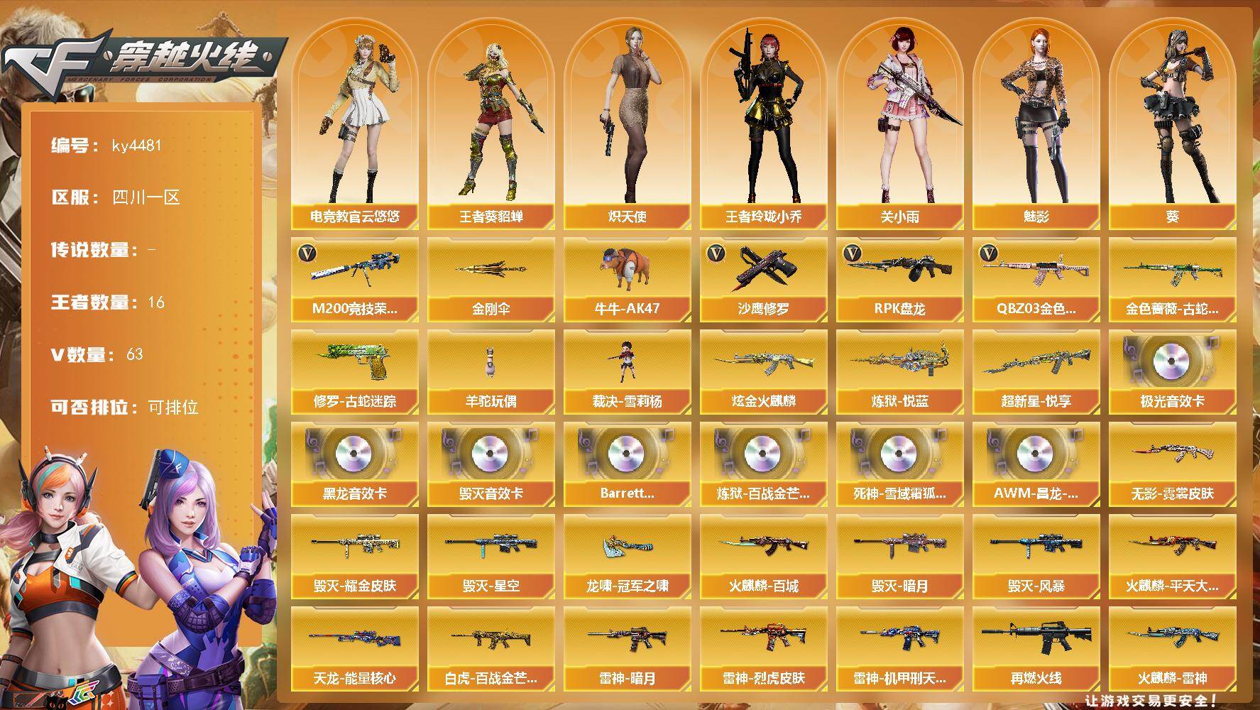 [16440672]四川一区-63V-16王者-1炫金 【热门武器】:QBZ03-金色蔷薇,金色蔷薇-古蛇迷踪,修罗-古蛇迷踪,M200-竞技荣光,牛牛-AK47,RPK-盘龙,羊驼玩偶,裁决-雪莉杨,沙鹰-修罗,金刚伞 【王者炫金武器】:超新星-悦享,炼狱-悦蓝,炫金火麒麟 【音效卡】:M4A1-黑龙音效卡,Barrett-毁灭音效卡,Barrett-极光音效卡,Barrett-碧霄极光音效卡*2,炼狱-百战金芒-庆典舞曲音效卡,死神-雪域霜狐-怀旧音效卡,AWM-昌龙-怀旧音效卡 【皮肤】:幻神-电竞之星 皮肤,白虎-百战金芒 皮肤,雷神-暗月,雷神-烈虎皮肤,雷神-机甲刑天皮肤,M4A1-再燃火线,火麒麟-雷神,火麒麟-平天大圣,火麒麟-百城,毁灭-暗月,毁灭耀金皮肤,毁灭-星空,毁灭-风暴*2,毁灭-神秘黑洞皮肤,M4A1-千变-孔明皮肤,黑龙-能量核心,无影-霓裳皮肤,战神-紫绶金章皮肤*2,战神-流金岁月皮肤,AK47-B-常胜将军-曹操*2,AK47-B-常胜将军-刘备,AK47-B-常胜将军-孙权*2,天龙-能量核心,极光-能量核心,屠龙-破浪逐光 皮肤,龙啸-冠军之啸,轻型军用手斧-再燃火线 【角色】:葵,魅影,电竞教官-云悠悠,关小雨,隐,战地猎狐,王者-葵-貂蝉,王者影豹,王者玲珑-小乔,雪域霜狐,蛇隐宗,奇洋探员,乔伊教练,修道士,云海玲珑,炽天使,暗夜-X,北极狐-X,初恋灵狐,电竞少女,芳心审判者,风暴女*2,虎妞,疾风,灵狐者-X,灵狐者-黄金海岸,灵狐者-七夕宝贝,龙儿,龙儿-小淘气,麻雀,潘多拉-X,潘多拉-甜心教官,潜龙队-X,青霞仙子,蛇姬,斯沃特-X,蜀雪,铁骑-乘风破浪,新娜塔莎,雪莉杨,樱-战斗天使,樱-缤纷夏日,影武者-X,智影 【人偶武器】:裁决-雪莉杨,火麒麟-灵狐,巴雷特-零-水下丽影,加特林-机械猎手,COP-旗袍,牛牛-AK47,迷你深渊冰龙,迷你裂空之翼,生化手雷-机甲核心*2,闪光弹-小乔*2,闪光弹-貂蝉,高爆手雷-大乔 【暴走生化】:超级对讲机 【挑战大师】:神圣爆裂者III,AK47-冰龙粉碎者,激光毁灭者III*2,KAC-圣炎切割者III,阐释者III 【英雄级武器】:AK47-火麒麟,M4A1-黑龙,M4A1-雷神,AK47-无影,AK12-天启,M4A1-武圣,超新星-热带奇洋,金色蔷薇-古蛇迷踪,死神-雪域霜