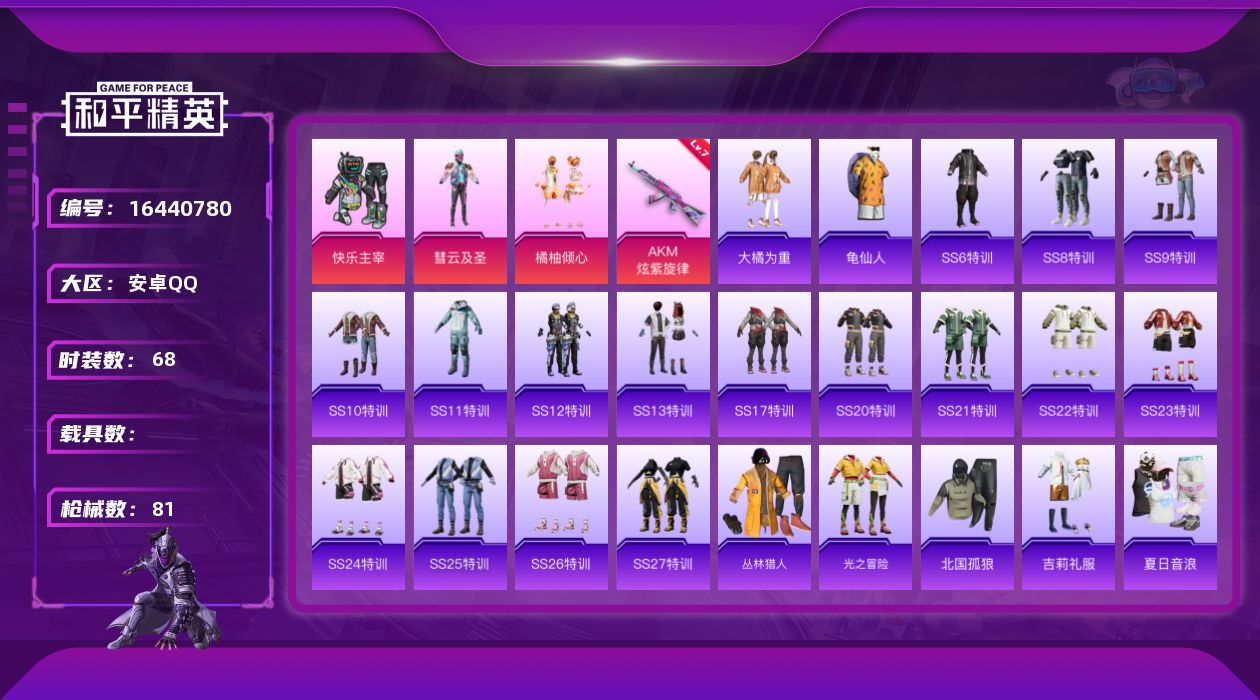 [16440780]【1712】安卓 手Q-3粉装-1特效枪-0载具-1粉色飞行器-27839热力值-3王牌印记-68套装-81枪皮 【热门品类】:套装-龟仙人 【粉色套装】:粉装-快乐主宰,粉装-彗云及圣,粉装-橘柚倾心 【粉色枪皮等级】:AKM-炫紫旋律(七级) 【粉色枪皮】:AKM-炫紫旋律 【粉色飞行器】:歌者泠鸢飞行器 【粉色降落伞】:深海曼妙降落伞,快乐主宰降落伞,彩虹甜喵降落伞 【稀有套装】:套装-龟仙人 【稀有枪皮】:M16A4-幻世战舞者,M16A4-快乐主宰,SCAR-L-炫彩节奏,SCAR-L-玉兔迎春,SCAR-L-红色方程式,M416-夜灯,M416-神秘黑猫,M416-糯团青竹,M416-紫翼圣骑,M416-红色方程式,GROZA-田园牧歌,AUG-耀粉歌者,QBZ-神秘黑猫,M762-天降萌叽,M762-奇异狩猎者,M762-彩虹甜喵,M762-快乐主宰,AC-VAL-天降萌叽,蜜獾-天降萌叽,蜜獾-娇憨猪猪,UZI-众神之王,UZI-娇憨猪猪,UMP45-快乐主宰,UMP45-时空追击者,Vector-生命誓言,Vector-田园牧歌,汤姆逊-勇闯险境,汤姆逊-奇异狩猎者,汤姆逊-庄周梦蝶,MP5K-众神之王,Kar98K-勇闯险境,M24-众神之王,AWM-庄周梦蝶,SKS-勇闯险境,SKS-糯团青竹,VSS-田园牧歌,Mini14-金鼠迎春,SLR-众神之王,SLR-娇憨猪猪,M200-绿野极光,S686-红色方程式,S1897-勇闯险境,S1897-炫彩节奏,S12K-娇憨猪猪,S12K-幻世战舞者,DBS-彩虹甜喵,DBS-歌者泠鸢,SPAS-12-田园牧歌,M249-彩虹符号,M249-糯团青竹,M249-镭射皇者,MG3-幻世战舞者 【其他套装】:套装-SS6特训,套装-SS8特训,套装-SS9特训,套装-SS10特训,套装-SS11特训,套装-SS12特训,套装-SS13特训,套装-SS17特训,套装-SS20特训,套装-SS21特训,套装-SS22特训,套装-SS23特训,套装-SS24特训,套装-SS25特训,套装-SS26特训,套装-SS27特训,套装-丛林猎人,套装-光之冒险,套装-北国孤狼,套装-吉莉礼服,套装-夏日音浪,套装-幻世战舞者,套装-格斗先锋,套装-灰色格斗者,套装-牛气满满,套装-猛禽,套装-甜蜜熊情侣,套装-疯狂