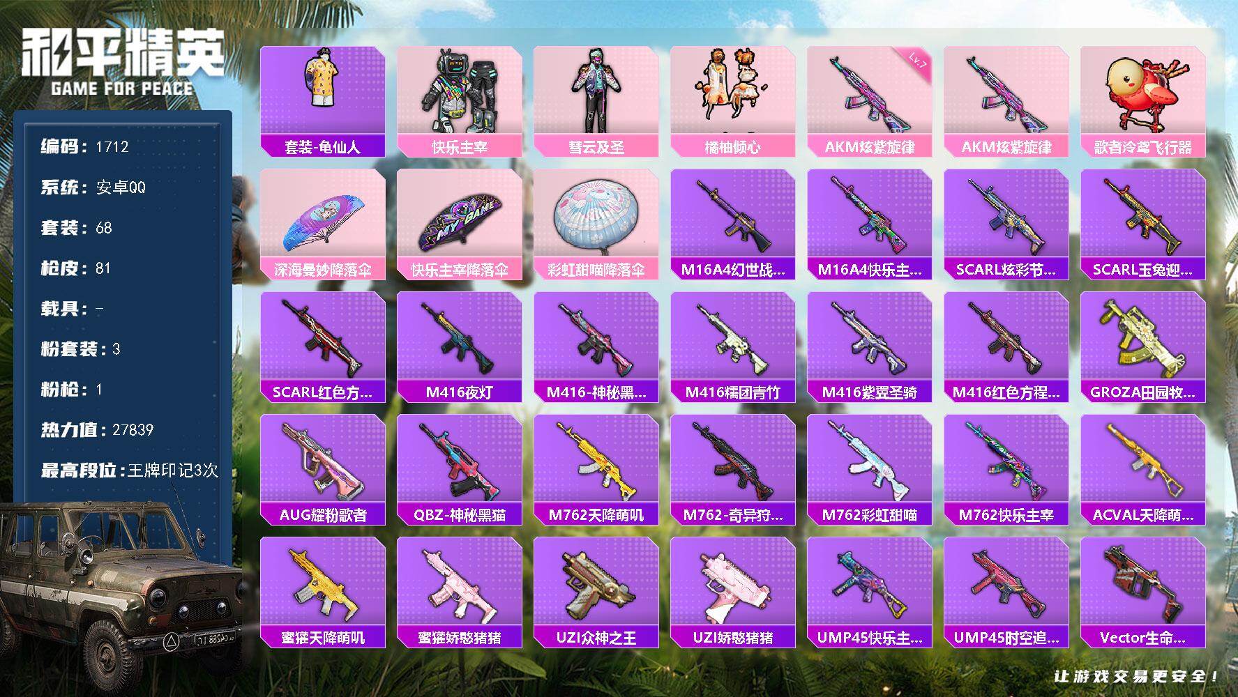 [16440780]【1712】安卓 手Q-3粉装-1特效枪-0载具-1粉色飞行器-27839热力值-3王牌印记-68套装-81枪皮
