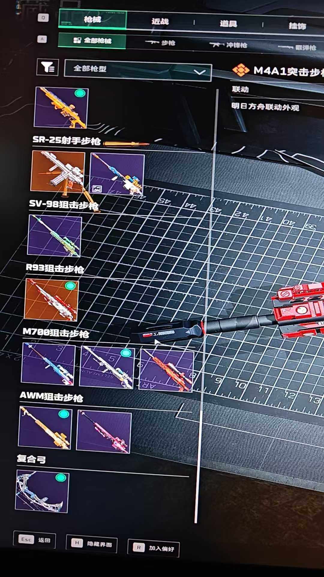 【史诗外观】:SR-25射手步枪-天命,ASh-12战斗步枪-无极限,K416突击步枪-冬日风情,M7战斗步枪-百步穿杨,SCAR-H战斗步枪-囚徒,G3战斗步枪-流沙送葬,AS Val突击步枪-百步穿杨,K437突击步枪-守护者,MP5冲锋枪-战术竞备,MP5冲锋枪-竞技风,Vector冲锋枪-百步穿杨,Vector冲锋枪-异域战争,SR-3M紧凑突击步枪-战术竞备,MP7冲锋枪-守护者,QJB201轻机枪-炽焰,Mini-14射手步枪-守护者,M14射手步枪-工业狂潮,SV-98狙击步枪-猎鳄行动,M700狙击步枪-竞技风,M700狙击步枪-百步穿杨,M700狙击步枪-哈夫克警备,AWM狙击步枪-无极限,AWM狙击步枪-流沙送葬,复合弓-守护者