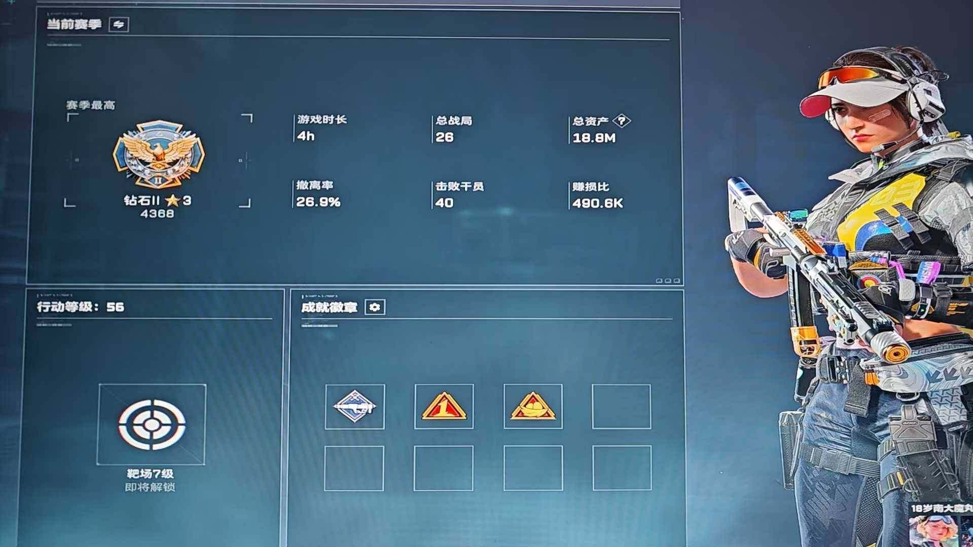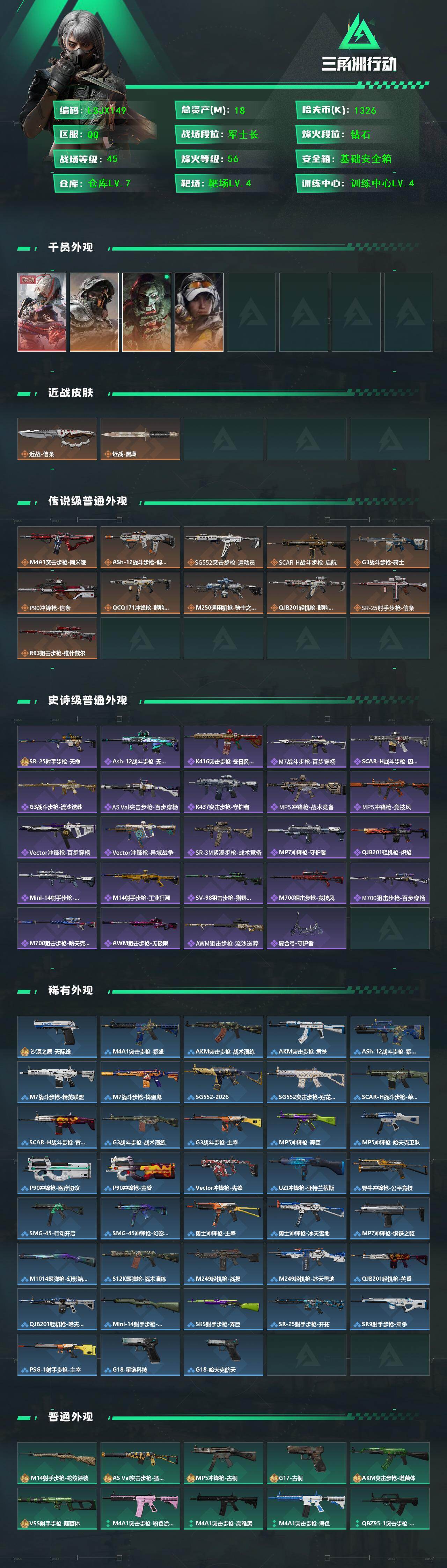 [16441406]18m总资产-1326k哈伏币-56烽火等级-钻石-45战场等级-军士长 【干员外观】:骇爪-维什戴尔,深蓝-不破誓约,红狼-电锯惊魂,露娜-金牌射手 【近战皮肤】:近战-信条,近战-黑鹰 【传说外观】:M4A1突击步枪-阿米娅,ASh-12战斗步枪-鹅鸭杀,SG552突击步枪-运动员,SCAR-H战斗步枪-启航,G3战斗步枪-骑士,P90冲锋枪-信条,QCQ171冲锋枪-鹅鸭杀,M250通用机枪-骑士之心,QJB201轻机枪-鹅鸭杀,SR-25射手步枪-信条,R93狙击步枪-维什戴尔 【史诗外观】:SR-25射手步枪-天命,ASh-12战斗步枪-无极限,K416突击步枪-冬日风情,M7战斗步枪-百步穿杨,SCAR-H战斗步枪-囚徒,G3战斗步枪-流沙送葬,AS Val突击步枪-百步穿杨,K437突击步枪-守护者,MP5冲锋枪-战术竞备,MP5冲锋枪-竞技风,Vector冲锋枪-百步穿杨,Vector冲锋枪-异域战争,SR-3M紧凑突击步枪-战术竞备,MP7冲锋枪-守护者,QJB201轻机枪-炽焰,Mini-14射手步枪-守护者,M14射手步枪-工业狂潮,SV-98狙击步枪-猎鳄行动,M700狙击步枪-竞技风,M700狙击步枪-百步穿杨,M700狙击步枪-哈夫克警备,AWM狙击步枪-无极限,AWM狙击步枪-流沙送葬,复合弓-守护者 【稀有外观】:沙漠之鹰-天际线,M4A1突击步枪-繁盛,AKM突击步枪-战术演练,AKM突击步枪-肃杀,ASh-12战斗步枪-繁盛,M7战斗步枪-精英联盟,M7战斗步枪-捣蛋鬼,SG552突击步枪-2026,SG552突击步枪-贴花艺术,SCAR-H战斗步枪-荣耀列队,SCAR-H战斗步枪-黄昏,G3战斗步枪-战术演练,G3战斗步枪-主宰*2,MP5冲锋枪-弄臣,MP5冲锋枪-哈夫克卫队,P90冲锋枪-医疗协议,P90冲锋枪-黄昏,Vector冲锋枪-先锋,UZI冲锋枪-亚特兰蒂斯,野牛冲锋枪-公平竞技,SMG-45-行动开启,SMG-45冲锋枪-幻影结构,勇士冲锋枪-主宰,勇士冲锋枪-冰天雪地,MP7冲锋枪-钢铁之躯,M1014霰弹枪-幻影结构,S12K霰弹枪-战术演练,M249轻机枪-战损,M249轻机枪-冰天雪地,QJB201轻机枪-黄昏,QJB201轻机枪-哈夫克卫队,Mini-14射手步枪-荣耀列队,SKS射手步枪-弄臣,SR