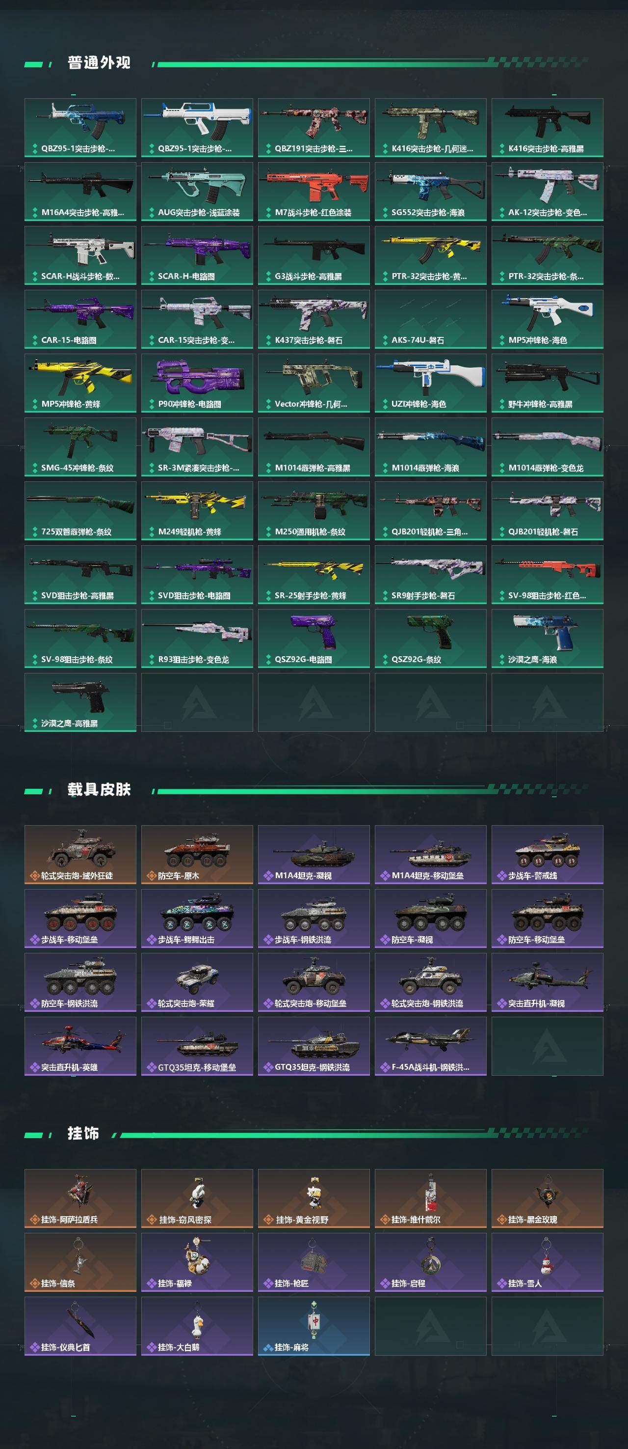 【稀有外观】:沙漠之鹰-天际线,M4A1突击步枪-繁盛,AKM突击步枪-战术演练,AKM突击步枪-肃杀,ASh-12战斗步枪-繁盛,M7战斗步枪-精英联盟,M7战斗步枪-捣蛋鬼,SG552突击步枪-2026,SG552突击步枪-贴花艺术,SCAR-H战斗步枪-荣耀列队,SCAR-H战斗步枪-黄昏,G3战斗步枪-战术演练,G3战斗步枪-主宰*2,MP5冲锋枪-弄臣,MP5冲锋枪-哈夫克卫队,P90冲锋枪-医疗协议,P90冲锋枪-黄昏,Vector冲锋枪-先锋,UZI冲锋枪-亚特兰蒂斯,野牛冲锋枪-公平竞技,SMG-45-行动开启,SMG-45冲锋枪-幻影结构,勇士冲锋枪-主宰,勇士冲锋枪-冰天雪地,MP7冲锋枪-钢铁之躯,M1014霰弹枪-幻影结构,S12K霰弹枪-战术演练,M249轻机枪-战损,M249轻机枪-冰天雪地,QJB201轻机枪-黄昏,QJB201轻机枪-哈夫克卫队,Mini-14射手步枪-荣耀列队,SKS射手步枪-弄臣,SR
