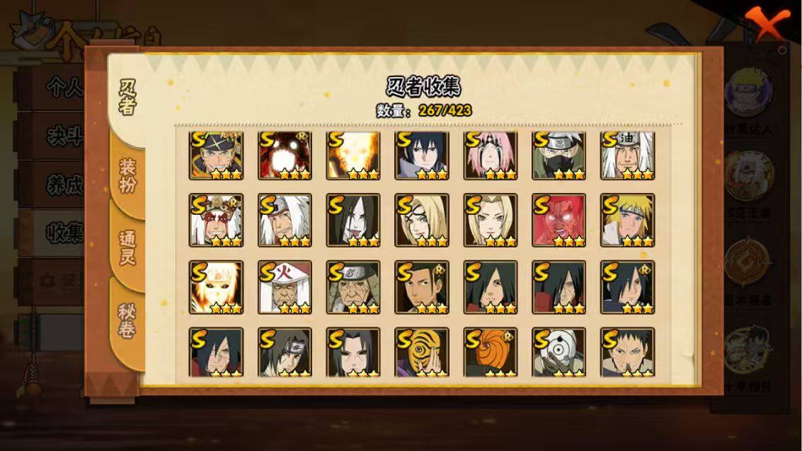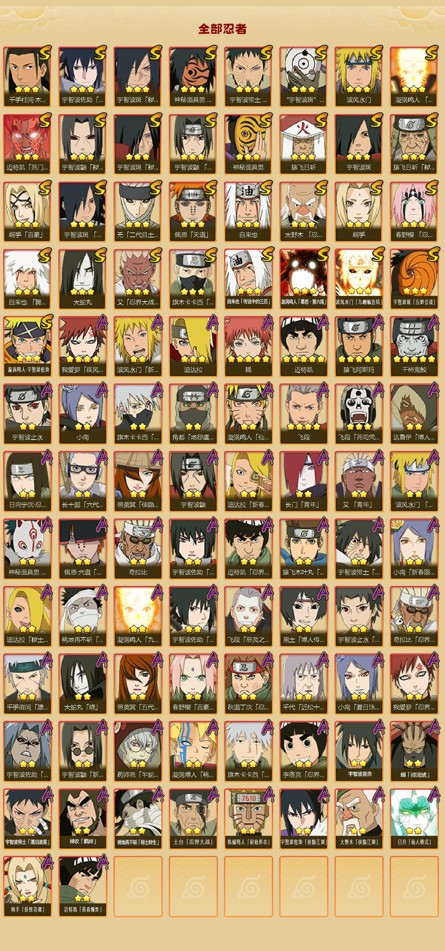 【S级忍者】:猿飞日斩「秽土转生」(3星),宇智波鼬「秽土转生」(3星),宇智波斑「秽土转生」(3星),宇智波斑「秽土转生·解」(3星),大野木「忍界大战」(3星),春野樱「忍界大战」(3星),宇智波带土「忍界大战」(3星),艾「忍界大战」(3星),宇智波鼬「须佐能乎」(3星),旗木卡卡西「须佐能乎」(3星),宇智波斑「木叶创立」(3星),千手柱间「木叶创立」(3星),无「二代目土影」(3星),自来也(3星),自来也「舞之豪杰」(3星),大蛇丸(3星),自来也「传说中的三忍」(3星),纲手(3星),纲手「百豪」(3星),猿飞日斩(3星),宇智波斑(3星),波风水门(3星),神秘面具男(3星),神秘面具男「红夜之刃」(3星),漩涡鸣人「九喇嘛连结」(3星),迈特凯「死门」(3星),佩恩「天道」(3星),宇智波佐助「永恒万花筒」(3星),宇智波斑 「白面具」(3星宇智波斑「白面具」),漩涡鸣人「暴怒·第六尾」(3星),波风水门「九喇嘛连结」(3星),宇智波斑「五影会谈」(3星),漩涡鸣人·宇智波佐助(3星)