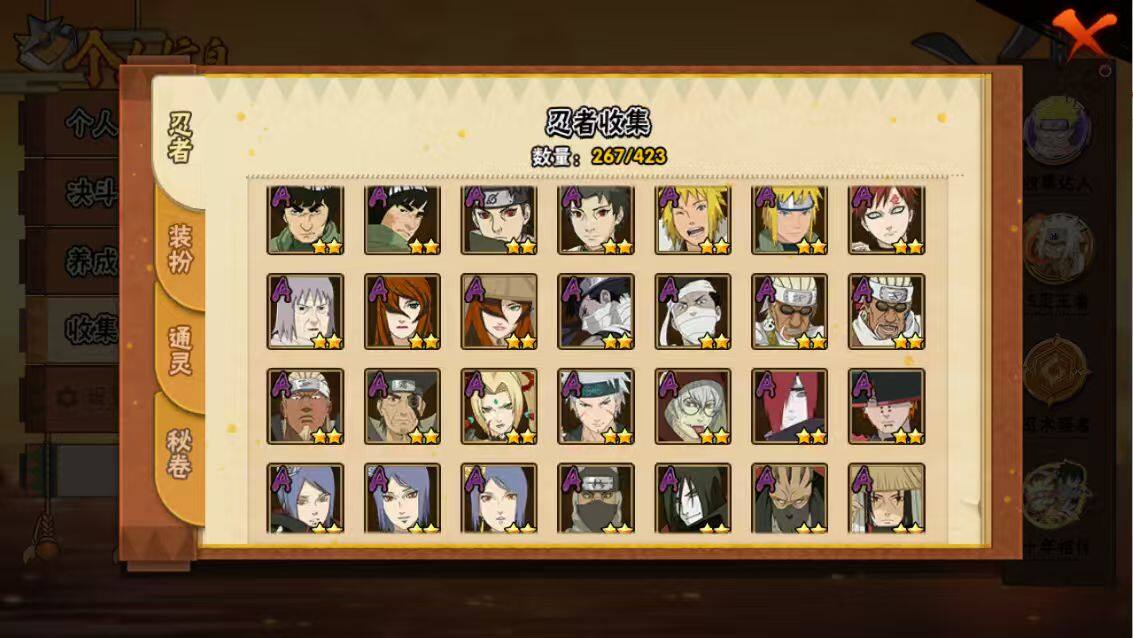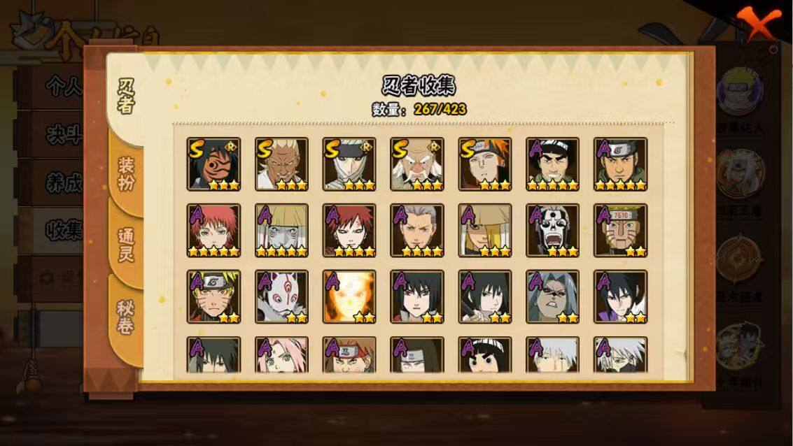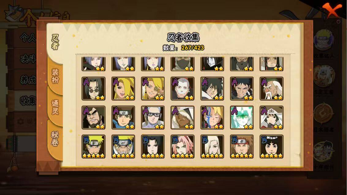 【A级忍者】:艾「青年」(2星),长门「青年」(2星),波风水门「青年」(2星),波风水门「新春限定」(2星),达鲁伊「博人传」(2星),迪达拉(3星),迪达拉「新春限定」(2星),迪达拉「秽土转生」(2星),大蛇丸「晓」(2星),奇拉比(2星),奇拉比「忍界大战」(2星),飞段(4星),飞段「死司凭血」(3星),飞段「恶灵之影」(2星),干柿鬼鲛(5星),漩涡博人「桃式显现」(2星),漩涡鸣人「仙人模式」(2星),漩涡鸣人「九尾查克拉」(2星),机械鸣人「初始形态」(2星),迈特凯(5星),迈特凯「忍界大战」(2星),旗木卡卡西「万花筒写轮眼」(2星),旗木卡卡西「幻之真容」(2星),桃地再不斩「漂泊武士」(2星),桃地再不斩「秽土转生」(2星),我爱罗「疾风传」(4星),我爱罗「忍界大战」(2星),蝎(5星),蝎「绯流琥」(2星),小南(2星),小南「新春限定」(2星),小南「夏日泳装」(2星),角都「地怨虞」(2星),猿飞阿斯玛(5星),宇智波止水(2星),宇智波止水「新春限定」(2星),宇智波鼬(2星),宇智波鼬「新春限定」(2星),宇智波佐助「须佐能乎」(2星),宇智波佐助「疾风传咒印」(2星),宇智波佐助「万花筒写轮眼」
