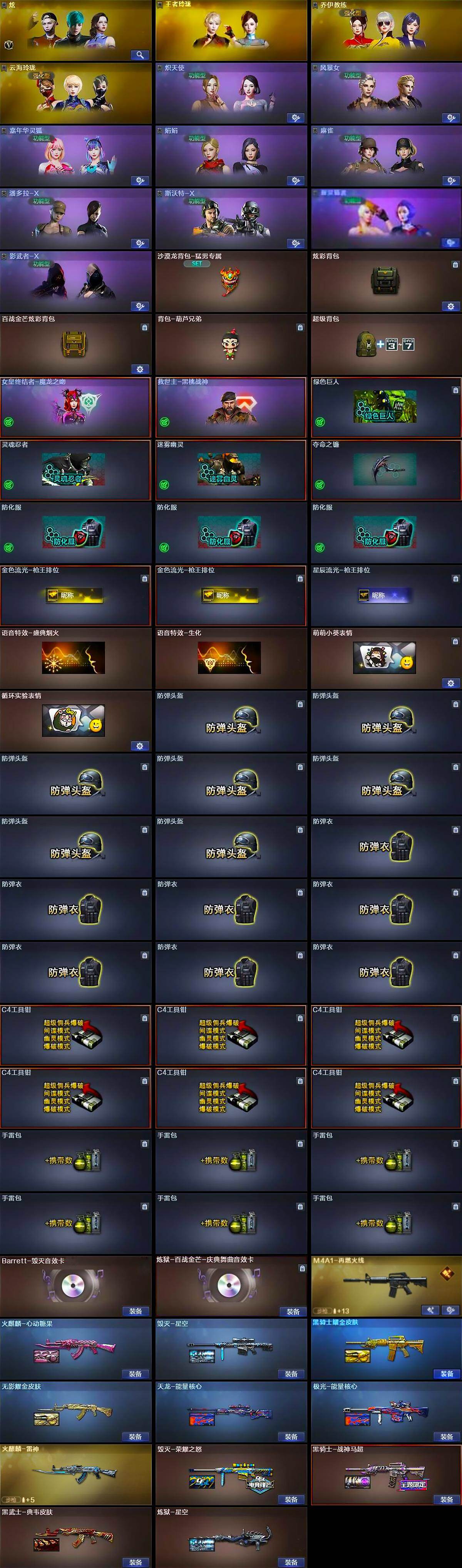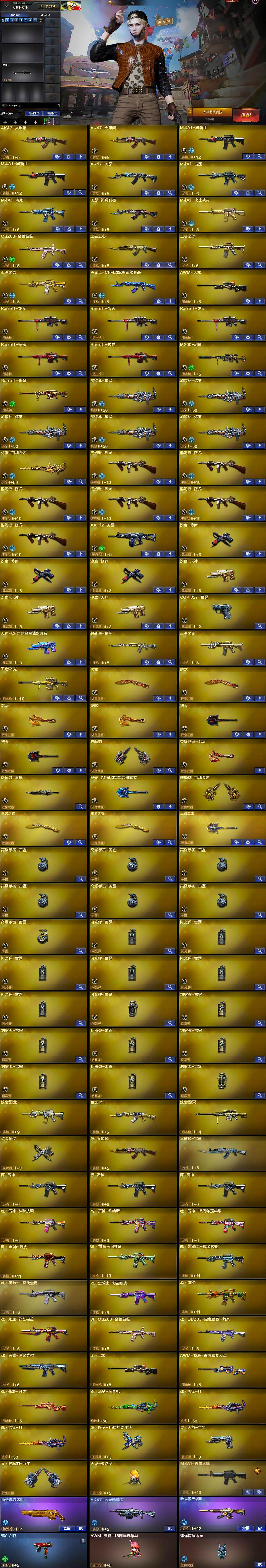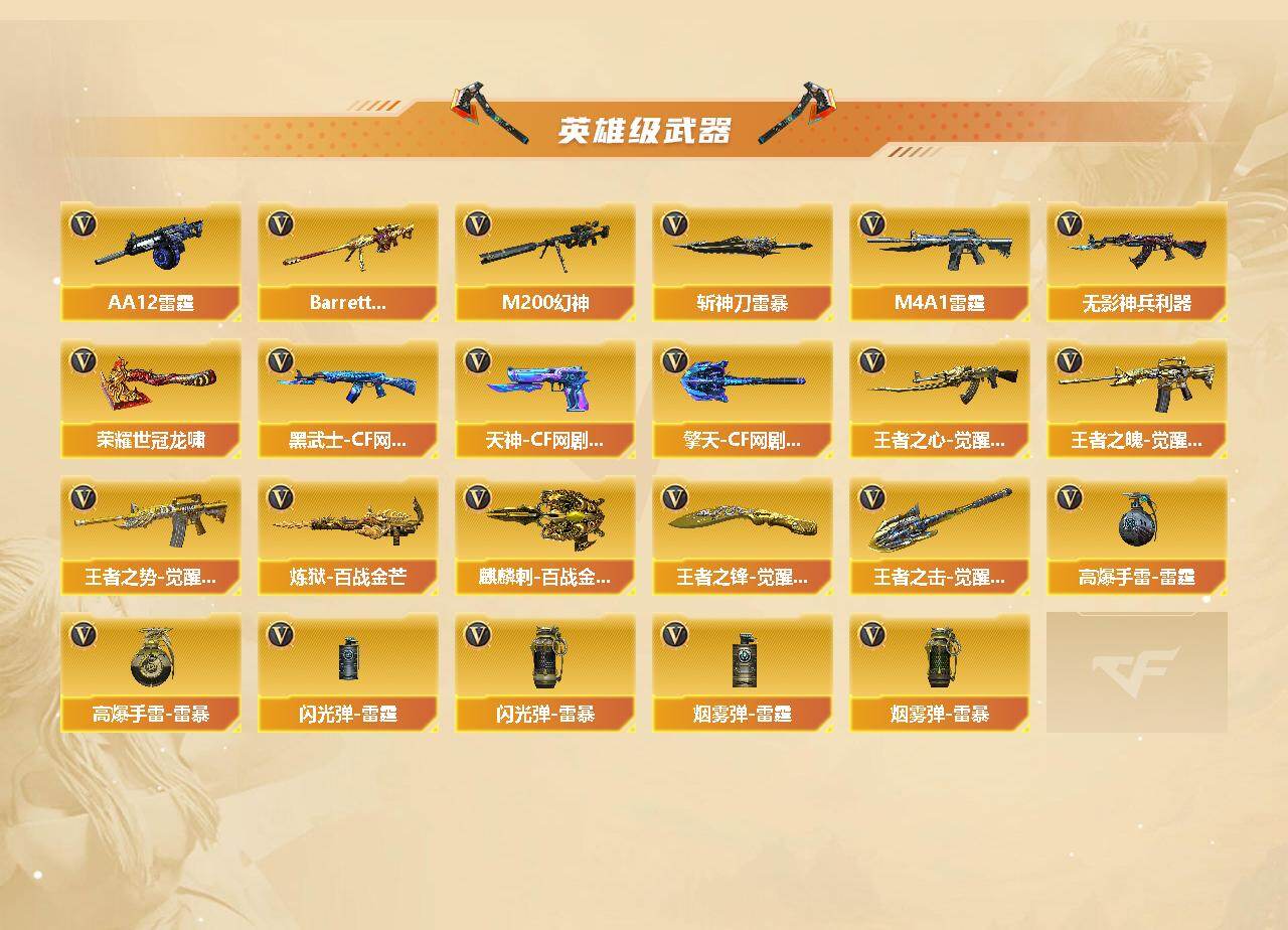 【英雄级武器】:AK47-火麒麟*2,M4A1-黑骑士*2,AK47-无影,M4A1-雷霆,M4A1-青龙,无影-神兵利器,M4A1-玫瑰精灵,QBZ03-金色蔷薇,王者之心-觉醒版,王者之魄-觉醒版,王者之势-觉醒版,黑武士-CF网剧冠军,AWM-天龙,Barrett-毁灭*3,Barrett-极光*2,M200-幻神,Barrett-朱雀,加特林-炼狱*5,炼狱-百战金芒,汤姆逊-烈龙*6,AA-12-雷霆,沙鹰-修罗*3,沙鹰-天神*3,COP-雷霆,天神-CF网剧冠军,屠龙*2,龙啸*2,擎天*2,麒麟刺,荣耀世冠-龙啸,斩神刀-雷暴,擎天-CF网剧冠军,麒麟刺-百战金芒,王者之锋-觉醒版*2,王者之击-觉醒版,高爆手雷-雷霆*6,高爆手雷-雷暴,闪光弹-雷霆*6,闪光弹-雷暴,烟雾弹-雷霆*6,烟雾弹-雷暴