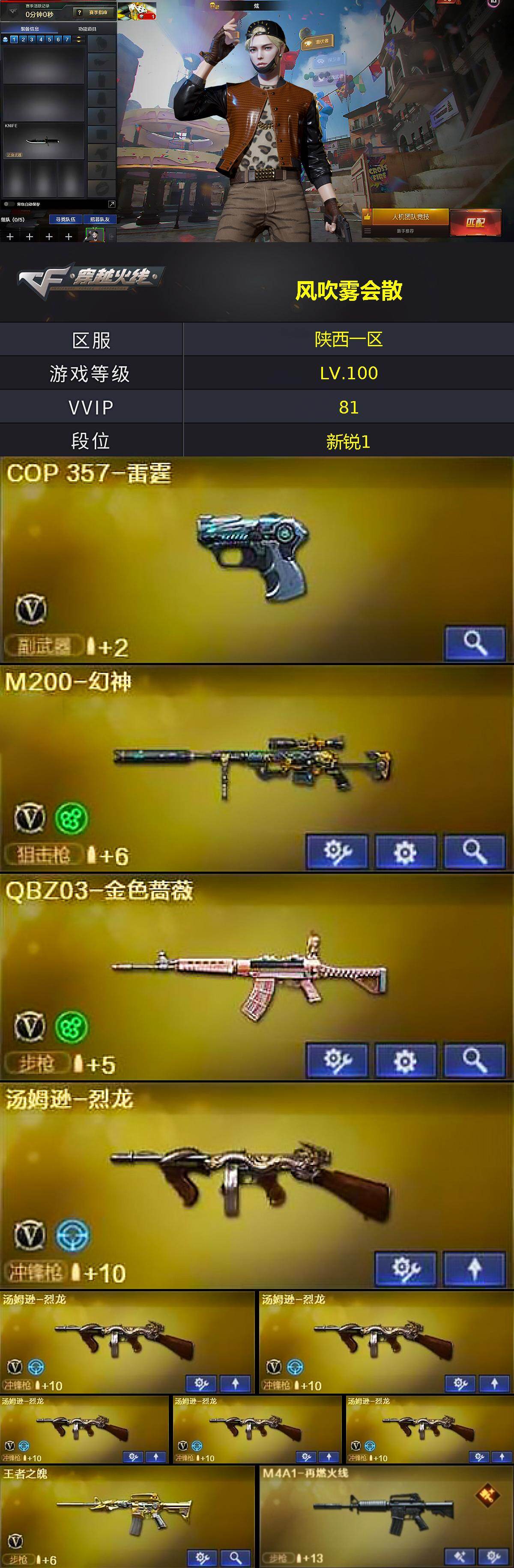 【热门武器】:QBZ03-金色蔷薇,M4A1-青龙,M200-幻神,死亡之眼,M4A1-黑骑士*2,汤姆逊-烈龙*6,加特林-炼狱*5,羊驼玩偶,沙鹰-修罗*3,荣耀世冠-龙啸