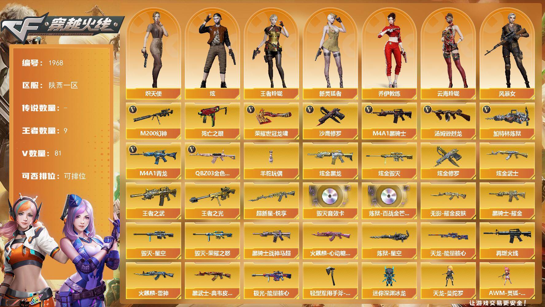 [16444625]陕西一区-87V-9王者武器数-4炫金武器数 【热门武器】:QBZ03-金色蔷薇,M4A1-青龙,M200-幻神,死亡之眼,M4A1-黑骑士*2,汤姆逊-烈龙*6,加特林-炼狱*5,羊驼玩偶,沙鹰-修罗*3,荣耀世冠-龙啸 【王者炫金武器】:超新星-悦享,王者之武,王者之光,炫金黑龙,炫金武士,炫金毁灭,炫金修罗 【音效卡】:Barrett-毁灭音效卡,炼狱-百战金芒-庆典舞曲音效卡 【皮肤】:M4A1-再燃火线,火麒麟-雷神,火麒麟-心动糖果,毁灭-荣耀之怒,毁灭-星空,黑骑士耀金皮肤,黑骑士-战神马超,无影耀金皮肤,黑武士-典韦皮肤,天龙-能量核心,极光-能量核心,炼狱-星空,轻型军用手斧-再燃火线 【角色】:炫,王者玲珑,乔伊教练,云海玲珑,炽天使,风暴女,嘉年华灵狐,娟娟,麻雀,潘多拉-X,斯沃特-X,新灵狐者,影武者-X 【人偶武器】:天龙-曼陀罗,AWM-灵狐-15周年嘉年华,迷你深渊冰龙 【暴走生化】:死亡之眼 【挑战大师】:神圣爆裂者III,AK47-冰龙粉碎者,激光毁灭者III 【英雄级武器】:AK47-火麒麟*2,M4A1-黑骑士*2,AK47-无影,M4A1-雷霆,M4A1-青龙,无影-神兵利器,M4A1-玫瑰精灵,QBZ03-金色蔷薇,王者之心-觉醒版,王者之魄-觉醒版,王者之势-觉醒版,黑武士-CF网剧冠军,AWM-天龙,Barrett-毁灭*3,Barrett-极光*2,M200-幻神,Barrett-朱雀,加特林-炼狱*5,炼狱-百战金芒,汤姆逊-烈龙*6,AA-12-雷霆,沙鹰-修罗*3,沙鹰-天神*3,COP-雷霆,天神-CF网剧冠军,屠龙*2,龙啸*2,擎天*2,麒麟刺,荣耀世冠-龙啸,斩神刀-雷暴,擎天-CF网剧冠军,麒麟刺-百战金芒,王者之锋-觉醒版*2,王者之击-觉醒版,高爆手雷-雷霆*6,高爆手雷-雷暴,闪光弹-雷霆*6,闪光弹-雷暴,烟雾弹-雷霆*6,烟雾弹-雷暴 【道具】:沙漠龙背包-猛男专属,炫彩背包,百战金芒炫彩背包,背包-葫芦兄弟,超级背包,女皇终结者-魔龙之吻,救世主-黑桃战神,绿色巨人,灵魂忍者,迷雾幽灵,夺命之镰,防化服*3,金色流光-枪王排位*2,星辰流光-枪王排位,语音特效-盛典烟火,语音特效-生化,萌萌小葵表情,循环实验表情,防弹头盔*7,防弹衣*7,C4工具钳*6,手雷包*6 【特殊枪械】:2黑骑