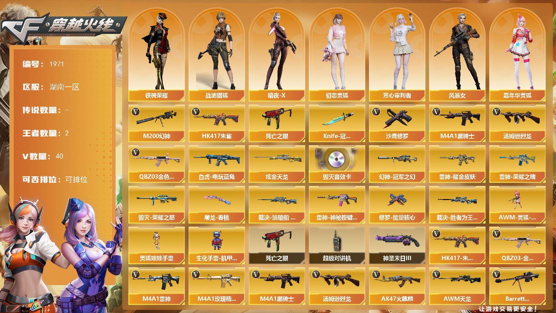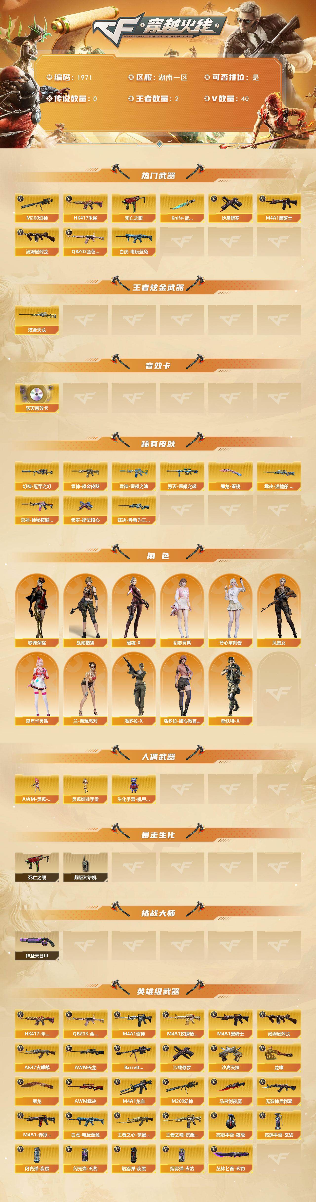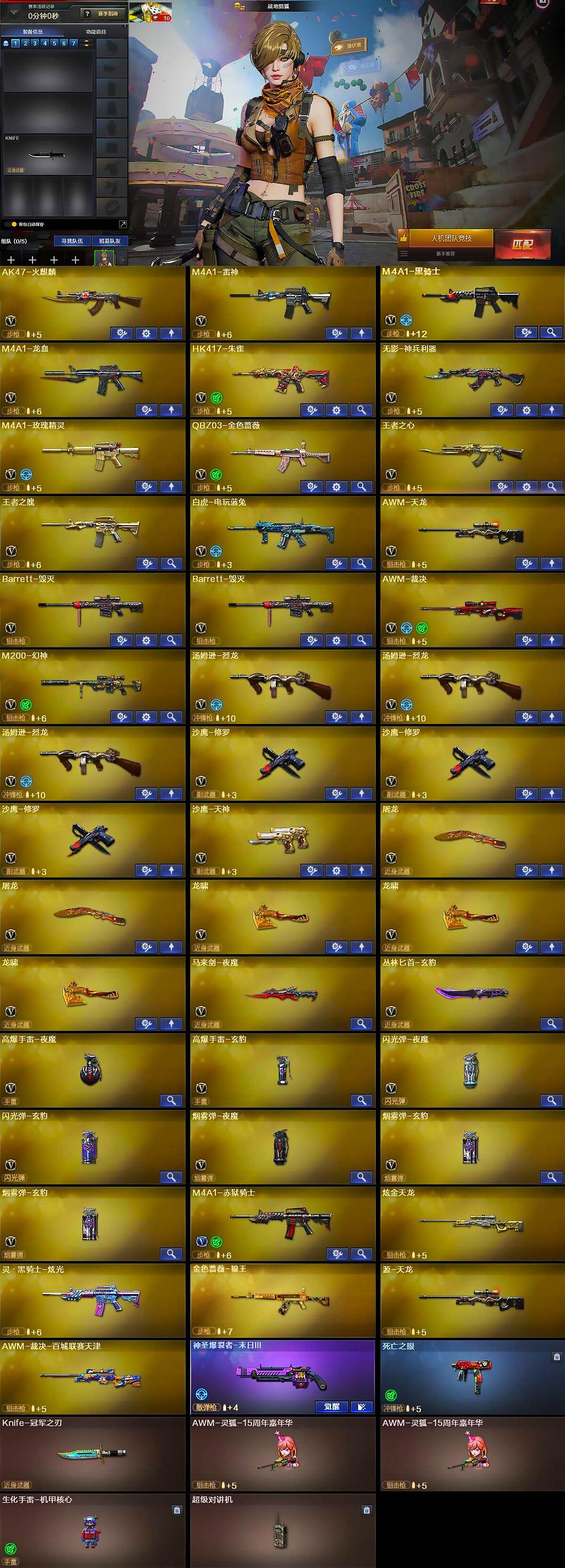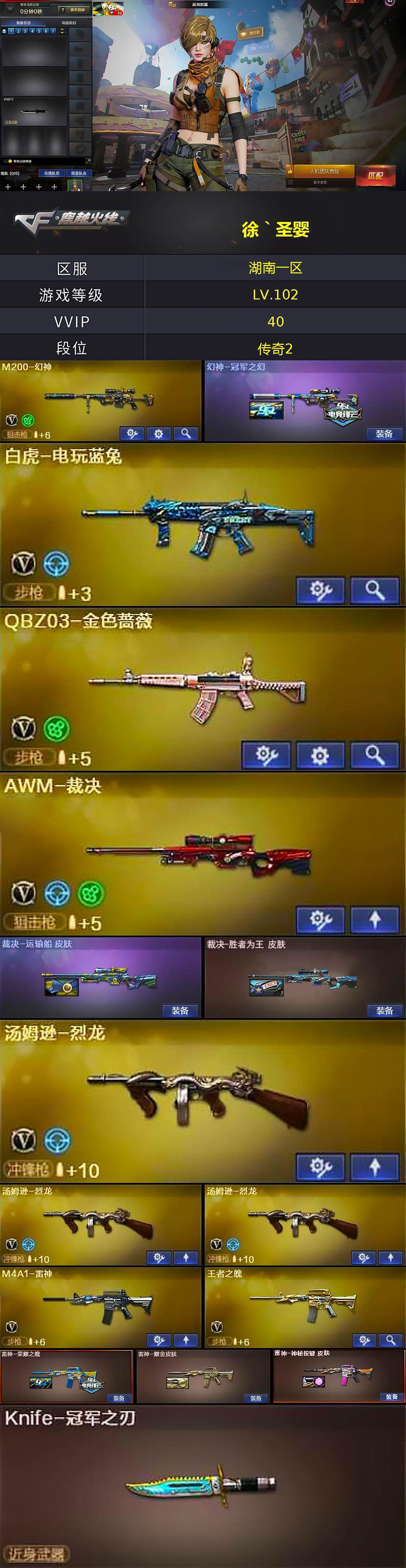 [16445281]湖南一区-42V-2王者武器数-1炫金武器数 【热门武器】:QBZ03-金色蔷薇,HK417-朱雀,M200-幻神,死亡之眼,白虎-电玩蓝兔,M4A1-黑骑士,汤姆逊-烈龙*3,沙鹰-修罗*3,Knife-冠军之刃 【王者炫金武器】:炫金天龙 【音效卡】:Barrett-毁灭音效卡 【皮肤】:幻神-冠军之幻,裁决-运输船 皮肤,裁决-胜者为王 皮肤,雷神-荣耀之魄,雷神-耀金皮肤,雷神-神秘按键 皮肤,毁灭-荣耀之怒,修罗-能量核心,屠龙-春桃 皮肤 【角色】:战地猎狐,暗夜-X,初恋灵狐,芳心审判者,风暴女,嘉年华灵狐,兰-海滩派对,潘多拉-X,潘多拉-甜心教官,斯沃特-X,铁骑荣耀 【人偶武器】:AWM-灵狐-15周年嘉年华*2,生化手雷-机甲核心,灵狐娃娃手雷 【暴走生化】:死亡之眼,超级对讲机 【挑战大师】:神圣爆裂者-末日III 【英雄级武器】:AK47-火麒麟,M4A1-雷神,M4A1-黑骑士,M4A1-龙血,HK417-朱雀,无影-神兵利器,M4A1-玫瑰精灵,QBZ03-金色蔷薇,王者之心-觉醒版,王者之魄-觉醒版,白虎-电玩蓝兔,AWM-天龙,Barrett-毁灭*2,AWM-裁决,M200-幻神,汤姆逊-烈龙*3,沙鹰-修罗*3,沙鹰-天神,屠龙*2,龙啸*3,马来剑-夜魔,丛林匕首-玄豹,高爆手雷-夜魔,高爆手雷-玄豹,闪光弹-夜魔,闪光弹-玄豹,烟雾弹-夜魔,烟雾弹-玄豹*2,M4A1-赤狱骑士 【道具】:云山科技背包,战舰背包,炫彩背包,背包-洛丽塔,虎牙炫彩背包,女皇终结者-魔龙之吻,救世主-黑桃战神,绿色巨人,夺命之镰,防化服*2,金色流光-枪王排位*2,语音特效-机器人,C4-再燃火线,防弹头盔*2,防弹衣*2,C4工具钳*2,手雷包*2 【特殊枪械】:1黑骑士,3烈龙