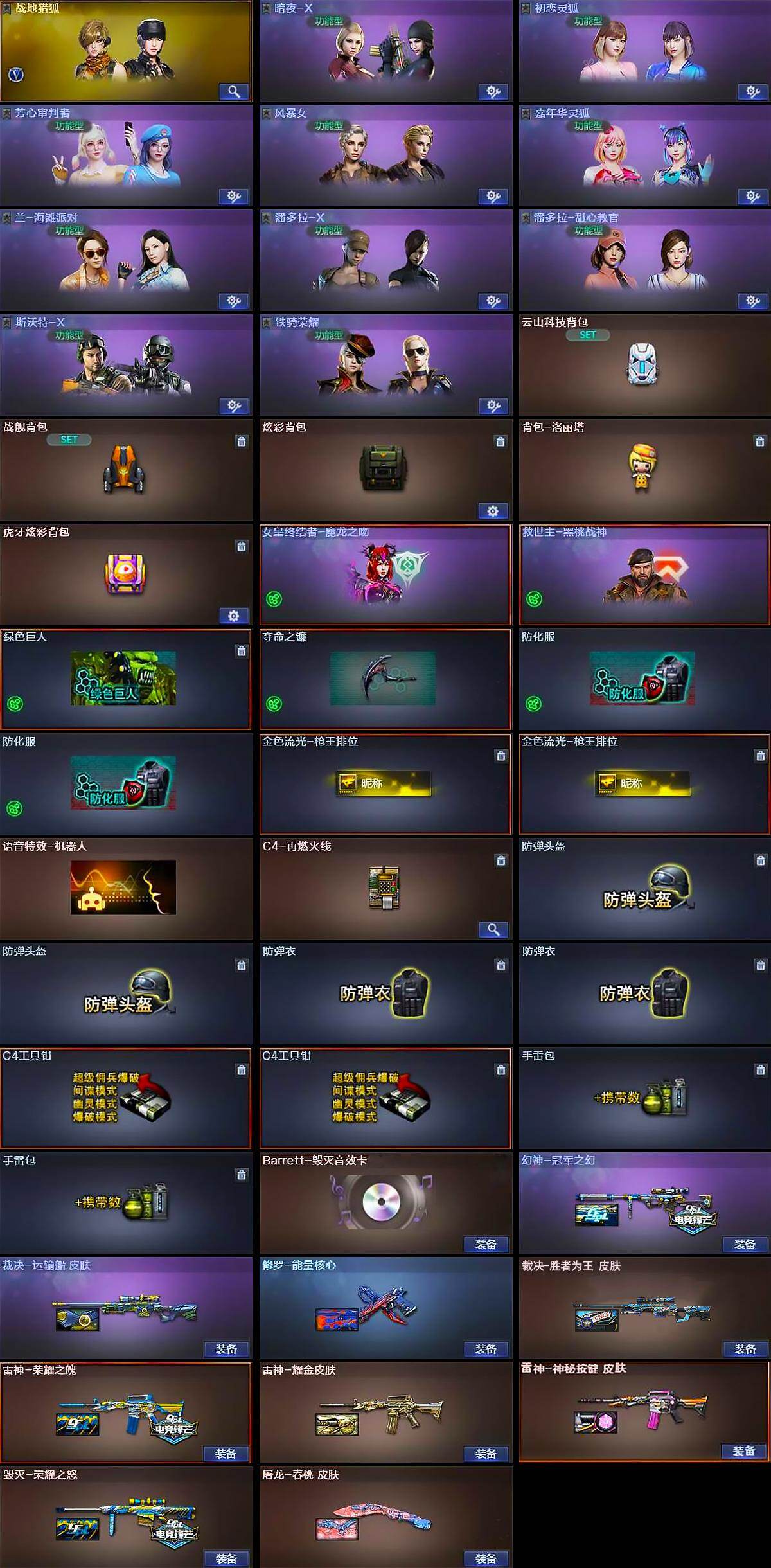 【道具】:云山科技背包,战舰背包,炫彩背包,背包-洛丽塔,虎牙炫彩背包,女皇终结者-魔龙之吻,救世主-黑桃战神,绿色巨人,夺命之镰,防化服*2,金色流光-枪王排位*2,语音特效-机器人,C4-再燃火线,防弹头盔*2,防弹衣*2,C4工具钳*2,手雷包*2