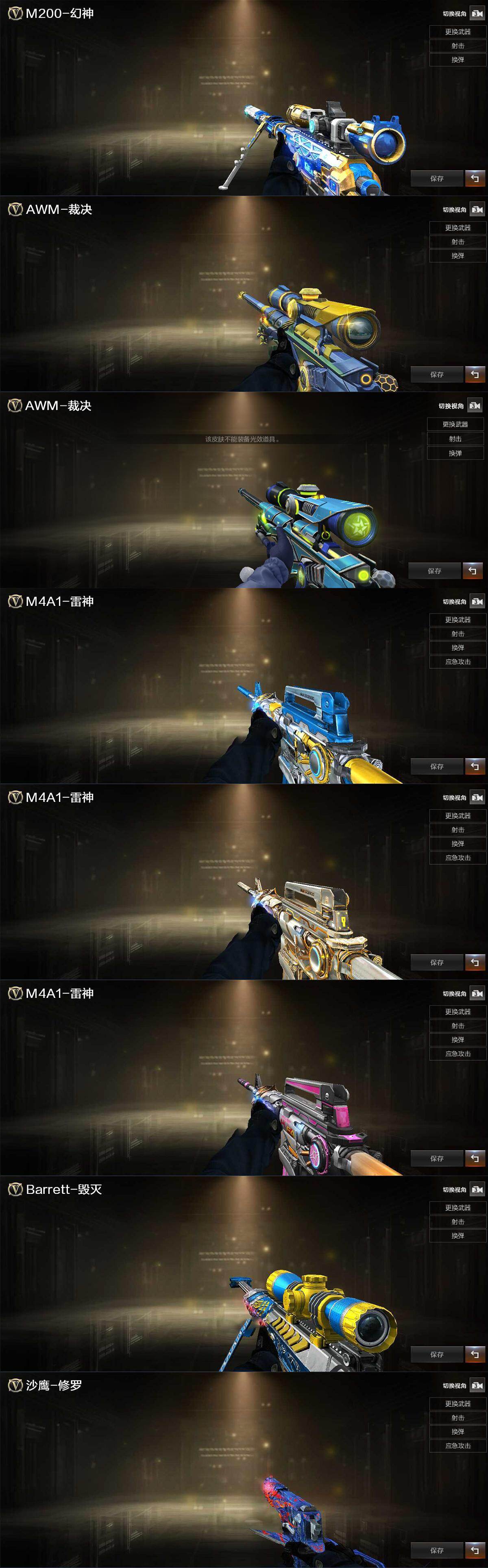 【热门武器】:QBZ03-金色蔷薇,HK417-朱雀,M200-幻神,死亡之眼,白虎-电玩蓝兔,M4A1-黑骑士,汤姆逊-烈龙*3,沙鹰-修罗*3,Knife-冠军之刃