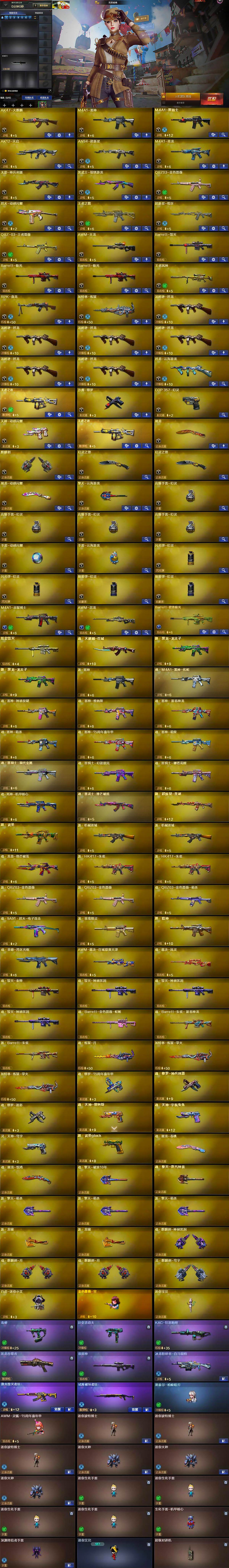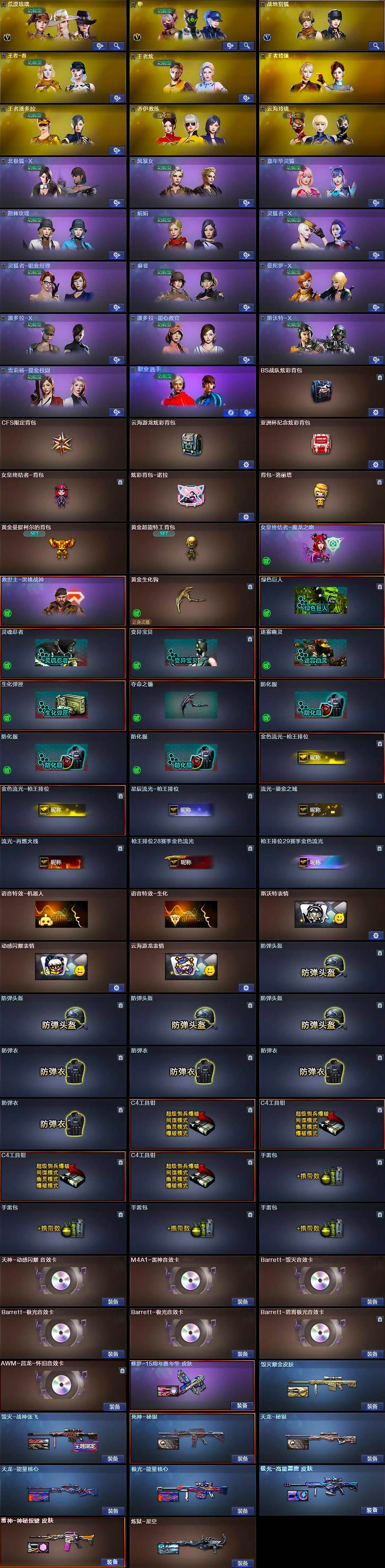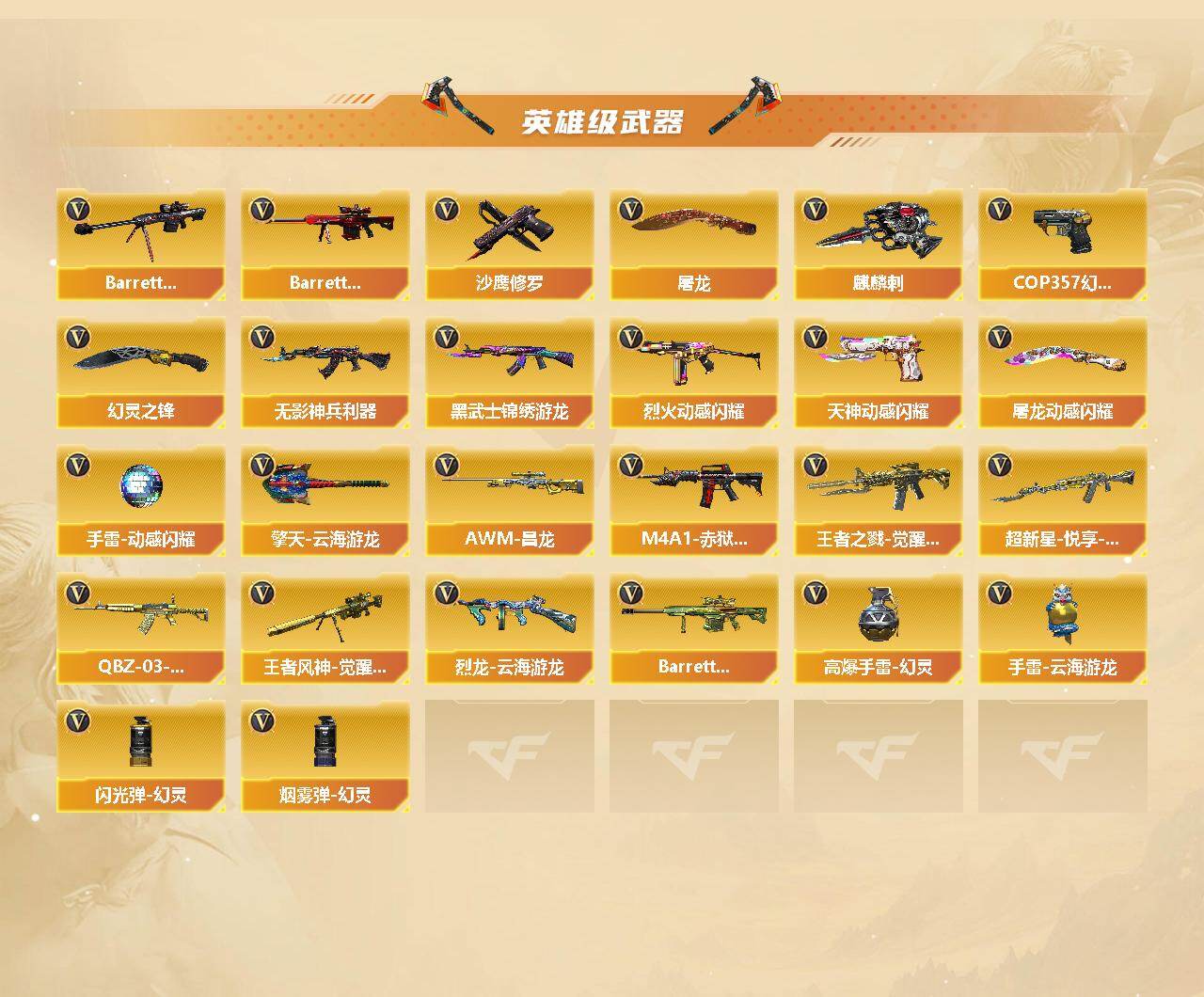 【英雄级武器】:AK47-火麒麟,M4A1-雷神,M4A1-黑骑士,AK12-天启,AN94-超新星,M4A1-青龙,无影-神兵利器,黑武士-锦绣游龙,QBZ03-金色蔷薇,烈火-动感闪耀,王者之戮-觉醒版,超新星-悦享-觉醒版,QBZ-03-王者蔷薇-觉醒版,AWM-天龙,Barrett-毁灭,Barrett-极光*2,王者风神-觉醒版,RPK-盘龙,加特林-炼狱,汤姆逊-烈龙*6,烈龙-云海游龙,王者之霆-觉醒版,沙鹰-修罗,COP 357-幻灵,天神-动感闪耀,屠龙,麒麟刺,幻灵之锋*2,屠龙-动感闪耀,擎天-云海游龙,高爆手雷-幻灵*4,手雷-动感闪耀,手雷-云海游龙,闪光弹-幻灵*2,烟雾弹-幻灵*2,M4A1-赤狱骑士,AWM-昌龙,Barrett-碧霄极光