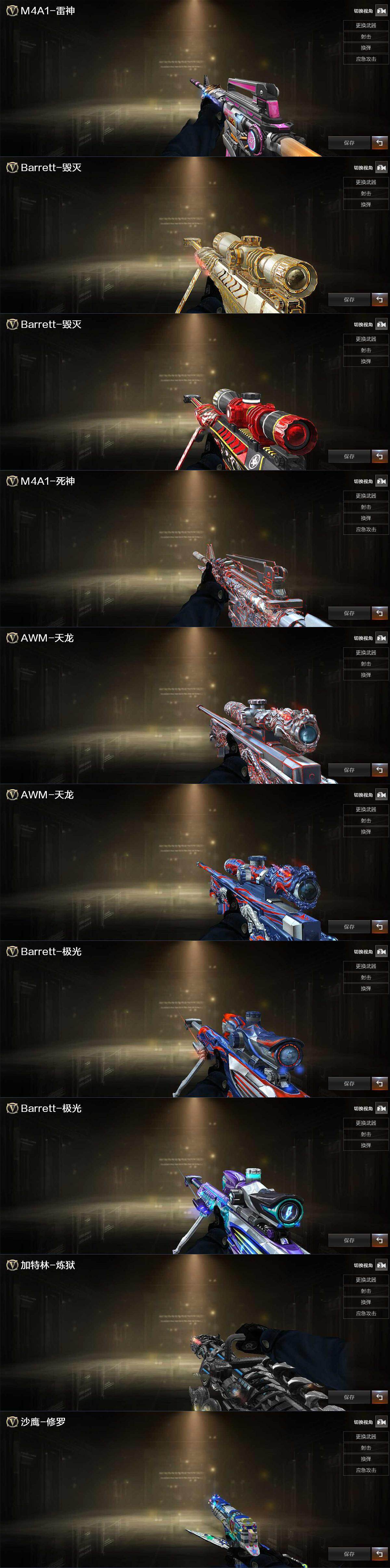 【音效卡】:天神-动感闪耀 音效卡,M4A1-雷神音效卡,Barrett-毁灭音效卡,Barrett-极光音效卡,Barrett-碧霄极光音效卡,AWM-昌龙-怀旧音效卡