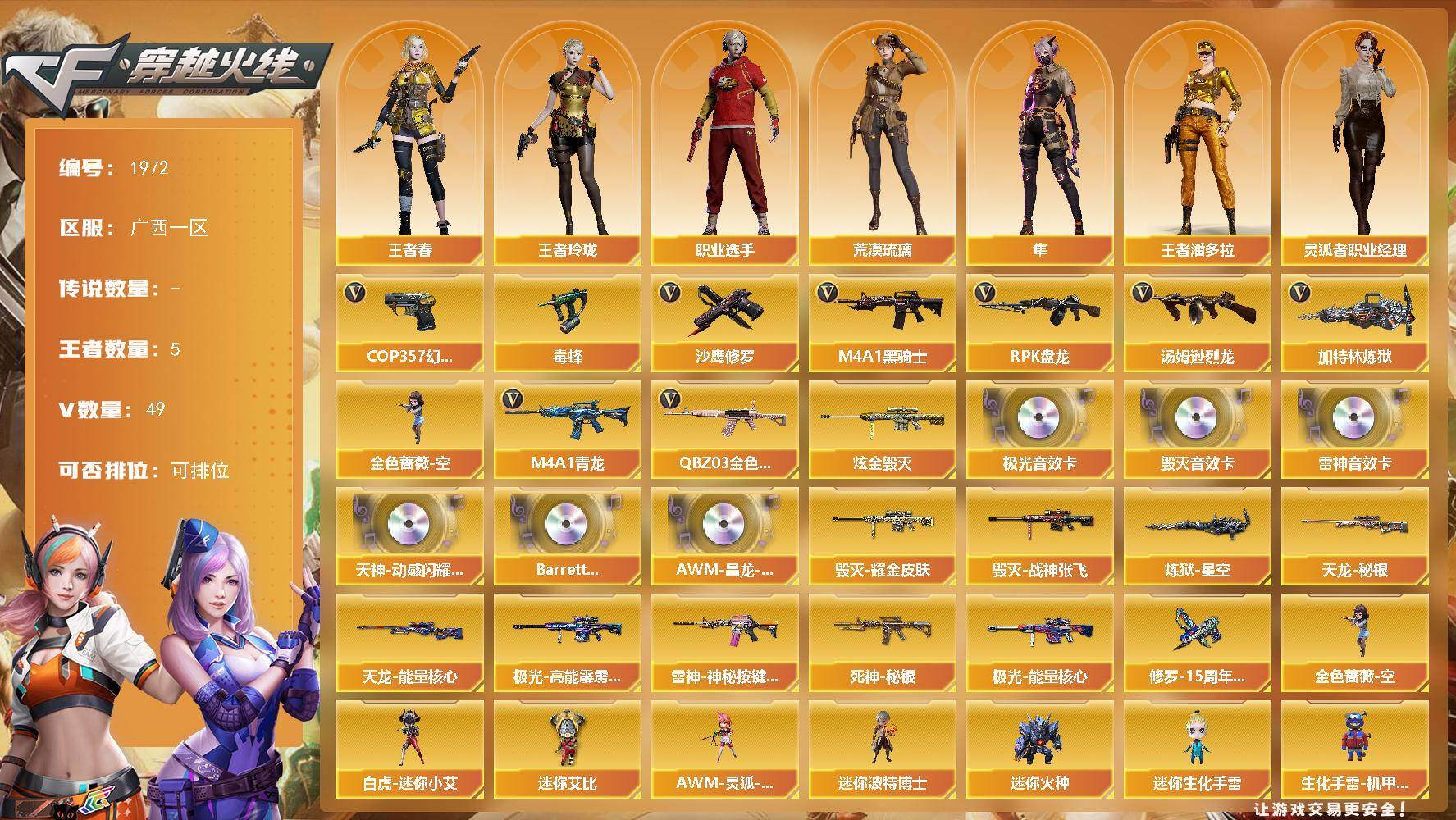 [16445505]广西一区-53V-5王者武器数-1炫金武器数 【热门武器】:QBZ03-金色蔷薇,M4A1-青龙,毒蜂,M4A1-黑骑士,汤姆逊-烈龙*6,RPK-盘龙,加特林-炼狱,金色蔷薇-空,COP 357-幻灵,沙鹰-修罗 【王者炫金武器】:炫金毁灭 【音效卡】:天神-动感闪耀 音效卡,M4A1-雷神音效卡,Barrett-毁灭音效卡,Barrett-极光音效卡,Barrett-碧霄极光音效卡,AWM-昌龙-怀旧音效卡 【皮肤】:雷神-神秘按键 皮肤,毁灭耀金皮肤,毁灭-战神张飞,死神-秘银,天龙-秘银,天龙-能量核心,极光-能量核心,极光-高能霹雳 皮肤,炼狱-星空,修罗-15周年嘉年华 皮肤 【角色】:荒漠琉璃,隼,战地猎狐,王者春,王者炫,王者玲珑,王者潘多拉,乔伊教练,云海玲珑,北极狐-X,风暴女,嘉年华灵狐,荆棘玫瑰,娟娟,兰-新年限定,灵狐者-X,灵狐者-职业经理,麻雀,曼陀罗-X,潘多拉-X,潘多拉-甜心教官,斯沃特-X,雪莉杨-摸金校尉,职业选手 【人偶武器】:白虎-迷你小艾,金色蔷薇-空,迷你宝贝,斯泰尔-枪娘暗刃,AWM-灵狐-15周年嘉年华,迷你波特博士*3,迷你火种*3,迷你生化手雷*4,生化手雷-机甲核心,深渊终结者手雷,迷你艾比 【暴走生化】:毒蜂,异变清道夫,KAC-狂怒咆哮,黑龙吞噬者,双面神,超级对讲机 【挑战大师】:冰龙粉碎者-白马银枪,激光毁灭者III,试炼破坏者III 【英雄级武器】:AK47-火麒麟,M4A1-雷神,M4A1-黑骑士,AK12-天启,AN94-超新星,M4A1-青龙,无影-神兵利器,黑武士-锦绣游龙,QBZ03-金色蔷薇,烈火-动感闪耀,王者之戮-觉醒版,超新星-悦享-觉醒版,QBZ-03-王者蔷薇-觉醒版,AWM-天龙,Barrett-毁灭,Barrett-极光*2,王者风神-觉醒版,RPK-盘龙,加特林-炼狱,汤姆逊-烈龙*6,烈龙-云海游龙,王者之霆-觉醒版,沙鹰-修罗,COP 357-幻灵,天神-动感闪耀,屠龙,麒麟刺,幻灵之锋*2,屠龙-动感闪耀,擎天-云海游龙,高爆手雷-幻灵*4,手雷-动感闪耀,手雷-云海游龙,闪光弹-幻灵*2,烟雾弹-幻灵*2,M4A1-赤狱骑士,AWM-昌龙,Barrett-碧霄极光 【道具】:BS战队炫彩背包,CFS限定背包,云海游龙炫彩背包,亚洲杯纪念炫彩背包,女皇终结者-背包