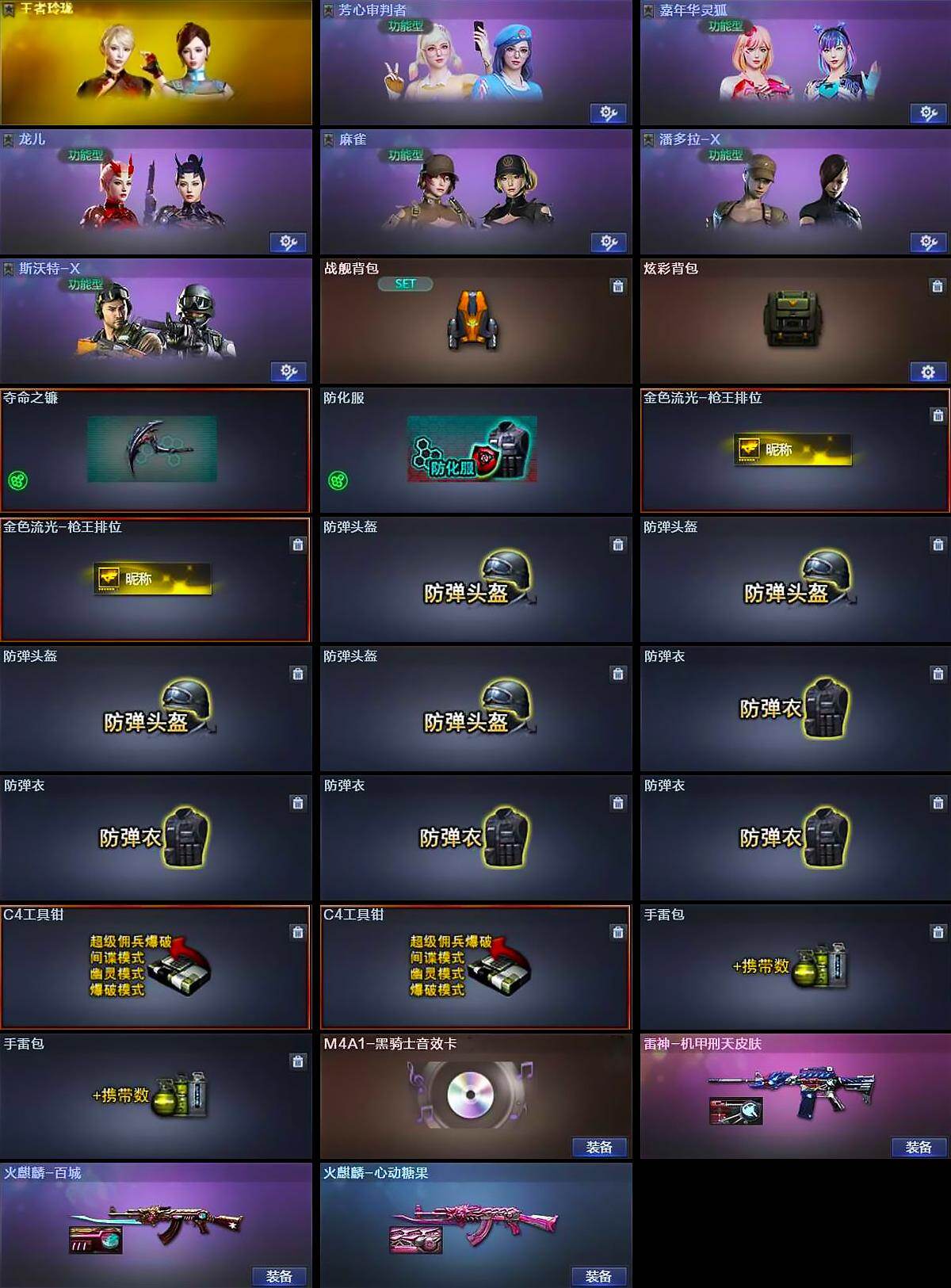 【道具】:战舰背包,炫彩背包,夺命之镰,防化服,金色流光-枪王排位*2,防弹头盔*4,防弹衣*4,C4工具钳*2,手雷包*2
