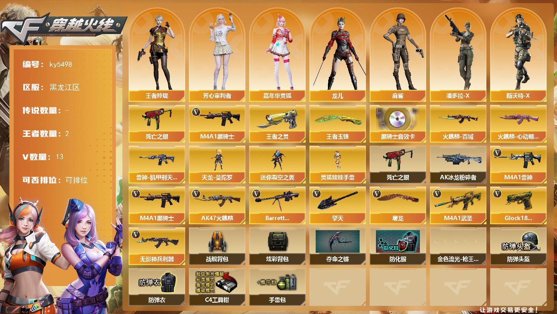 [16445994]黑龙江区-13V-2王者武器数-0炫金武器数 【热门武器】:死亡之眼,M4A1-黑骑士 【王者炫金武器】:王者之灵,王者玉锋 【音效卡】:M4A1-黑骑士音效卡 【皮肤】:雷神-机甲刑天皮肤,火麒麟-百城,火麒麟-心动糖果 【角色】:王者玲珑,芳心审判者,嘉年华灵狐,龙儿,麻雀,潘多拉-X,斯沃特-X 【人偶武器】:天龙-曼陀罗*2,迷你裂空之翼,灵狐娃娃手雷 【暴走生化】:死亡之眼 【挑战大师】:AK47-冰龙粉碎者 【英雄级武器】:AK47-火麒麟*2,M4A1-雷神,M4A1-黑骑士,M4A1-武圣,无影-神兵利器,Barrett-毁灭,Glock18-武圣,屠龙,擎天*2 【道具】:战舰背包,炫彩背包,夺命之镰,防化服,金色流光-枪王排位*2,防弹头盔*4,防弹衣*4,C4工具钳*2,手雷包*2 【特殊枪械】:1黑骑士