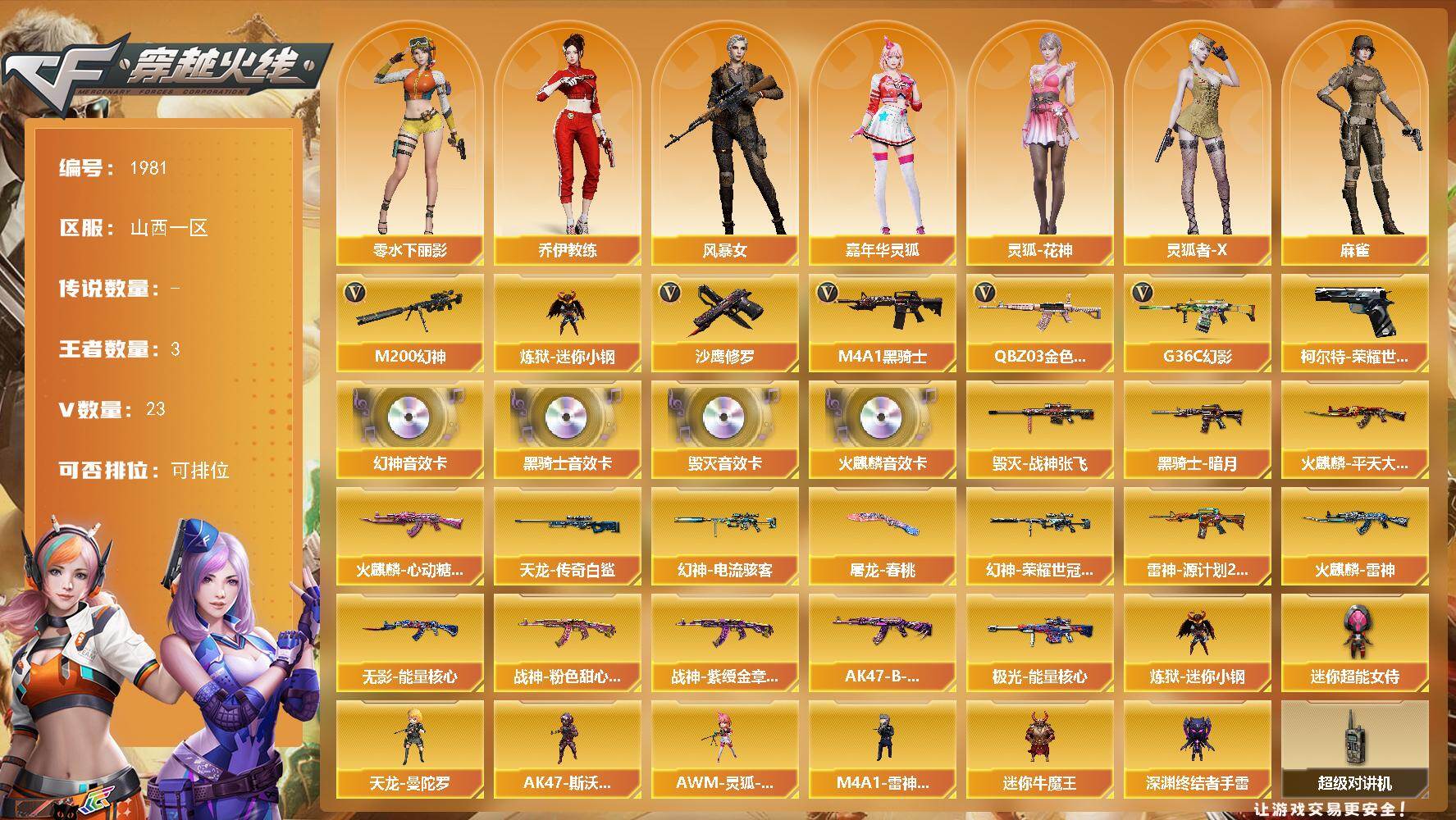 [16446742]山西一区-23V-3王者武器数-0炫金武器数 【热门武器】:G36C-幻影,QBZ03-金色蔷薇,M200-幻神,柯尔特-荣耀世冠白鲨2023*2,炼狱-迷你小钢,M4A1-黑骑士,沙鹰-修罗*2 【音效卡】:M200-幻神音效卡,AK47-火麒麟音效卡,M4A1-黑骑士音效卡,Barrett-毁灭音效卡 【皮肤】:幻神-电流骇客 皮肤,幻神-荣耀世冠白鲨2023 皮肤,雷神-源计划2.0专属 皮肤,火麒麟-雷神,火麒麟-平天大圣,火麒麟-心动糖果,毁灭-战神张飞,黑骑士-暗月,无影-能量核心,战神-粉色甜心皮肤,战神-紫绶金章皮肤,AK47-B-常胜将军-曹操,AWM-天龙-传奇白鲨,极光-能量核心,屠龙-春桃 皮肤 【角色】:乔伊教练,风暴女,嘉年华灵狐,零-水下丽影,灵狐-花神,灵狐者-X,麻雀,玫瑰花神,潘多拉-X,潜龙队-X,蛇姬,斯沃特-X,新娜塔莎 【人偶武器】:天龙-曼陀罗,M4A1-雷神-精英刀锋,炼狱-迷你小钢,AWM-灵狐-15周年嘉年华,迷你牛魔王,深渊终结者手雷,AK47-斯沃特,迷你超能女侍 【暴走生化】:超级对讲机 【挑战大师】:神圣爆裂者-末日III 【英雄级武器】:AK47-火麒麟*2,M4A1-雷神,M4A1-黑骑士,无影-神兵利器,G36C-幻影,QBZ03-金色蔷薇,AK-47-猩红传说,黑骑士-海王*2,Barrett-毁灭,M200-幻神,沙鹰-修罗*2,沙鹰-天神,柯尔特-荣耀世冠白鲨2023*2,屠龙*2,龙啸,麒麟刺,手雷-动感闪耀 【道具】:全能枪王背包,背包-葫芦兄弟,超级背包,绿色巨人,灵魂忍者*2,变异宝贝,妖姬,迷雾幽灵,夺命之镰,防化服*2,金色流光-枪王排位*2,星辰流光-枪王排位,枪王排位29赛季金色流光,电玩兔兔表情,C4-沙漠,防弹头盔*6,防弹衣*5,C4工具钳*4,手雷包*3 【特殊枪械】:1黑骑士