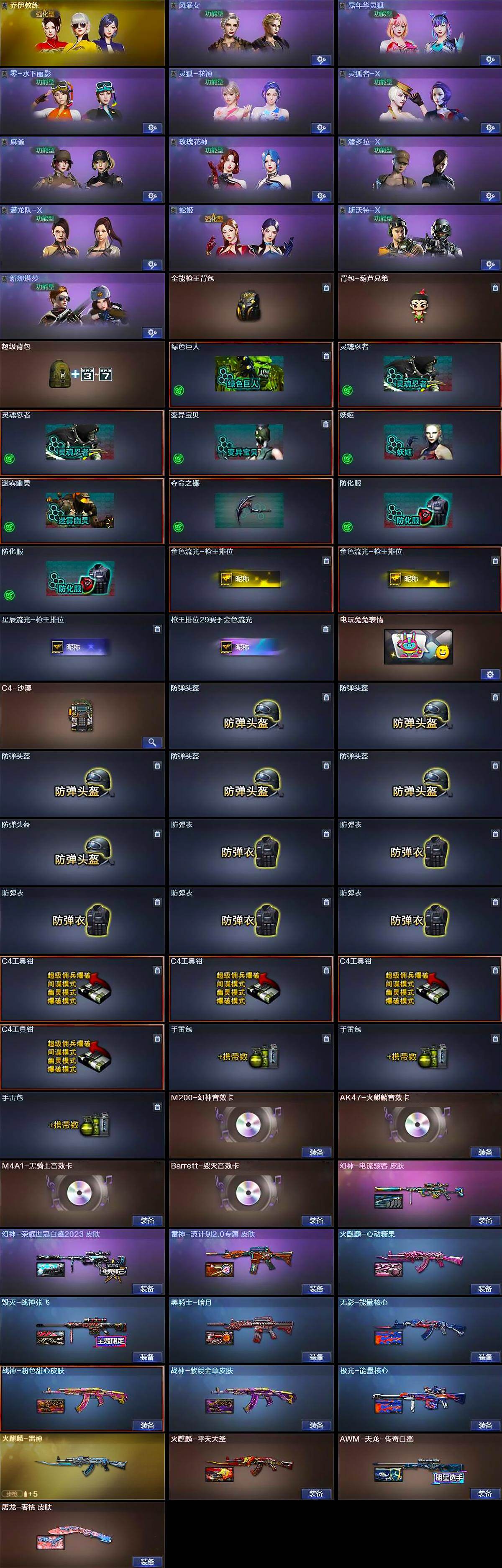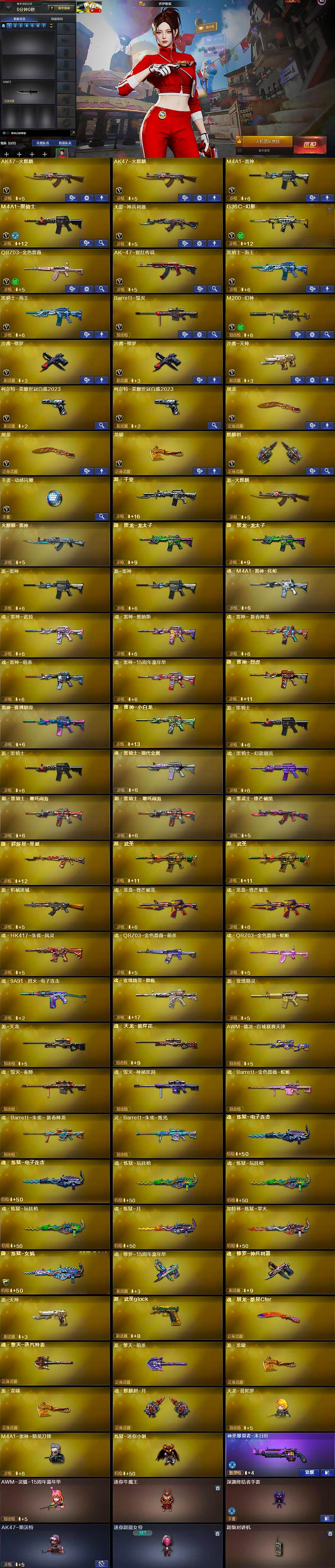 【英雄级武器】:AK47-火麒麟*2,M4A1-雷神,M4A1-黑骑士,无影-神兵利器,G36C-幻影,QBZ03-金色蔷薇,AK-47-猩红传说,黑骑士-海王*2,Barrett-毁灭,M200-幻神,沙鹰-修罗*2,沙鹰-天神,柯尔特-荣耀世冠白鲨2023*2,屠龙*2,龙啸,麒麟刺,手雷-动感闪耀