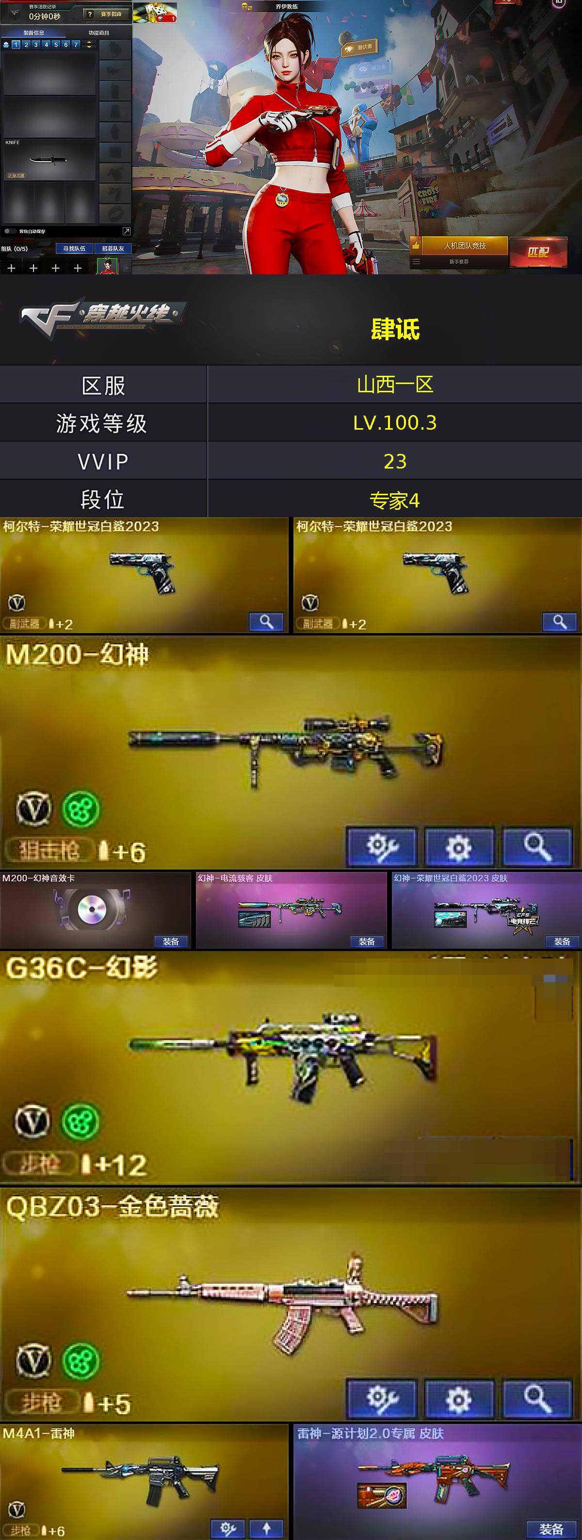 【热门武器】:G36C-幻影,QBZ03-金色蔷薇,M200-幻神,柯尔特-荣耀世冠白鲨2023*2,炼狱-迷你小钢,M4A1-黑骑士,沙鹰-修罗*2