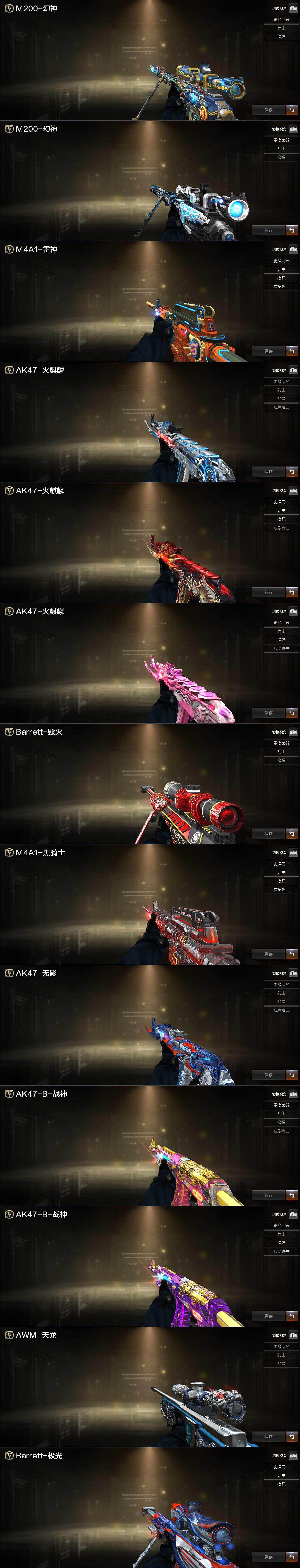 【音效卡】:M200-幻神音效卡,AK47-火麒麟音效卡,M4A1-黑骑士音效卡,Barrett-毁灭音效卡