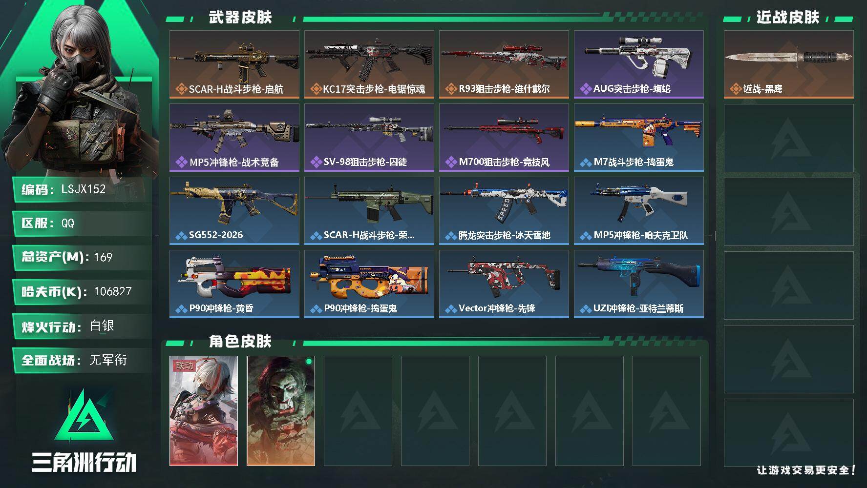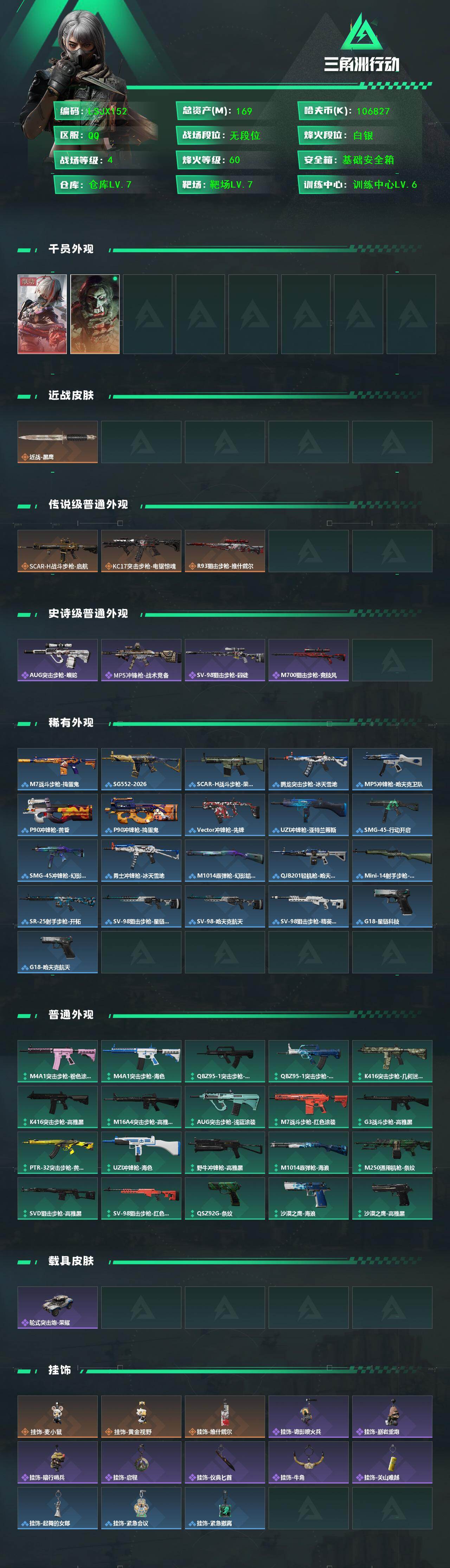 [16446916]【特价出售/店主推荐】169m总资产-106827k哈伏币-60烽火等级-白银-4战场等级-无军衔 【干员外观】:骇爪-维什戴尔,红狼-电锯惊魂 【近战皮肤】:近战-黑鹰 【传说外观】:SCAR-H战斗步枪-启航,KC17突击步枪-电锯惊魂,R93狙击步枪-维什戴尔 【史诗外观】:AUG突击步枪-蝮蛇,MP5冲锋枪-战术竞备,SV-98狙击步枪-囚徒,M700狙击步枪-竞技风 【稀有外观】:M7战斗步枪-捣蛋鬼,SG552突击步枪-2026,SCAR-H战斗步枪-荣耀列队,腾龙突击步枪-冰天雪地,MP5冲锋枪-哈夫克卫队,P90冲锋枪-黄昏,P90冲锋枪-捣蛋鬼,Vector冲锋枪-先锋,UZI冲锋枪-亚特兰蒂斯,SMG-45-行动开启,SMG-45冲锋枪-幻影结构,勇士冲锋枪-冰天雪地,M1014霰弹枪-幻影结构,QJB201轻机枪-哈夫克卫队,Mini-14射手步枪-荣耀列队,SR-25射手步枪-开拓,SV-98狙击步枪-星链科技,SV-98狙击步枪-哈夫克航天,SV-98狙击步枪-精英联盟,G18-星链科技,G18-哈夫克航天 【普通外观】:M4A1突击步枪-粉色涂装,M4A1突击步枪-海色,QBZ95-1突击步枪-高雅黑,QBZ95-1突击步枪-海浪,QBZ95-1突击步枪-2026,K416突击步枪-几何迷彩,K416突击步枪-高雅黑,M16A4突击步枪-高雅黑,AUG突击步枪-浅蓝涂装,M7战斗步枪-红色涂装,G3战斗步枪-高雅黑,PTR-32突击步枪-黄蜂,UZI冲锋枪-海色,野牛冲锋枪-高雅黑,M1014霰弹枪-海浪,M250通用机枪-条纹,SVD狙击步枪-高雅黑,SV-98狙击步枪-红色涂装,QSZ92G-条纹,沙漠之鹰-海浪,沙漠之鹰-高雅黑,G17-2026 【载具外观】:轮式突击炮-荣耀 【挂饰】:挂饰-麦小鼠,挂饰-黄金视野,挂饰-维什戴尔,挂饰-诡影喷火兵,挂饰-崩岩重炮*4,挂饰-暗行哨兵*4,挂饰-启程,挂饰-仪典匕首,挂饰-牛角,挂饰-关山难越,挂饰-起舞的女郎,挂饰-紧急会议*9,挂饰-紧急撤离*21