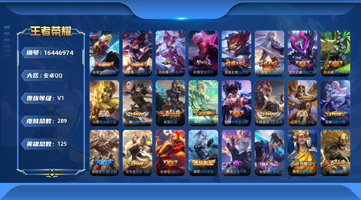 [16446974]【特价出售/店主推荐/3111星币可兑换星元皮肤】:安卓Q-V8-最强王者段位-125英雄-289皮肤-2典藏皮肤-2星元-17传说-90史诗 【荣耀典藏】:孙悟空全息碎影,孙尚香杀手不太冷 【传说皮肤】:后羿神树通天,桑启鸣野蒿,虞姬启明星使,孙悟空零号赤焰,关羽武圣,曜云鹰飞将,貂蝉猫影幻舞,干将莫邪久胜战神,达摩黄金狮子座,百里玄策白虎志,花木兰冠军飞将,后羿黄金射手座,貂蝉仲夏夜之梦,李白凤求凰,孙尚香末日机甲,宫本武藏地狱之眼,孙悟空地狱火 【限定皮肤】:蒙犽顽岩魄,姜子牙天穹之誓,狄仁杰阴阳师,赵云皇家上将,赵云龙胆,墨子神迹守卫,嬴政优雅恋人,鲁班七号狮舞东方,庄周高山流水,阿轲迷踪丽影,芈月白晶晶,吕布猎兽之王,周瑜赤莲之焰,元歌云间偶戏,夏侯惇朔风刀,典韦蓝屏警告,马可波罗暗影游猎,狄仁杰魔术师,狄仁杰万华元夜,达摩沙漠行僧,项羽海滩派对,老夫子醍醐杖,老夫子航海奇遇记,关羽冰锋战神,关羽武圣,程咬金演武夺筹,露娜一生所爱,刘邦夺宝奇兵,韩信逐梦之影,韩信飞衡,兰陵王驯魔猎人,兰陵王金庭之子,亚瑟潮玩骑士王,孙悟空至尊宝,孙悟空大圣娶亲,孙悟空零号赤焰,牛魔御旌,后羿如梦令,张飞虎魄,李元芳银河之约,李元芳云中旅人,虞姬霸王别姬,虞姬启明星使,钟馗神迹守卫,钟馗驱傩正仪,女娲朔望之晖,雅典娜单词大作战,蔡文姬奇迹圣诞,蔡文姬繁星吟游,东皇太一逐梦之光,鬼谷子原初探秘者,鬼谷子五谷丰年,黄忠烈魂,苏烈千军破阵,百里玄策白虎志,弈星混沌棋,梦奇顽趣,沈梦溪星空之诺,沈梦溪大漠名商,明世隐疑决卦,裴擒虎天狼狩猎者,裴擒虎李小龙,裴擒虎擒涛扼浪,瑶山海碧波行,云中君纤云弄巧,盾山御銮,猪八戒西部大镖客,上官婉儿梁祝,嫦娥拒霜思,蒙犽狂想玩偶喵,鲁班大师探海日志,桑启海盐诗旅,艾琳女武神,阿古朵江河有灵,张良古海寻踪,蒙犽百解令,蒙恬荣光圣徽,鬼谷子天穹祈灯,姬小满妄想食味,沈梦溪龙舞盛年,刘邦剑破天穹,程咬金群星魔术团,周瑜熔金海岸 【年限皮肤】:百里玄策白虎志,李白凤求凰,韩信飞衡,马超神威,关羽武圣,黄忠烈魂,张飞虎魄,赵云龙胆,瑶山海碧波行 【赛季限定】:夏侯惇朔风刀,狄仁杰万华元夜,达摩沙漠行僧,老夫子醍醐杖,程咬金演武夺筹,兰陵王金庭之子,张良古海寻踪,牛魔御旌,李元芳云中旅人,钟馗驱傩正仪,鬼谷子原初探秘者,苏烈千军破阵,弈星混沌棋,梦奇顽趣
