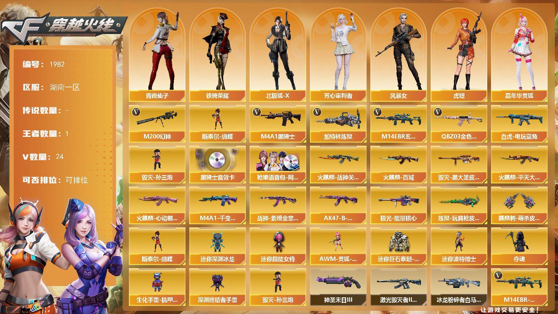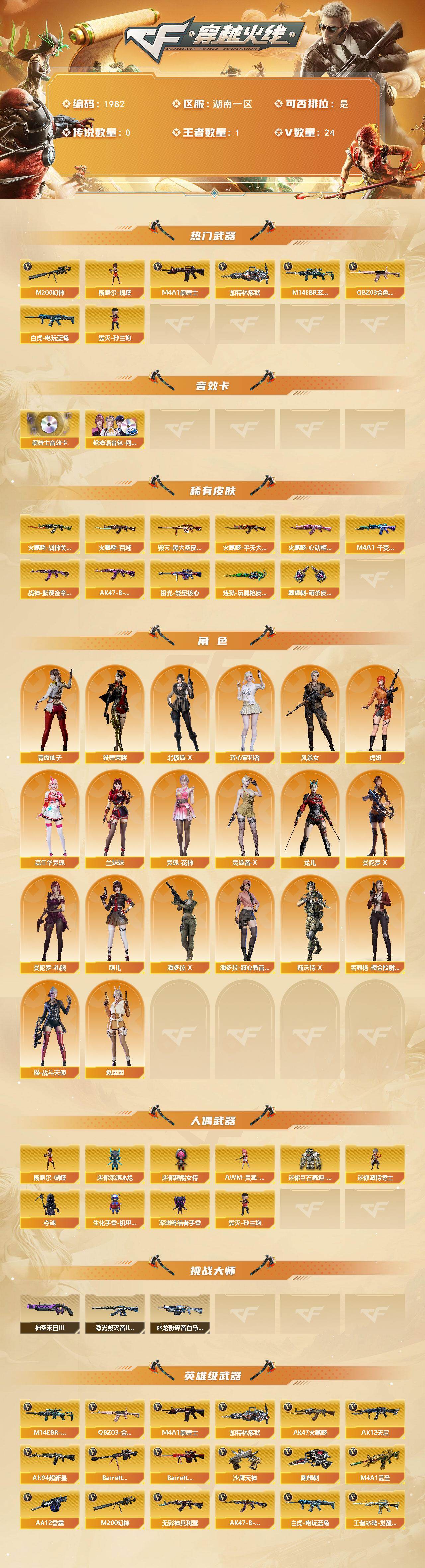 [16447044]湖南一区-25V-1王者武器数-0炫金武器数 【热门武器】:QBZ03-金色蔷薇,M14EBR-玄武,M200-幻神,白虎-电玩蓝兔,M4A1-黑骑士,加特林-炼狱*2,斯泰尔-蝴蝶,毁灭-孙三炮 【音效卡】:M4A1-黑骑士音效卡,枪娘语音包-阿敏 【皮肤】:火麒麟-战神关羽,火麒麟-平天大圣,火麒麟-百城,火麒麟-心动糖果,毁灭-黑大圣皮肤*3,M4A1-千变-孔明皮肤,战神-紫绶金章皮肤,AK47-B-常胜将军-曹操,极光-能量核心,炼狱-玩具枪皮肤,麒麟刺-萌杀皮肤 【角色】:北极狐-X,芳心审判者,风暴女,虎妞,嘉年华灵狐,兰妹妹,灵狐-花神,灵狐者-X,龙儿,曼陀罗-X,曼陀罗-礼服,萌儿,潘多拉-X,潘多拉-甜心教官,青霞仙子,斯沃特-X,铁骑荣耀,兔囡囡,雪莉杨-摸金校尉,樱-战斗天使 【人偶武器】:毁灭-孙三炮,斯泰尔-蝴蝶,AWM-灵狐-15周年嘉年华,迷你深渊冰龙,迷你波特博士,夺魂,生化手雷-机甲核心,深渊终结者手雷*2,迷你超能女侍,迷你巨石泰坦-魔花研究所 【挑战大师】:冰龙粉碎者-白马银枪,激光毁灭者III-白马银枪,神圣爆裂者-末日III 【英雄级武器】:AK47-火麒麟*2,M4A1-黑骑士,AK12-天启,AN94-超新星,M4A1-武圣,M14EBR-玄武,无影-神兵利器,QBZ03-金色蔷薇,AK47-B-战神,王者冰魄-觉醒版,白虎-电玩蓝兔,Barrett-毁灭,Barrett-极光,M200-幻神,加特林-炼狱*2,AA-12-雷霆,沙鹰-天神*2,麒麟刺 【道具】:全能枪王背包,炫彩背包,超级背包,夺命之镰,防化服,金色流光-枪王排位,星辰流光-枪王排位,枪王排位28赛季金色流光,电玩兔兔表情,EP战队名片,防弹头盔*4,防弹衣*4,C4工具钳*3,手雷包*2 【特殊枪械】:蝴蝶斯泰尔+0烈龙,1黑骑士,2炼狱,1蝴蝶斯泰尔