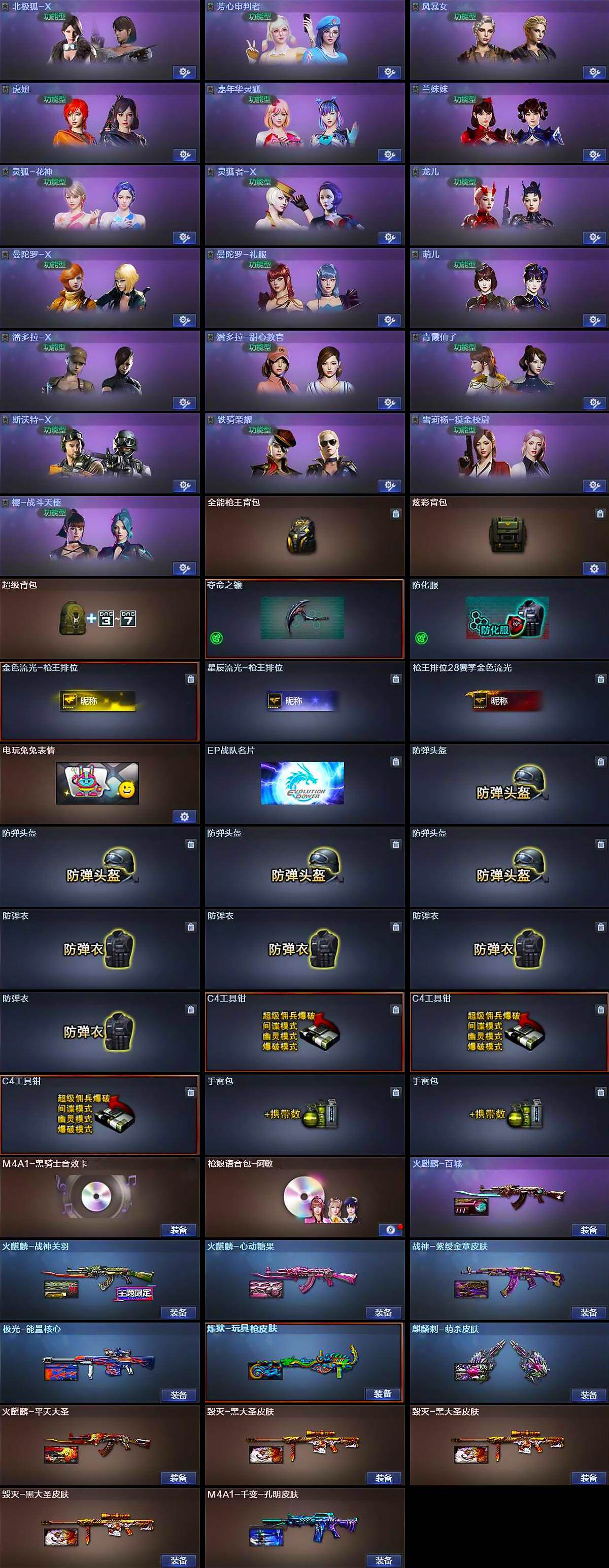 【道具】:全能枪王背包,炫彩背包,超级背包,夺命之镰,防化服,金色流光-枪王排位,星辰流光-枪王排位,枪王排位28赛季金色流光,电玩兔兔表情,EP战队名片,防弹头盔*4,防弹衣*4,C4工具钳*3,手雷包*2